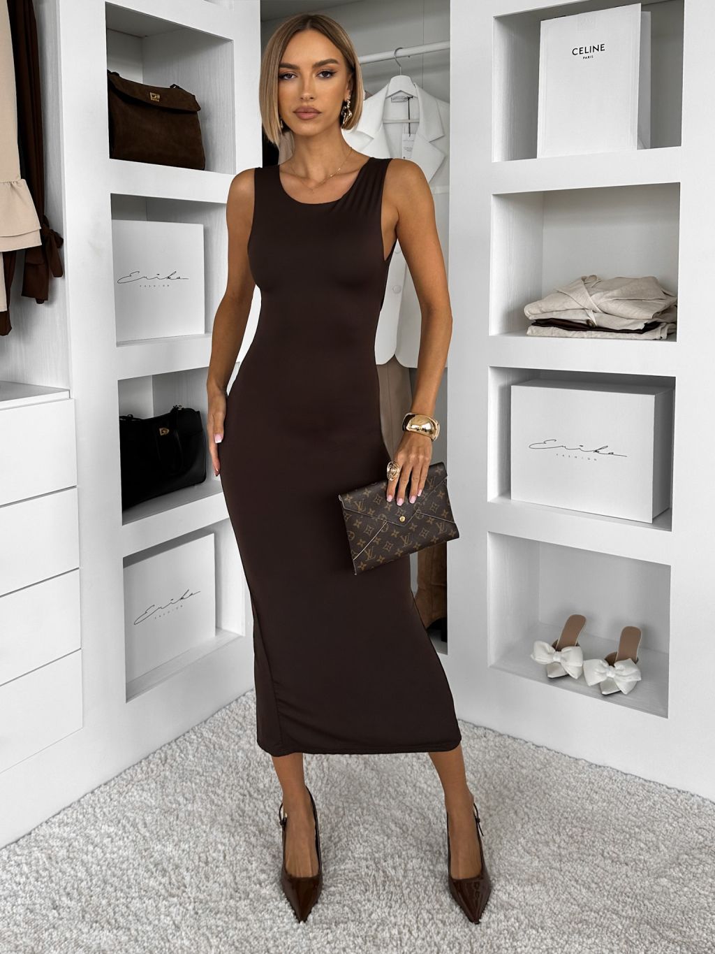 Tmavo hnedé priliehavé midi šaty TREVY s rázporkom