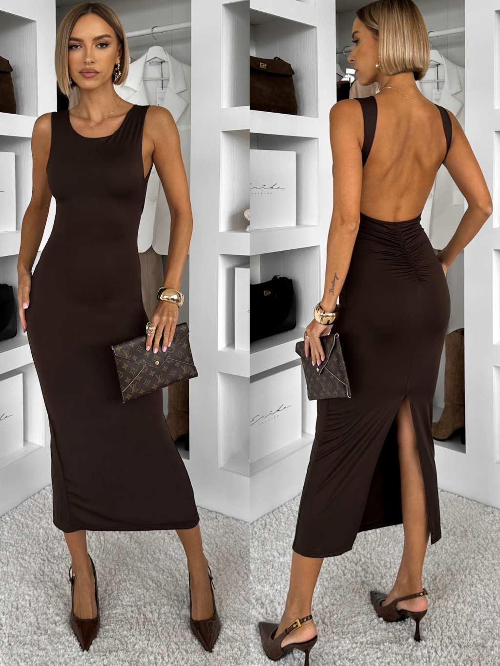 Tmavo hnedé priliehavé midi šaty TREVY s rázporkom