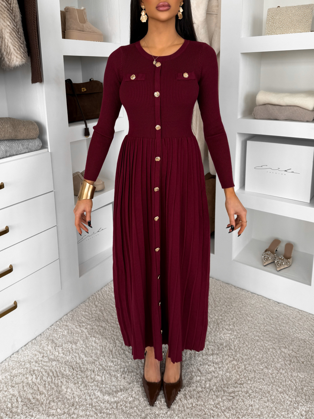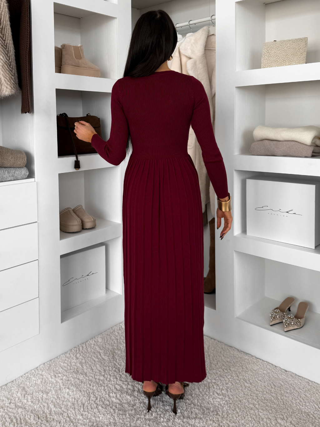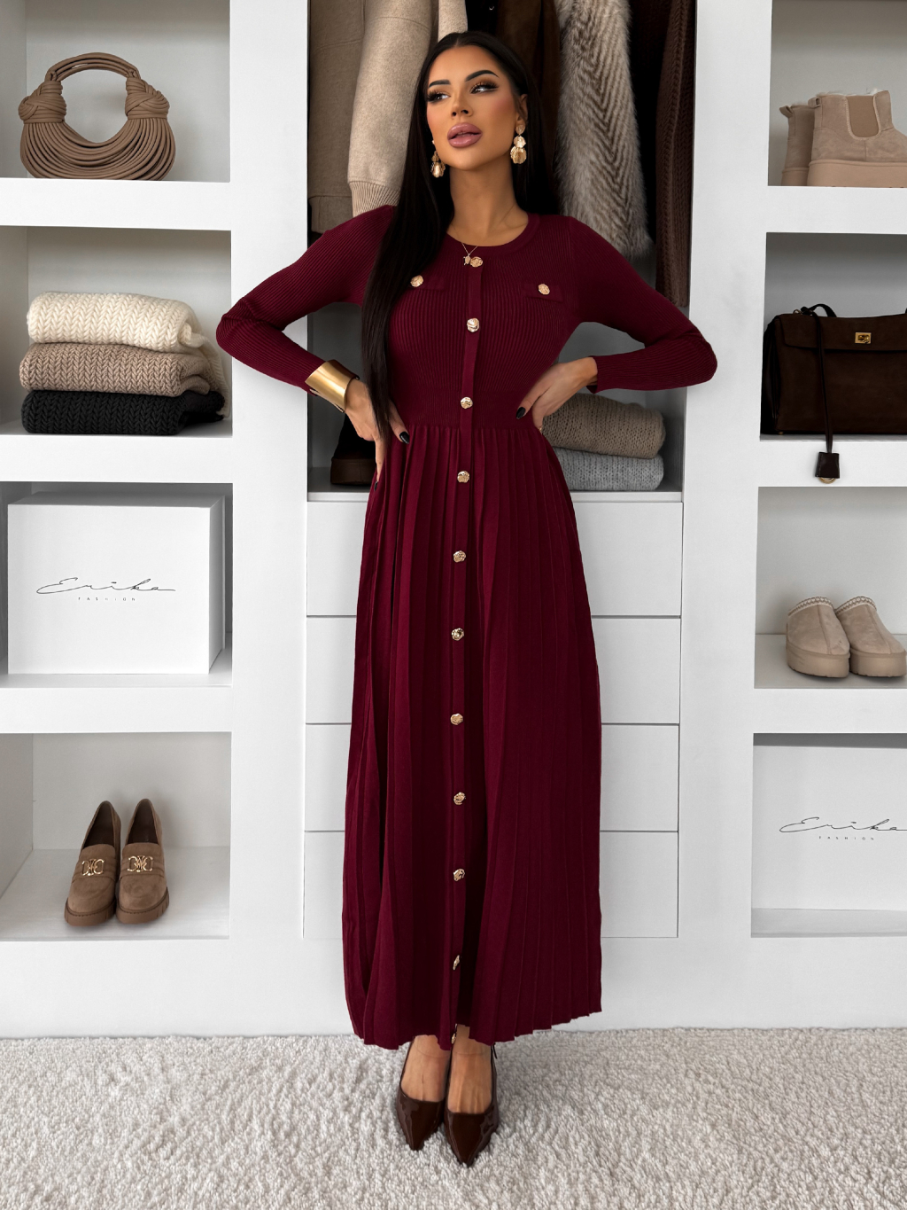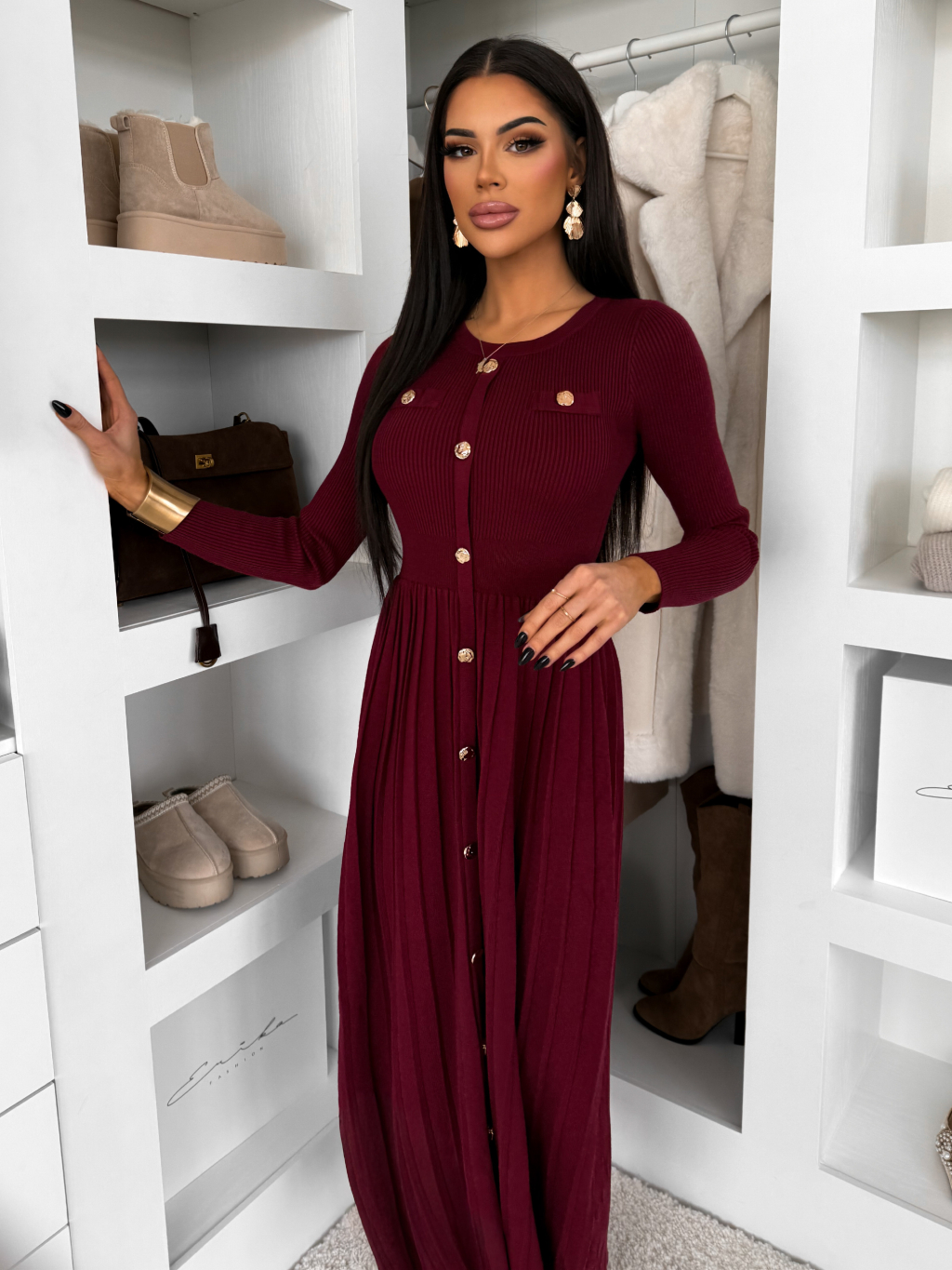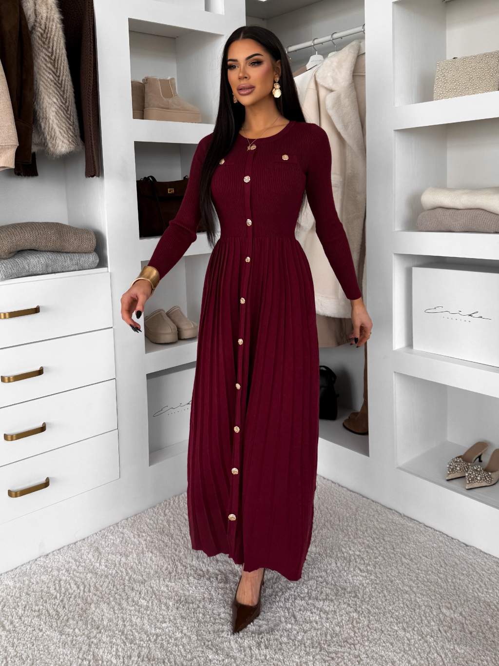 Vínové dlhé svetrové šaty TYMORAE s dlhým rukávom
