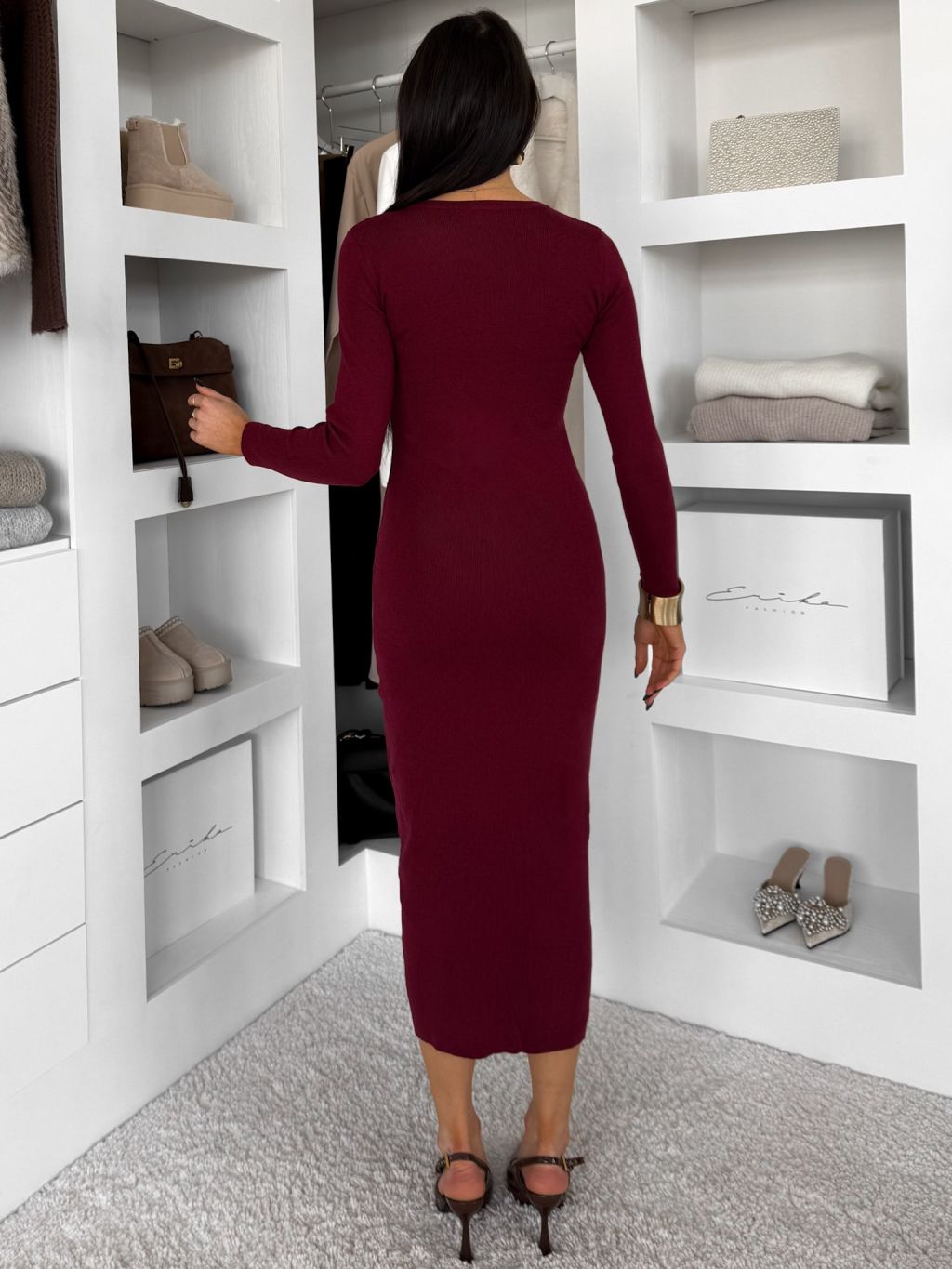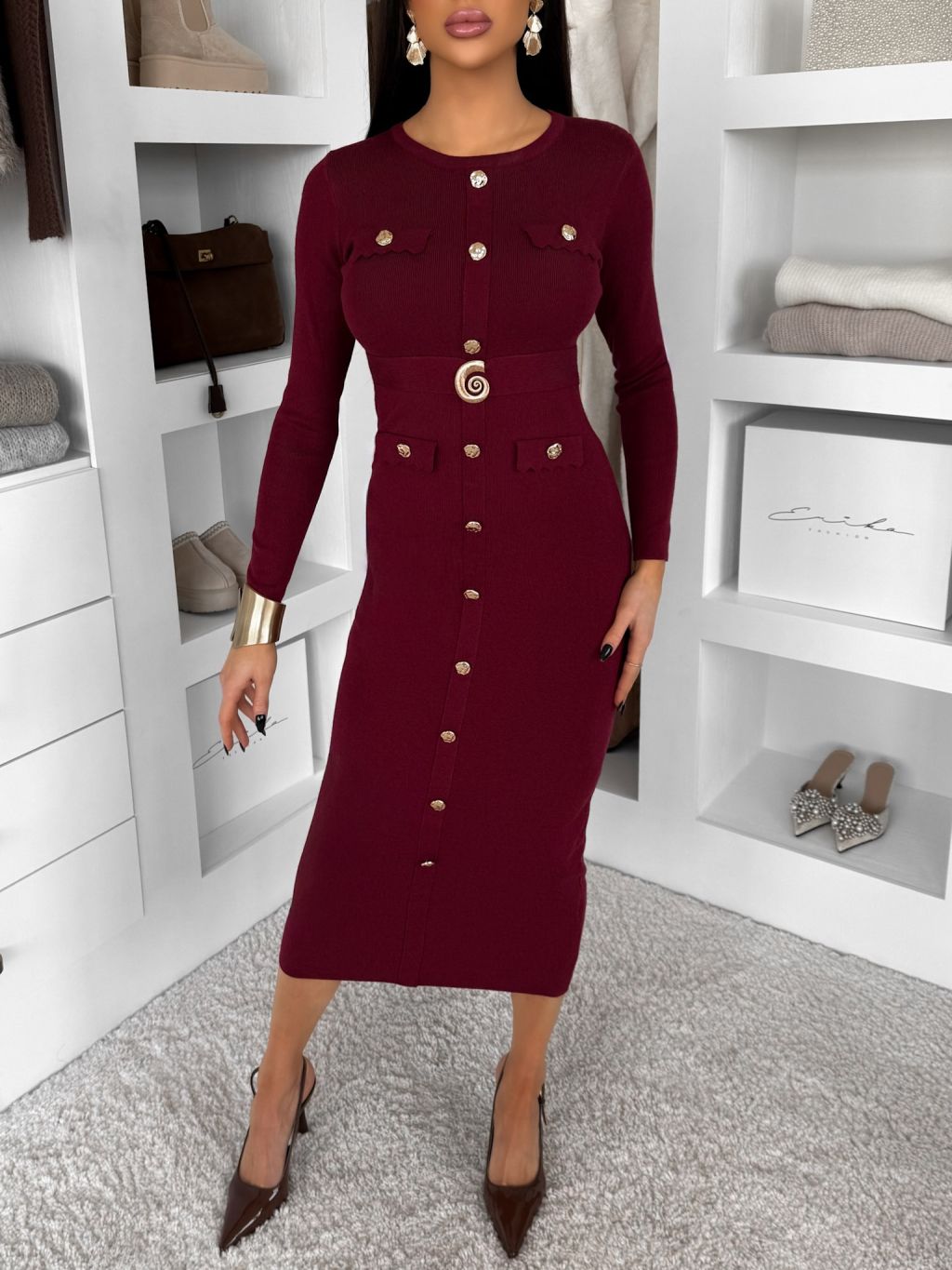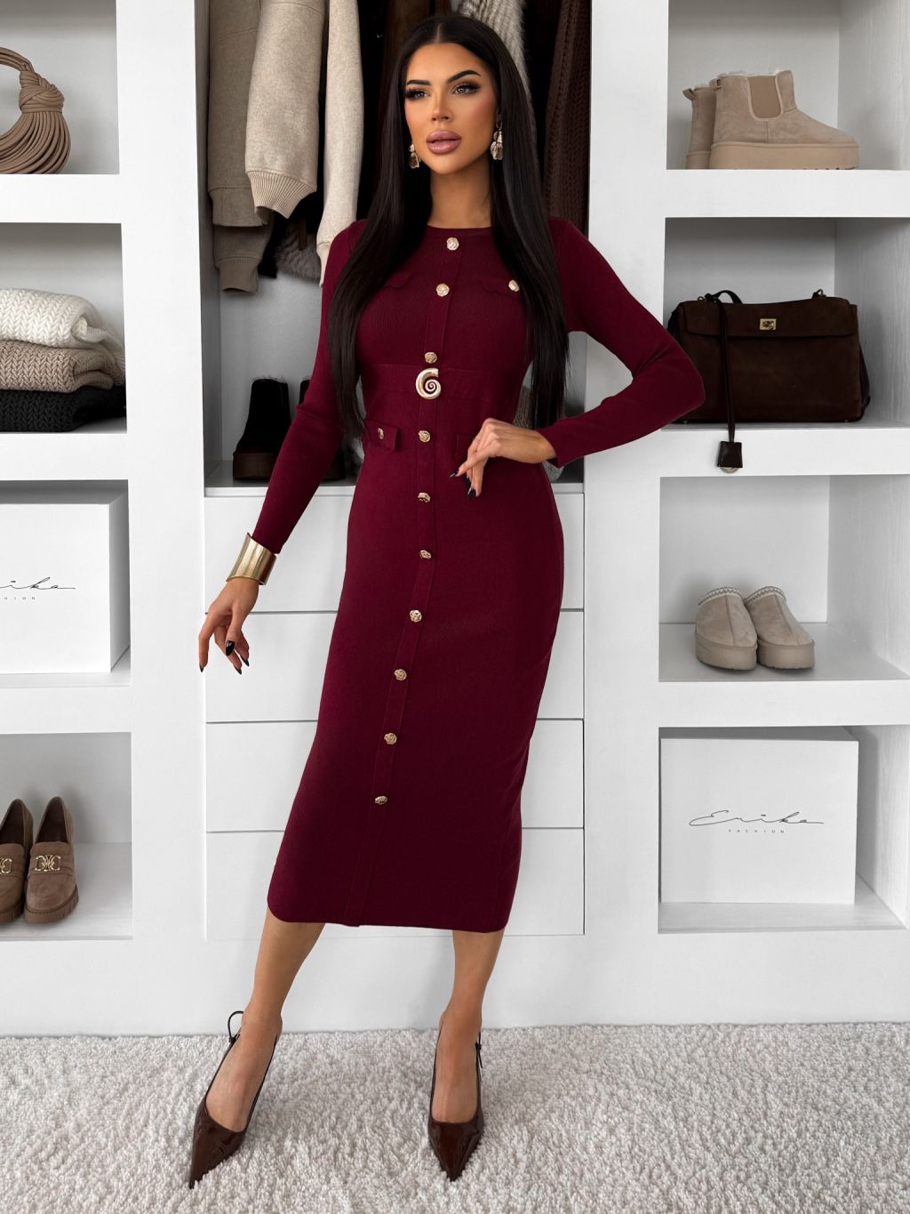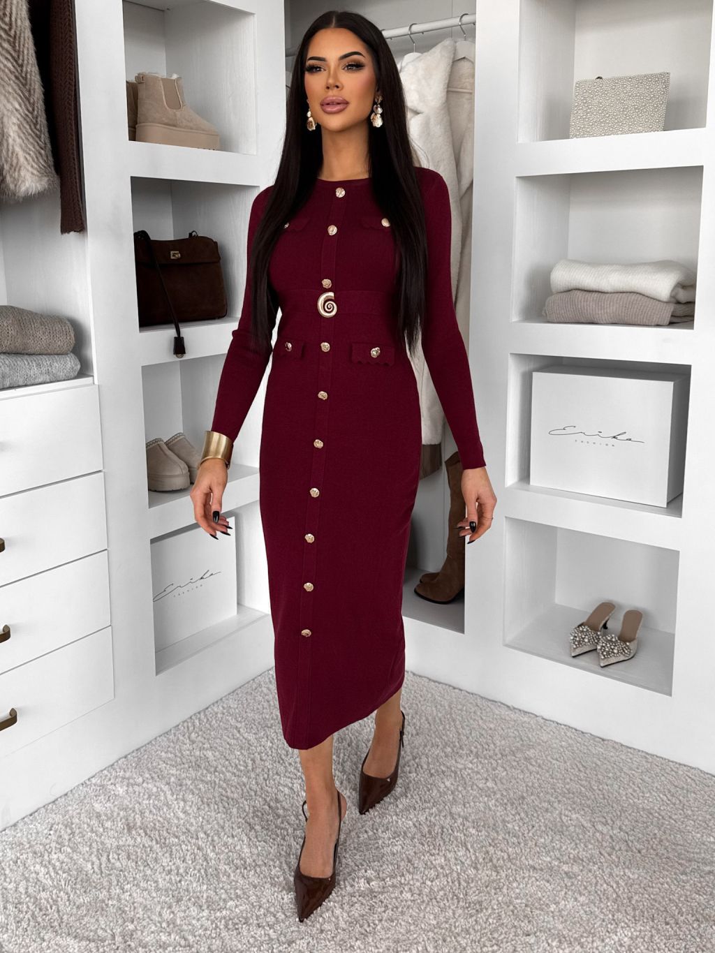 Vínové úpletové elegantné šaty CRESTILO s dlhým rukávom