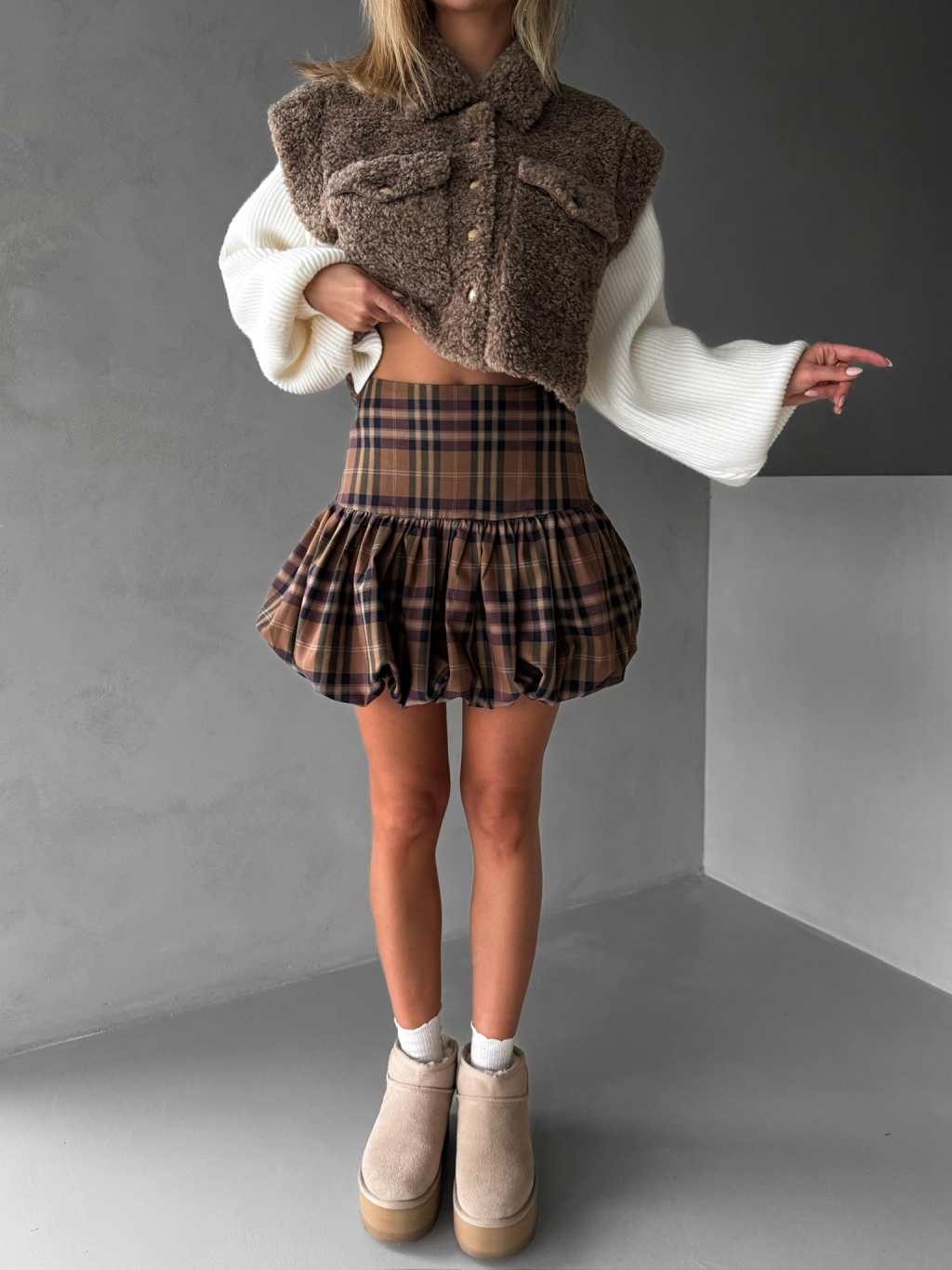 Hnedá károvaná balónová sukňa BROCKYN