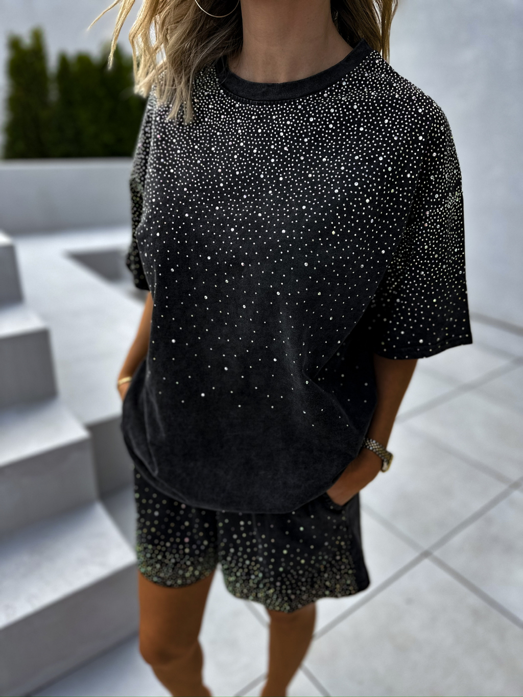 Čierna washed súprava SIXTUS s kamienkami