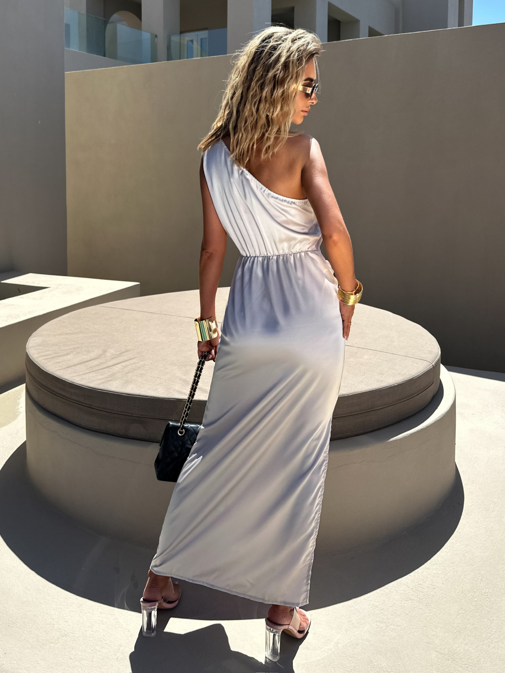 Krémové elegantné midi šaty ROULES na jedno rameno