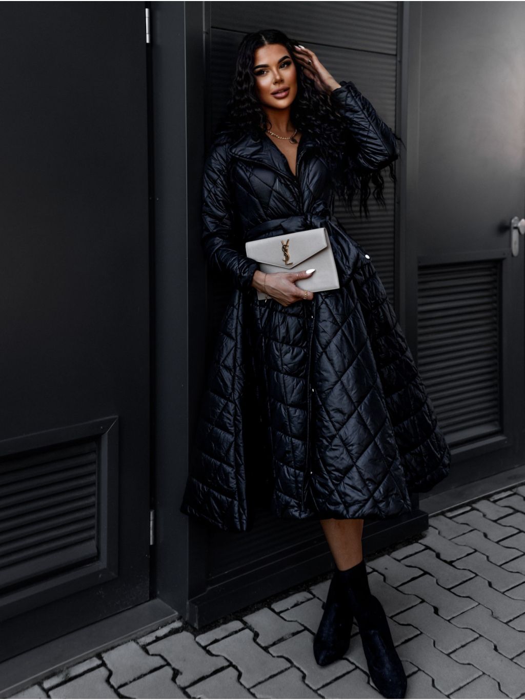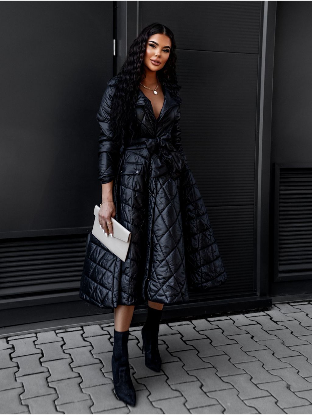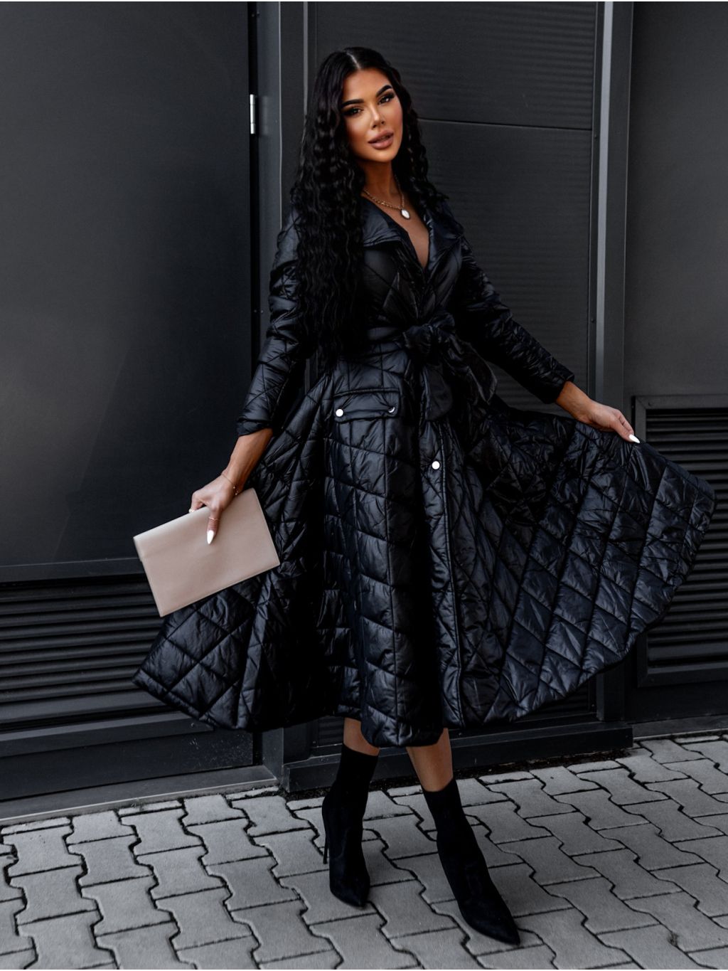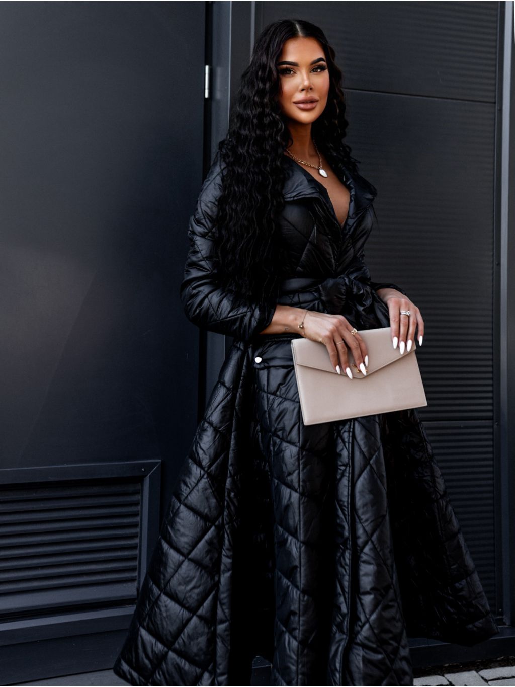 Čierna dlhá prešívaná bunda BALIONE s opaskom