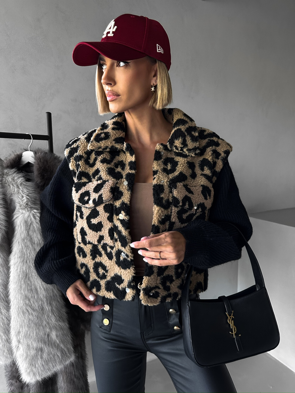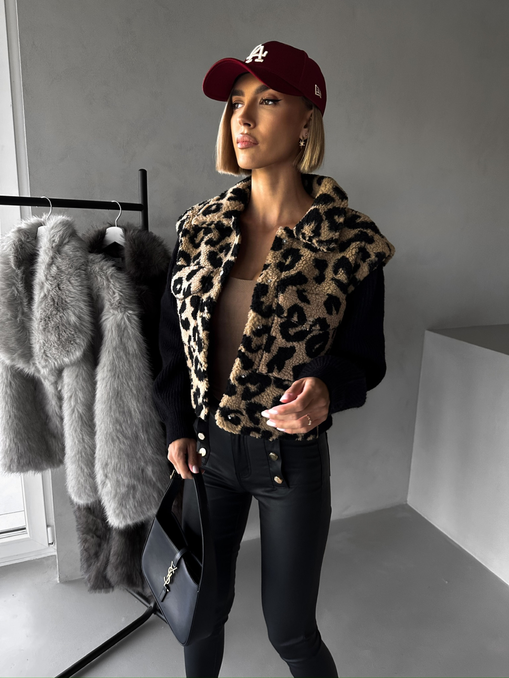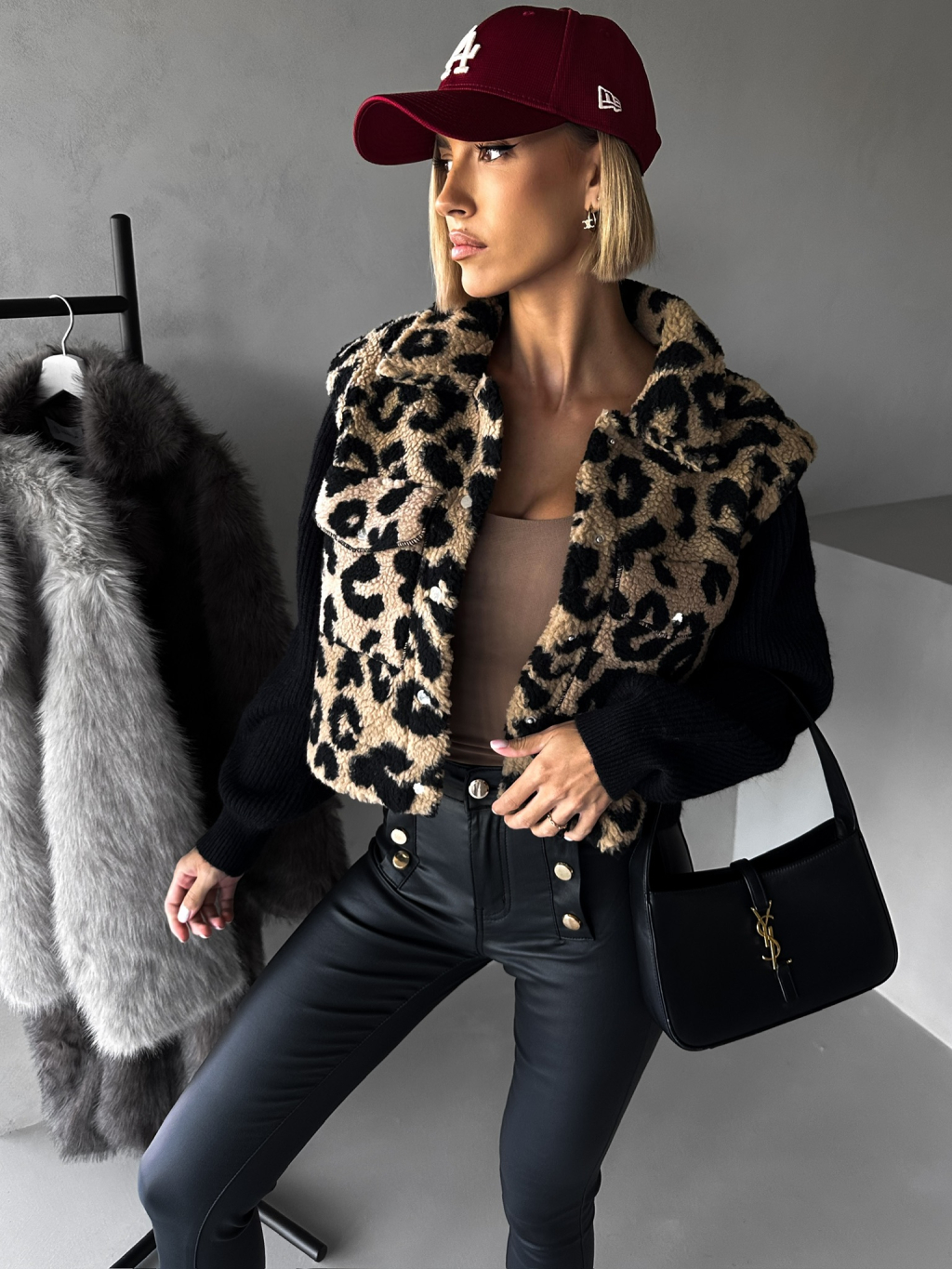 Čierna sveterová bunda MARALAA s gepardím vzorom a čiernymi rukávmi