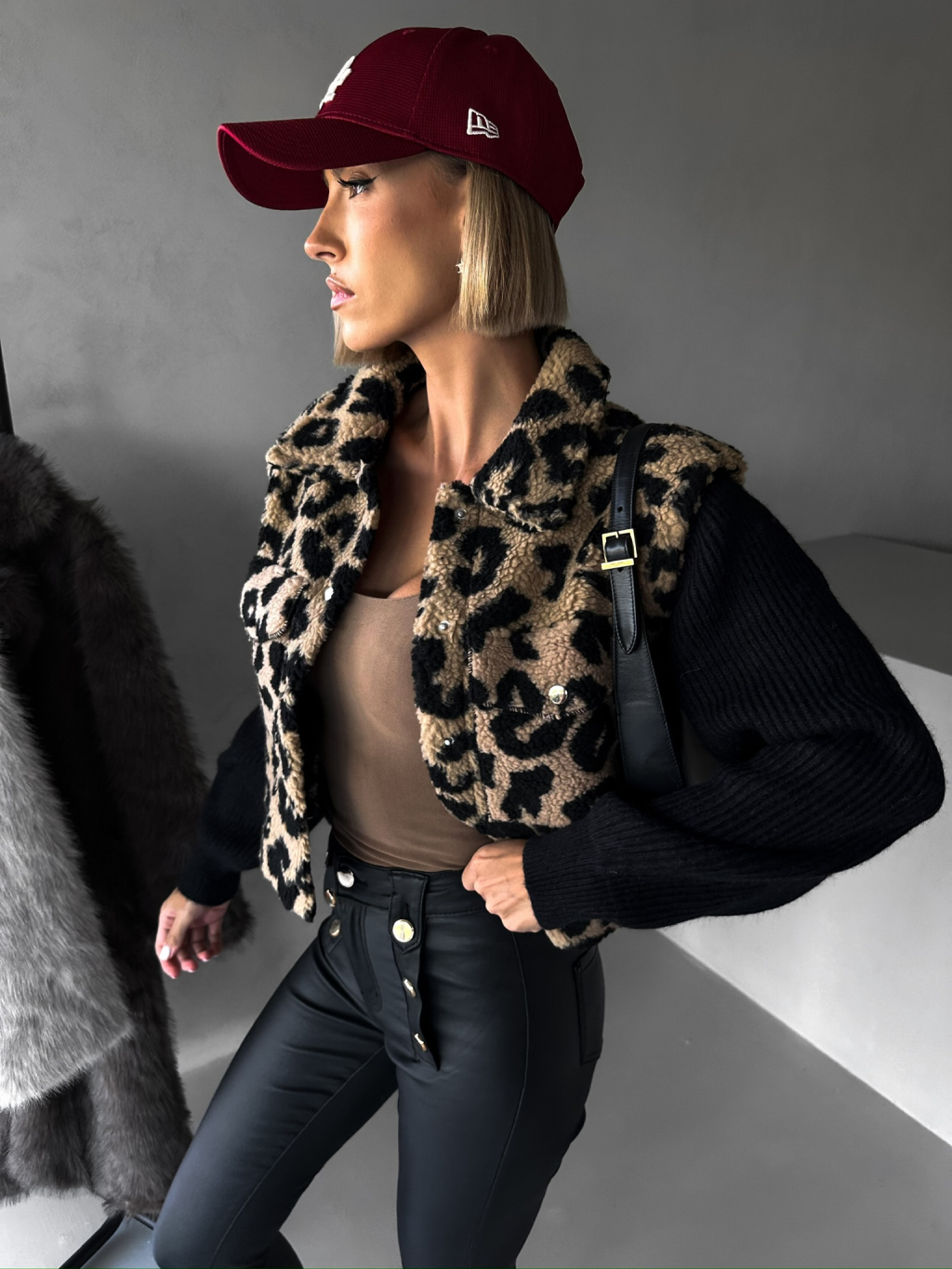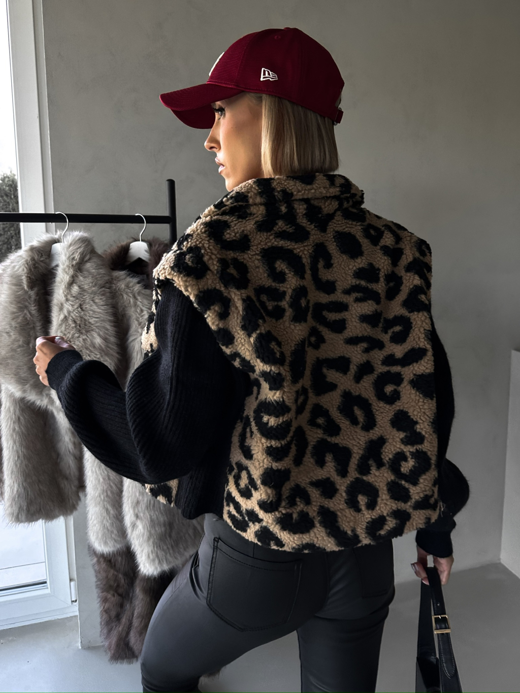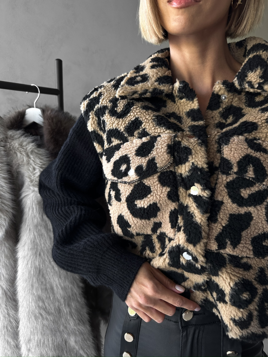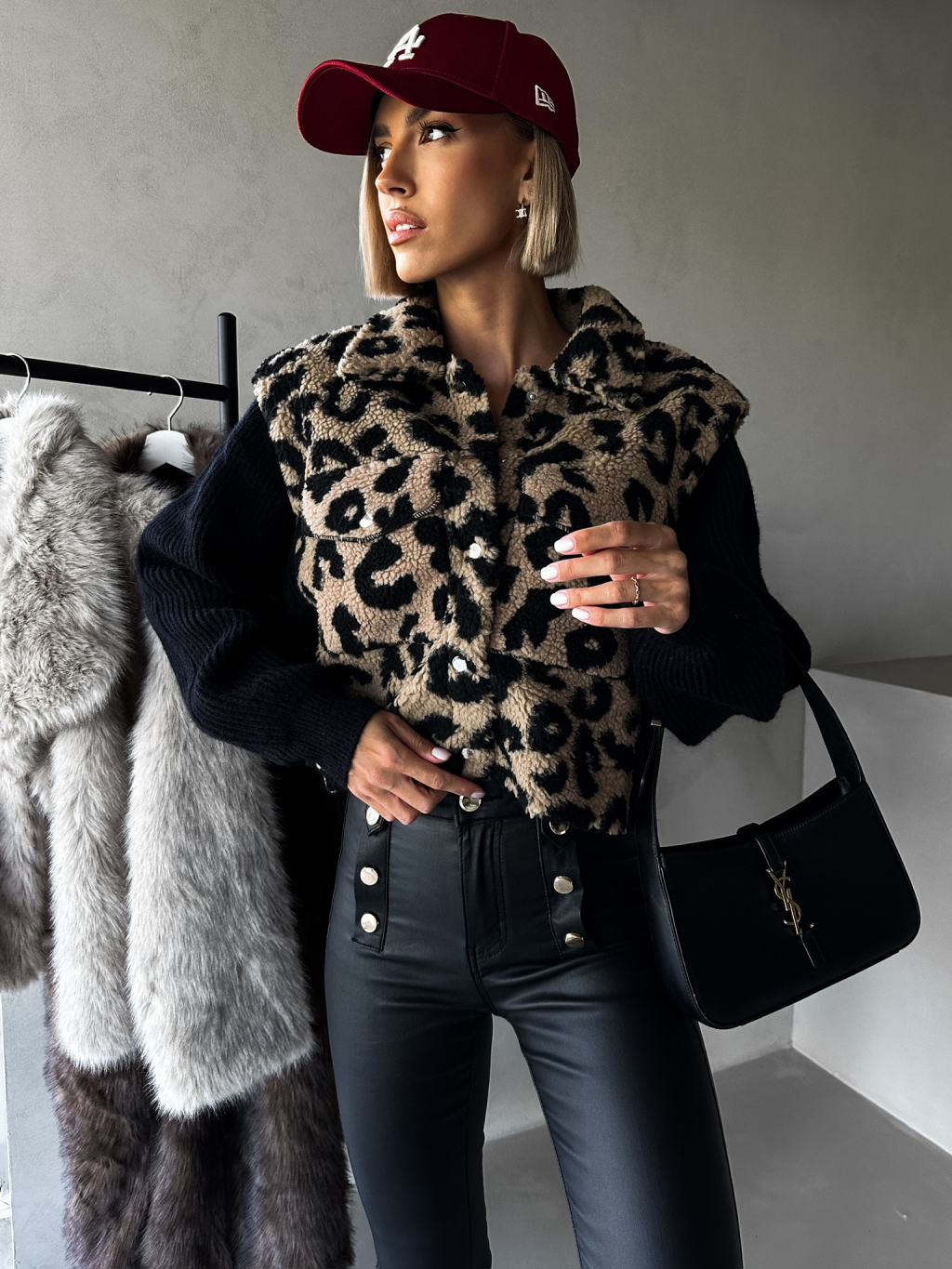 Čierna sveterová bunda MARALAA s gepardím vzorom a čiernymi rukávmi