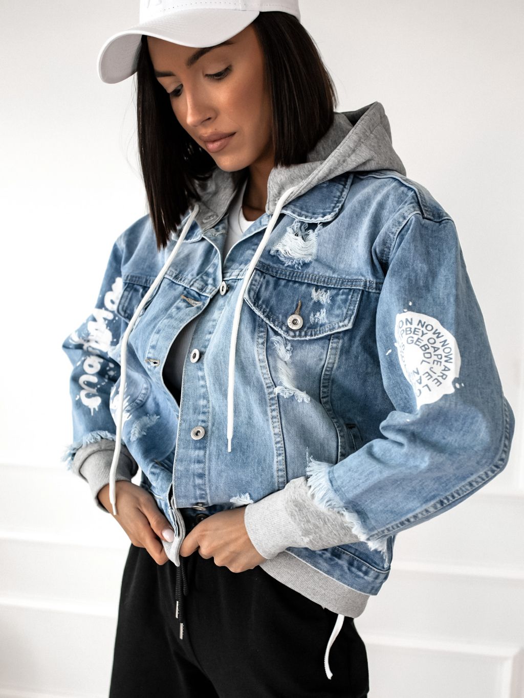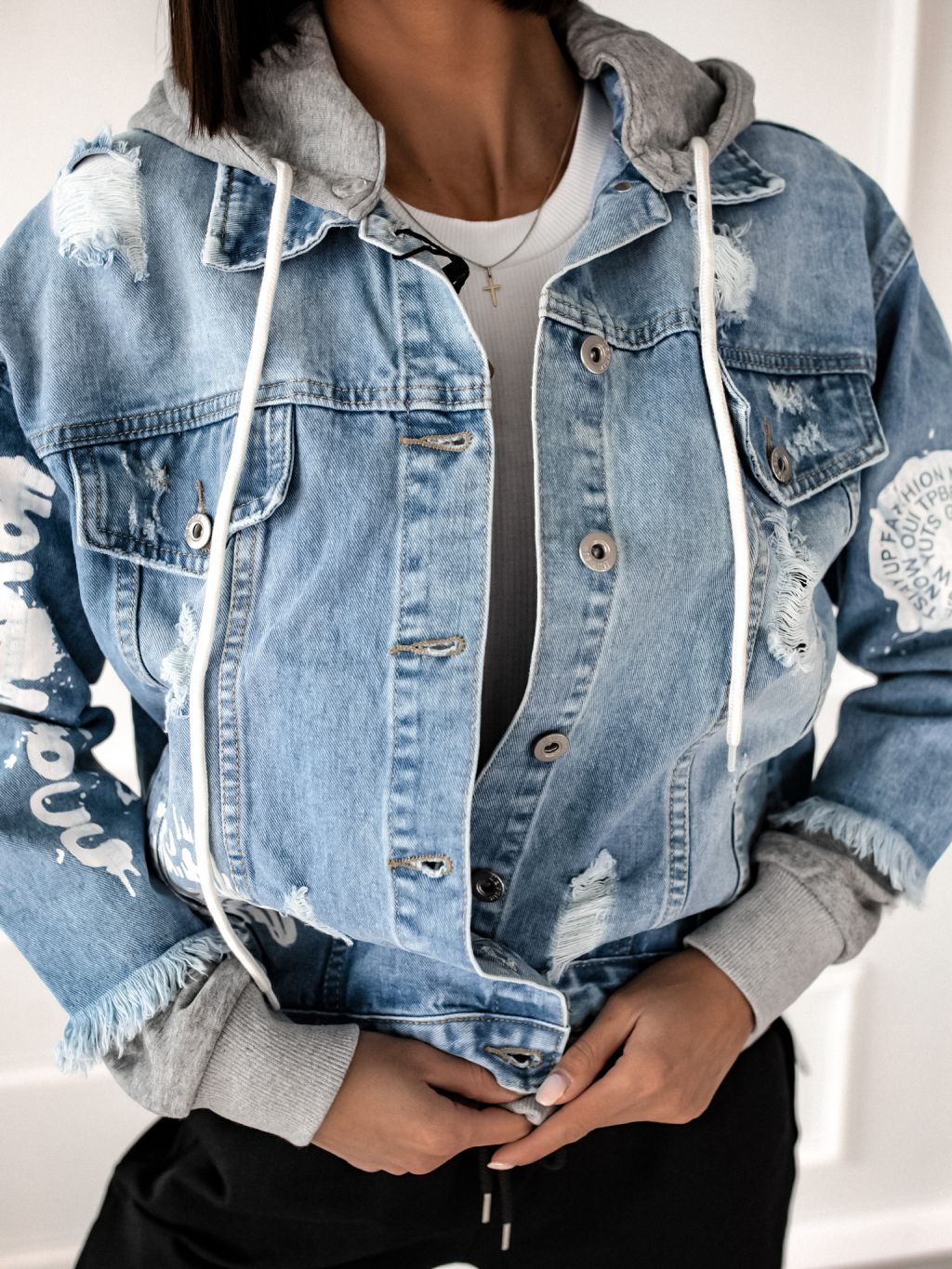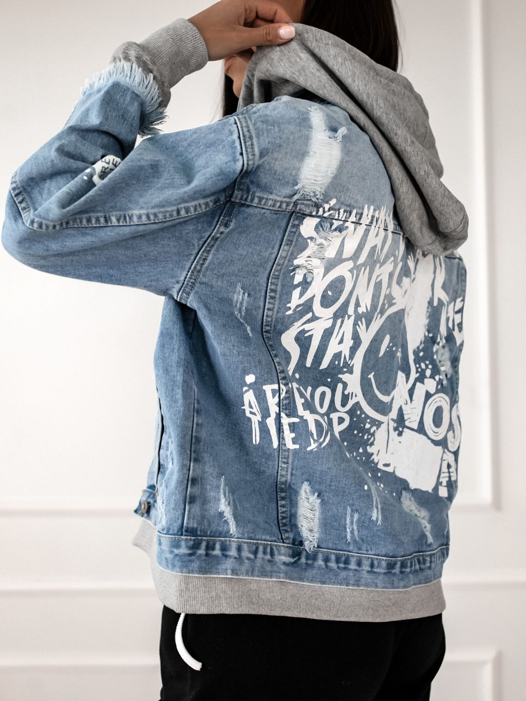 Denim džínsová bunda LION s kapucňou a potlačou na chrbte