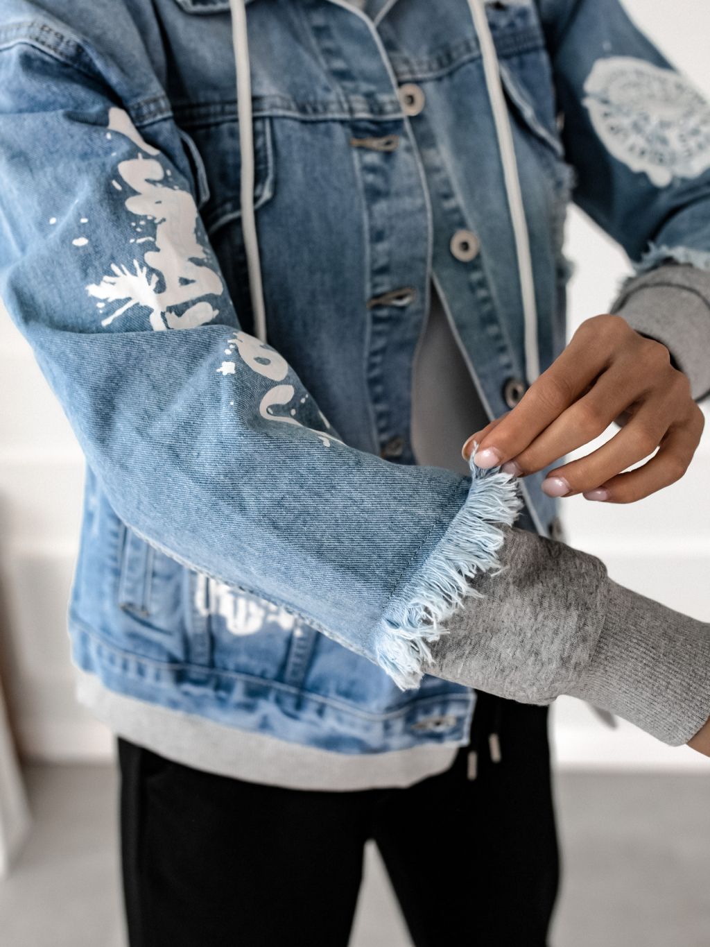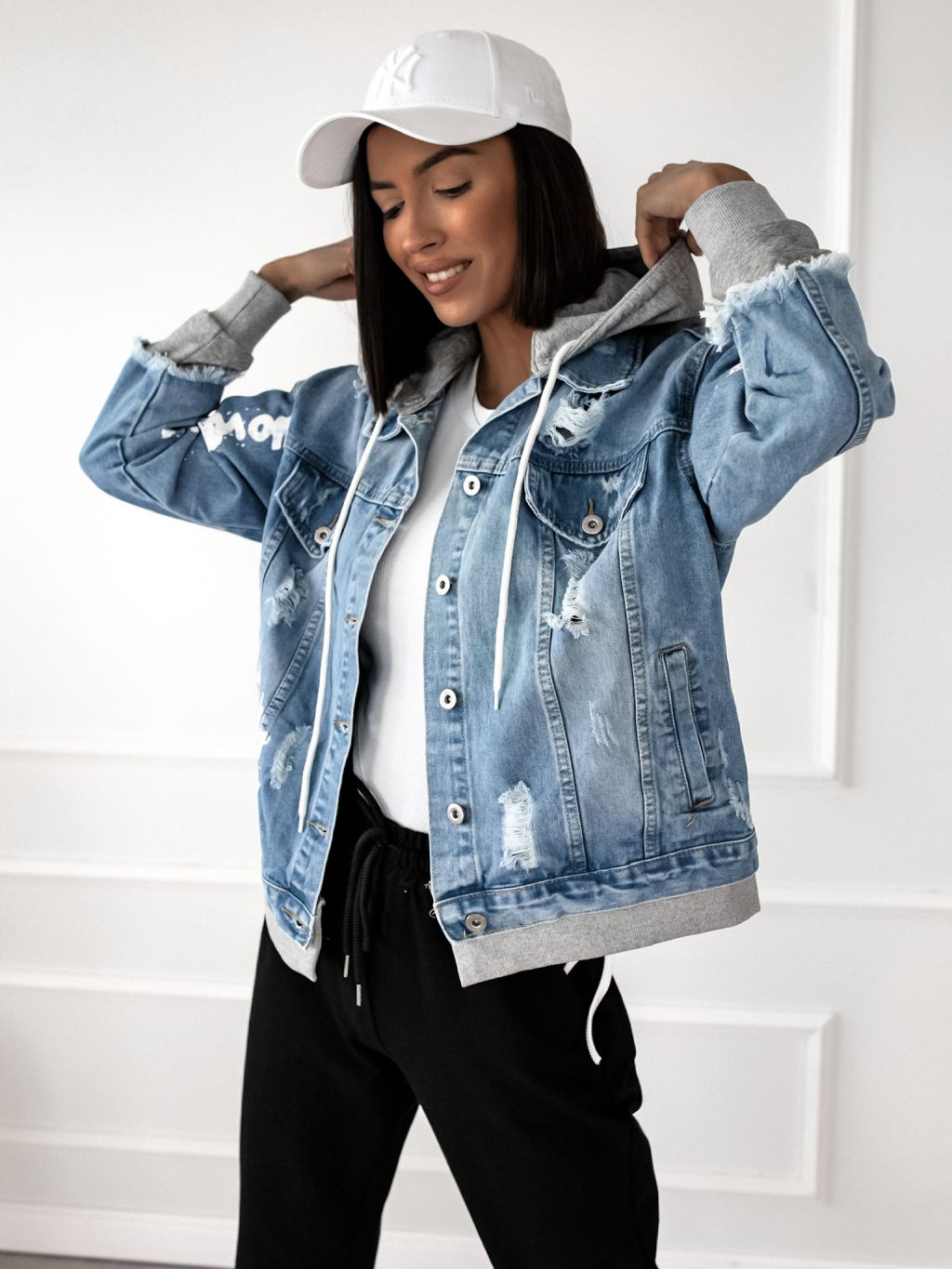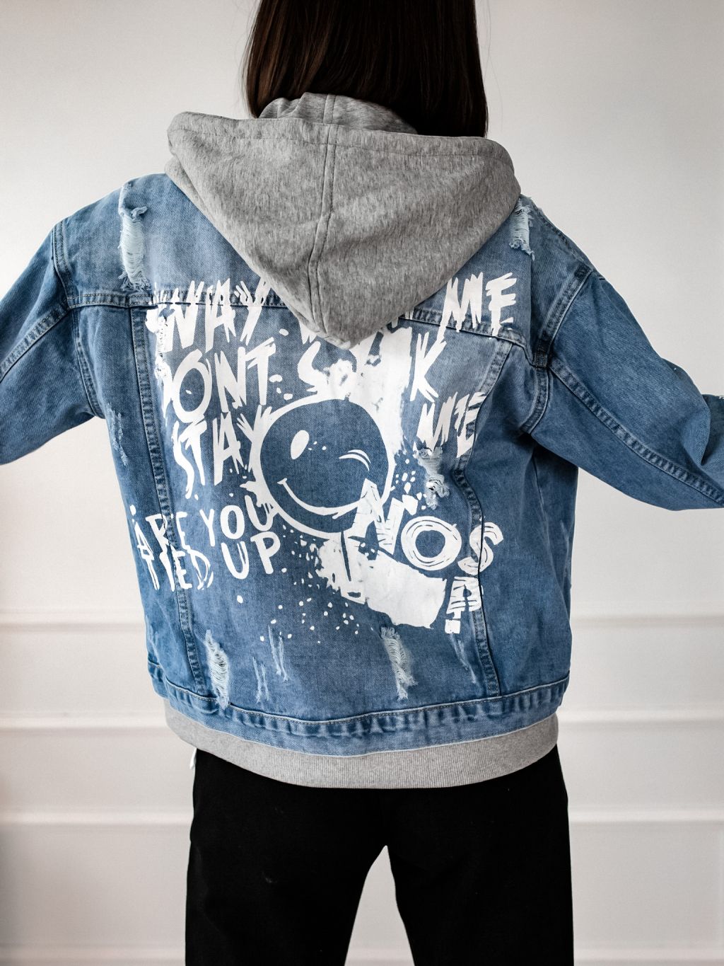 Denim džínsová bunda LION s kapucňou a potlačou na chrbte