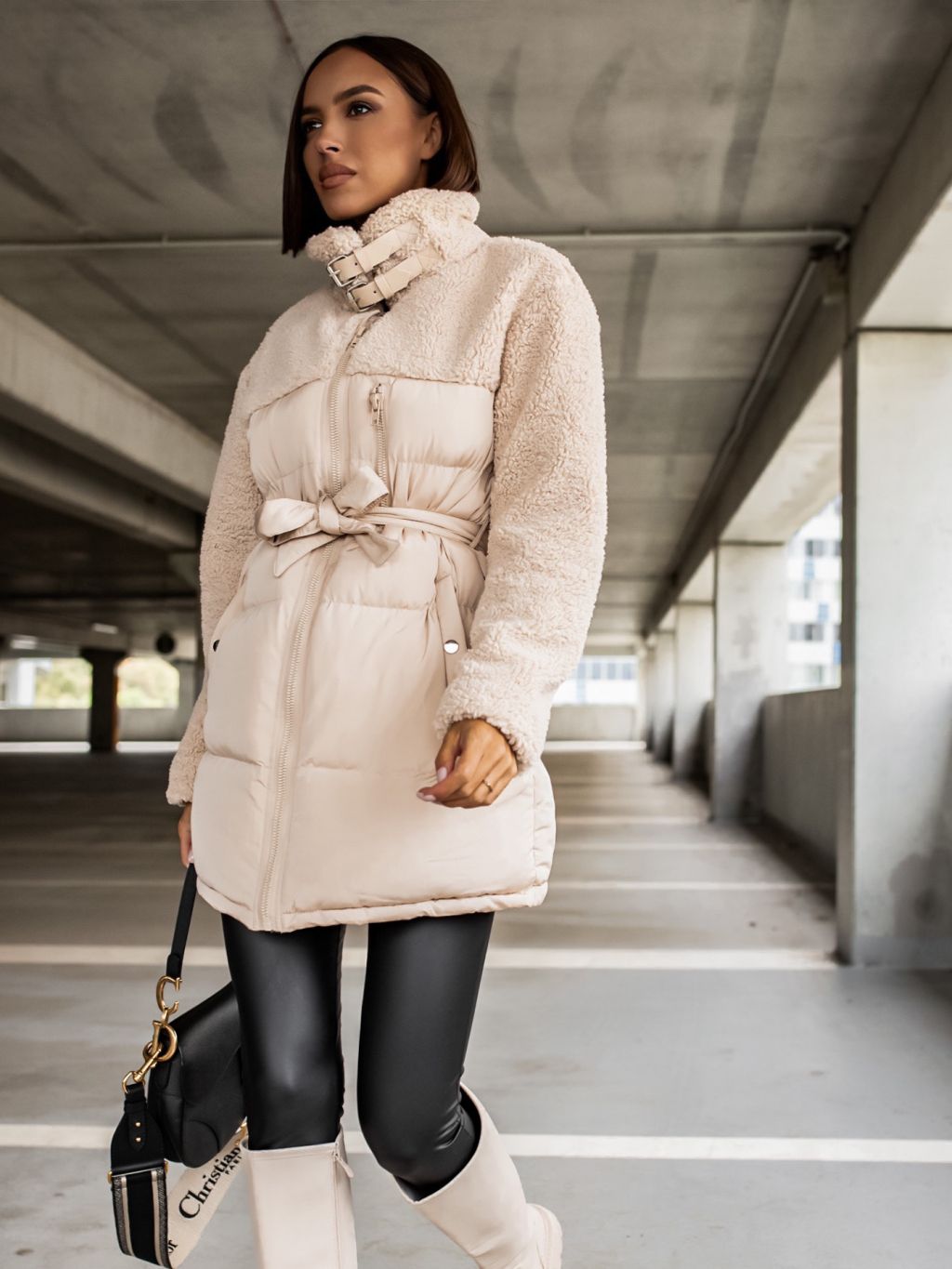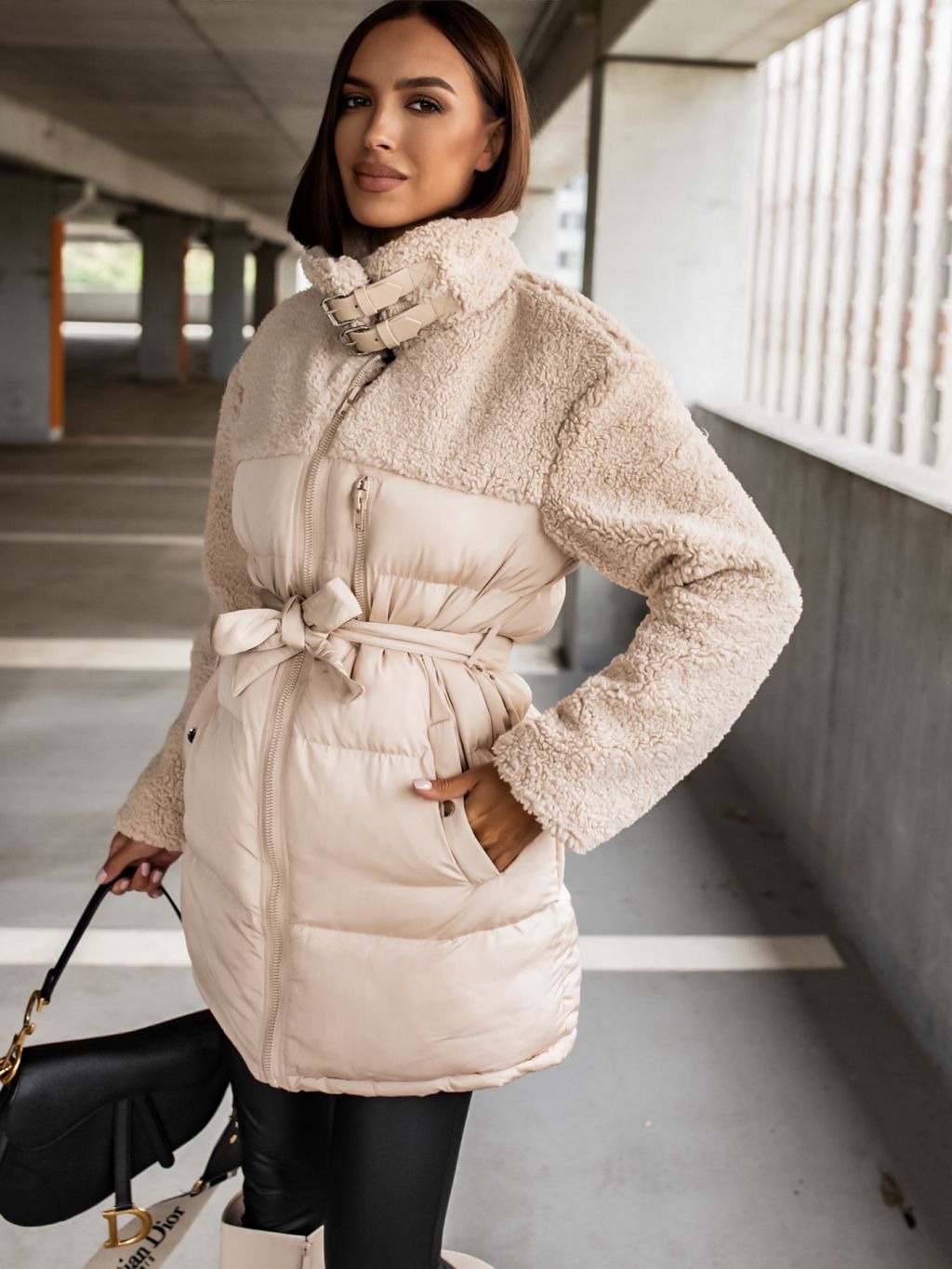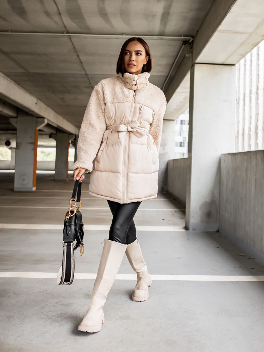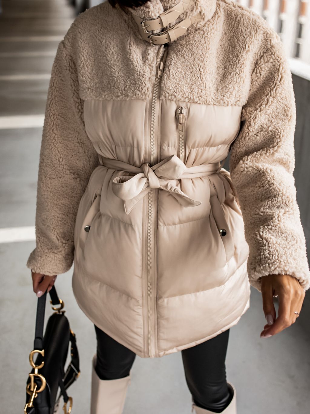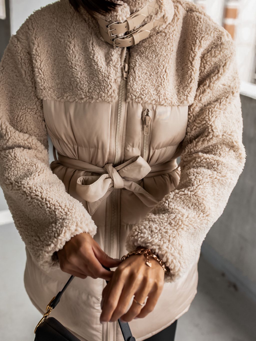 Krémová bunda PEBLES s umelou kožušinkou a viazaním v páse