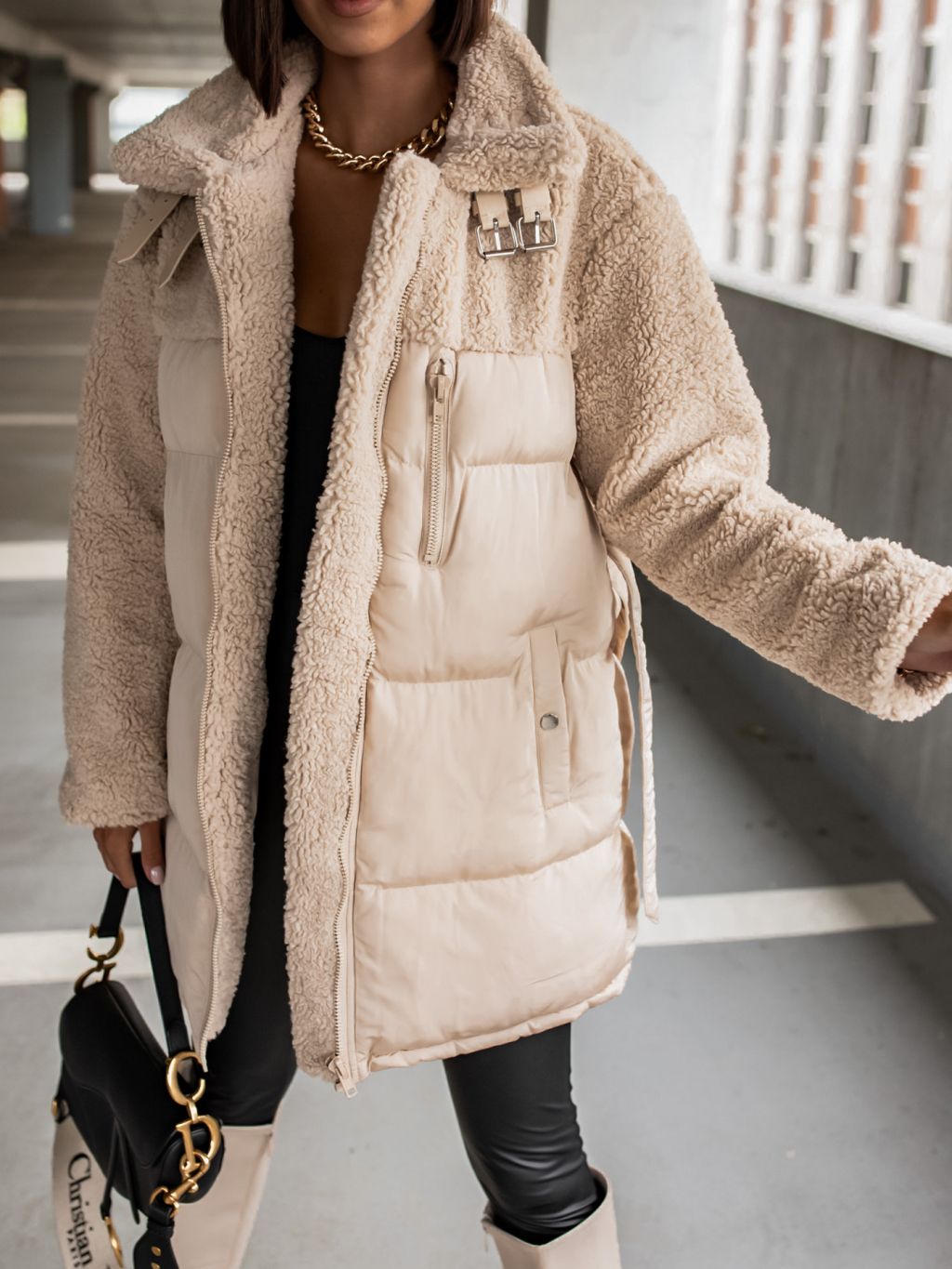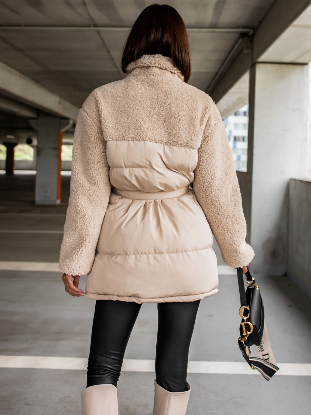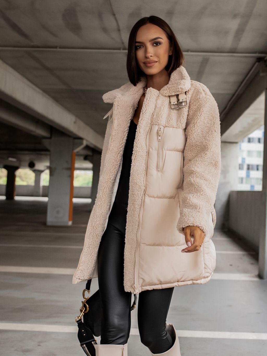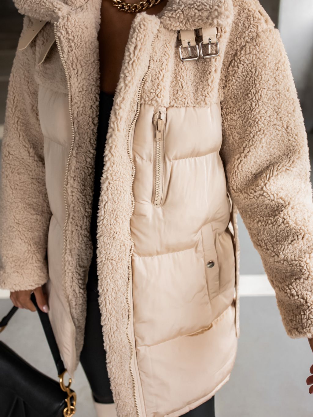 Krémová bunda PEBLES s umelou kožušinkou a viazaním v páse