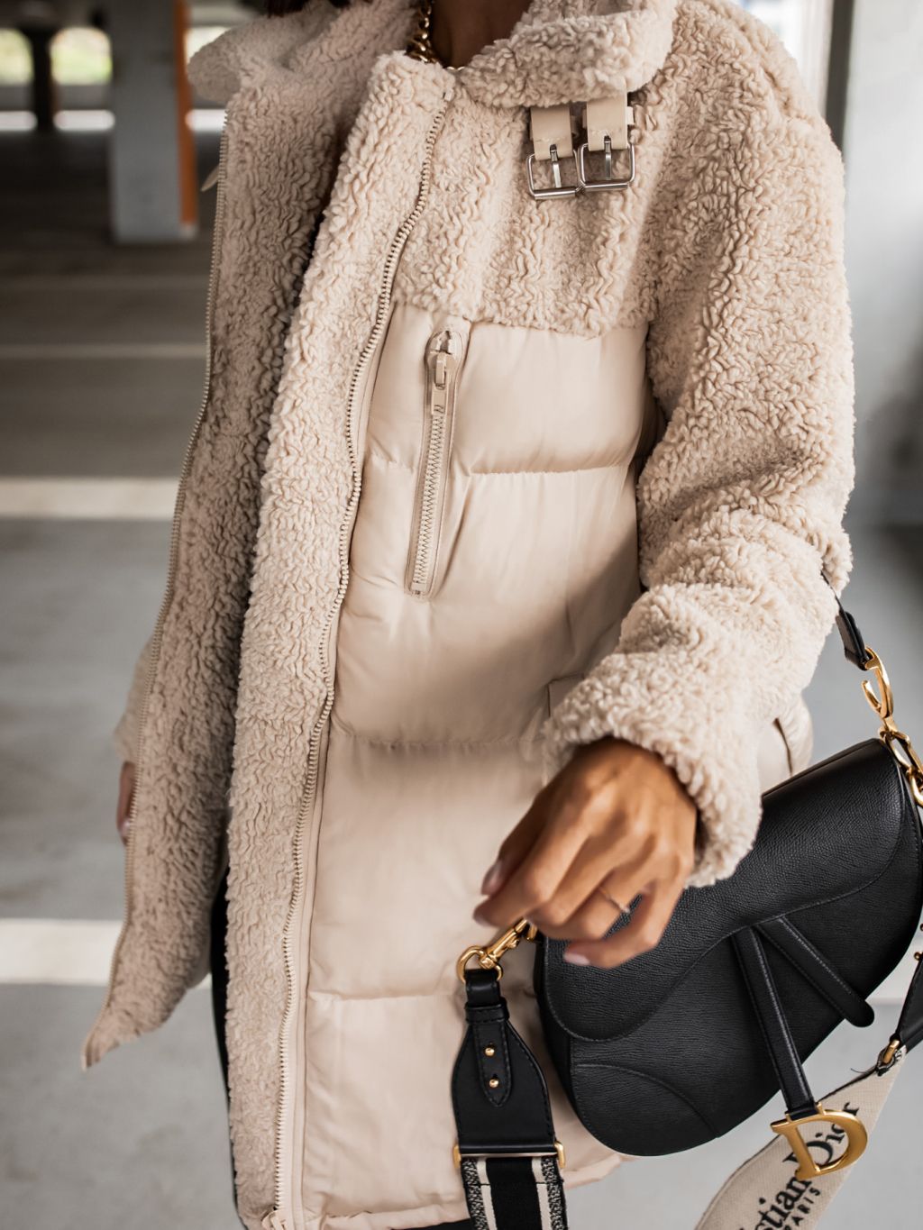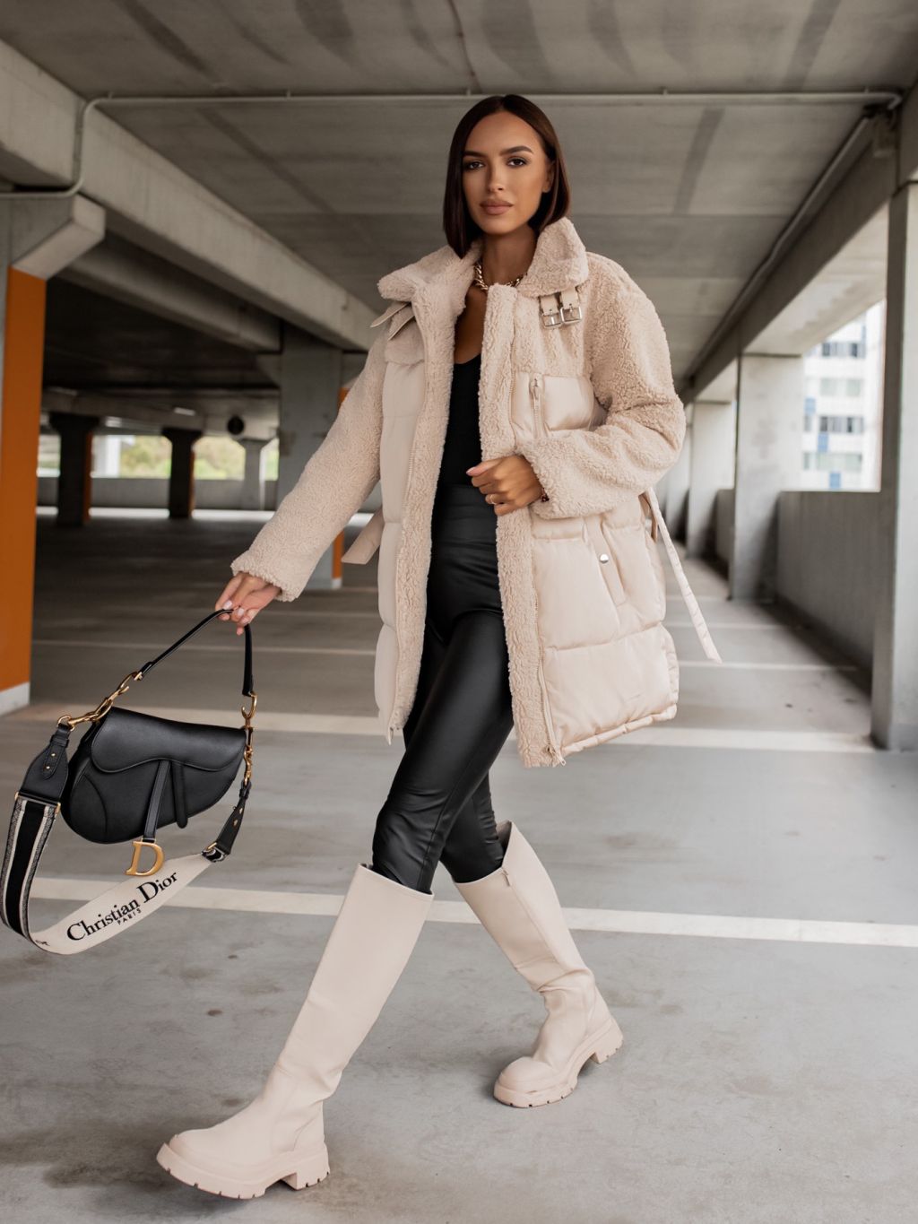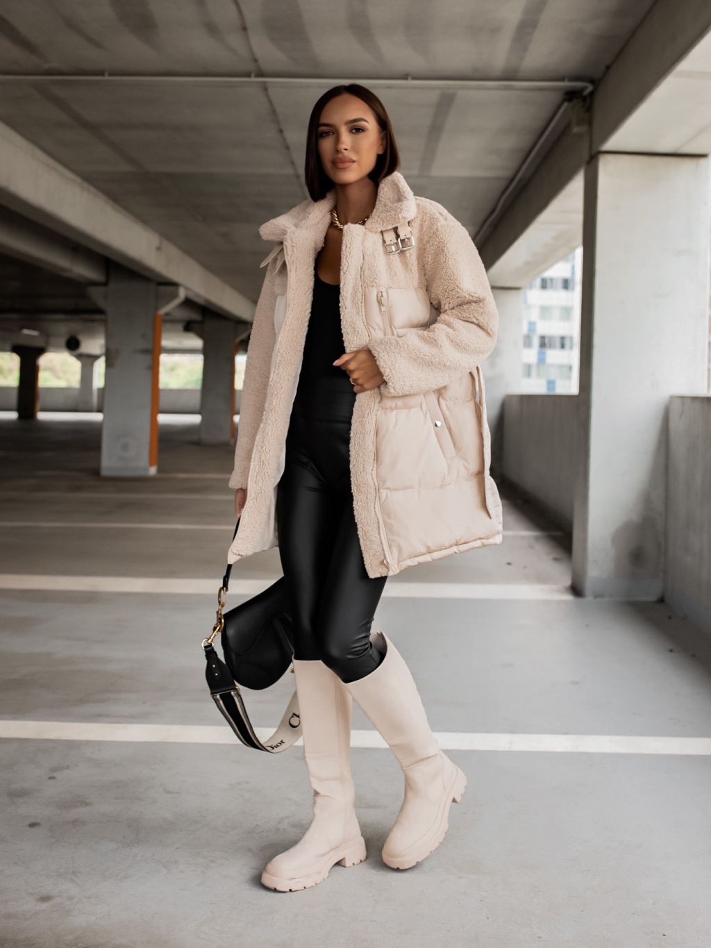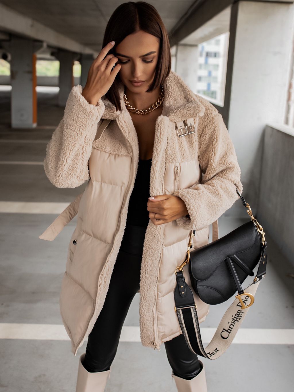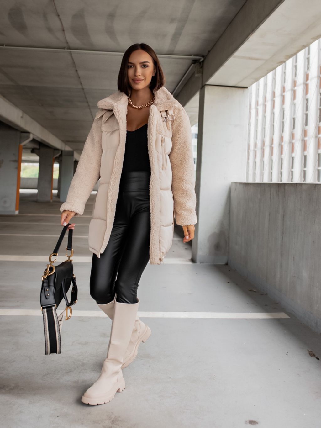 Krémová bunda PEBLES s umelou kožušinkou a viazaním v páse