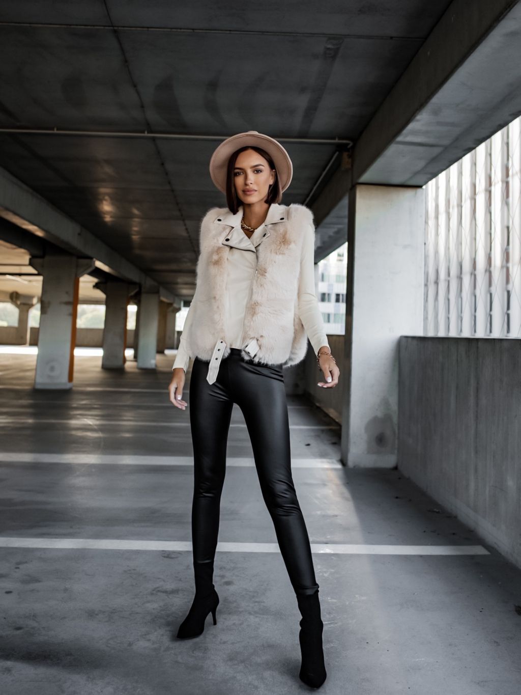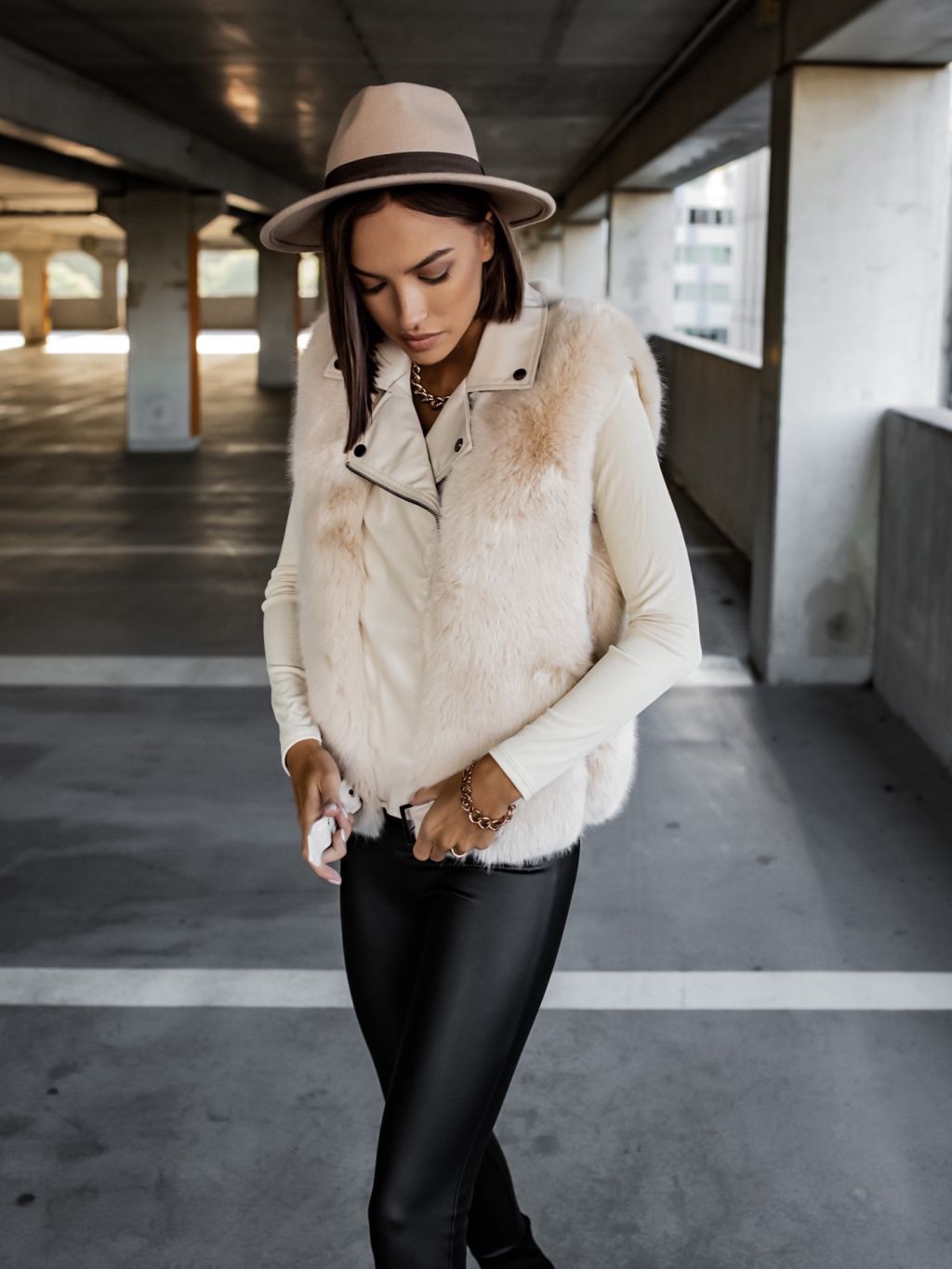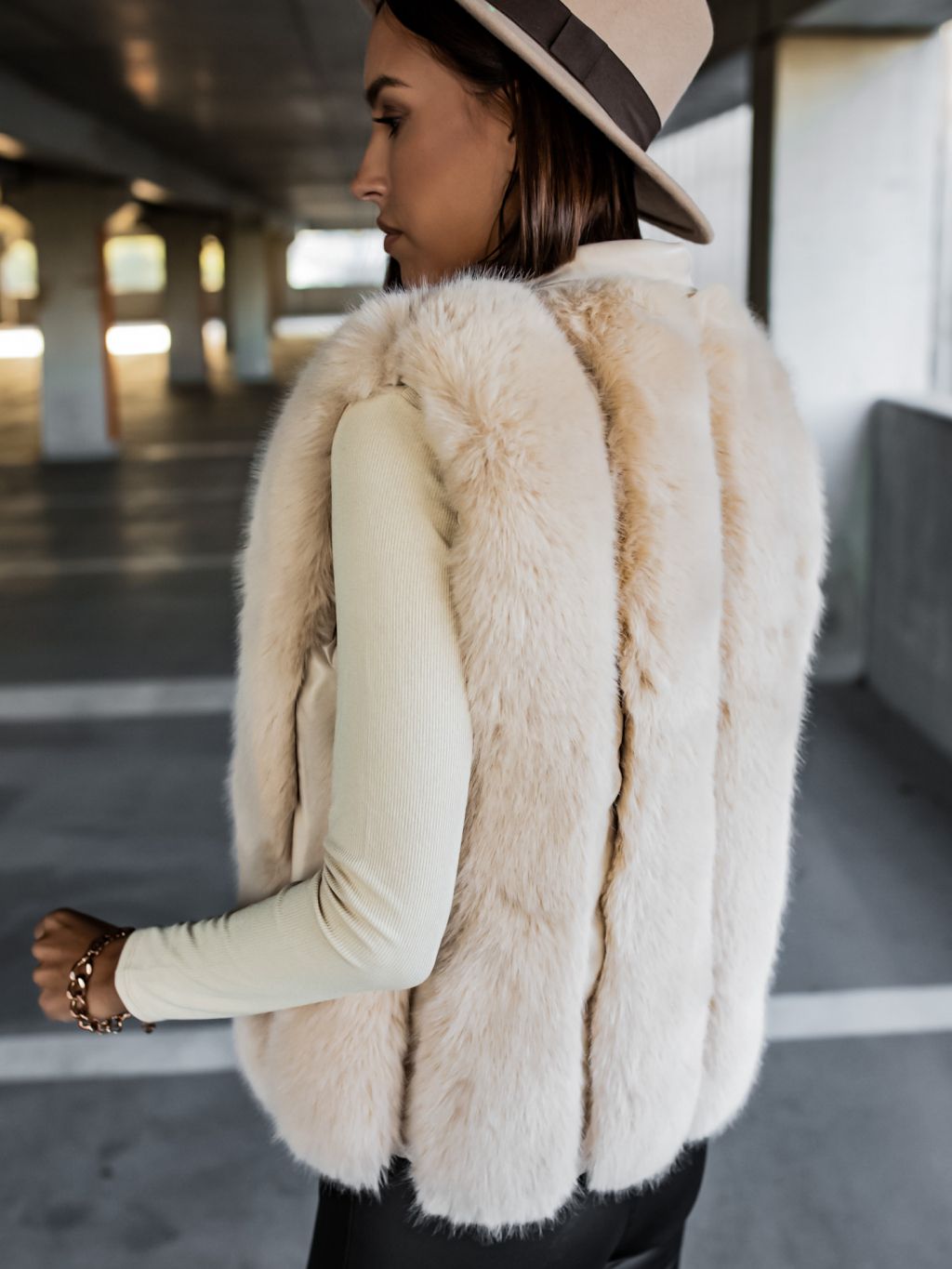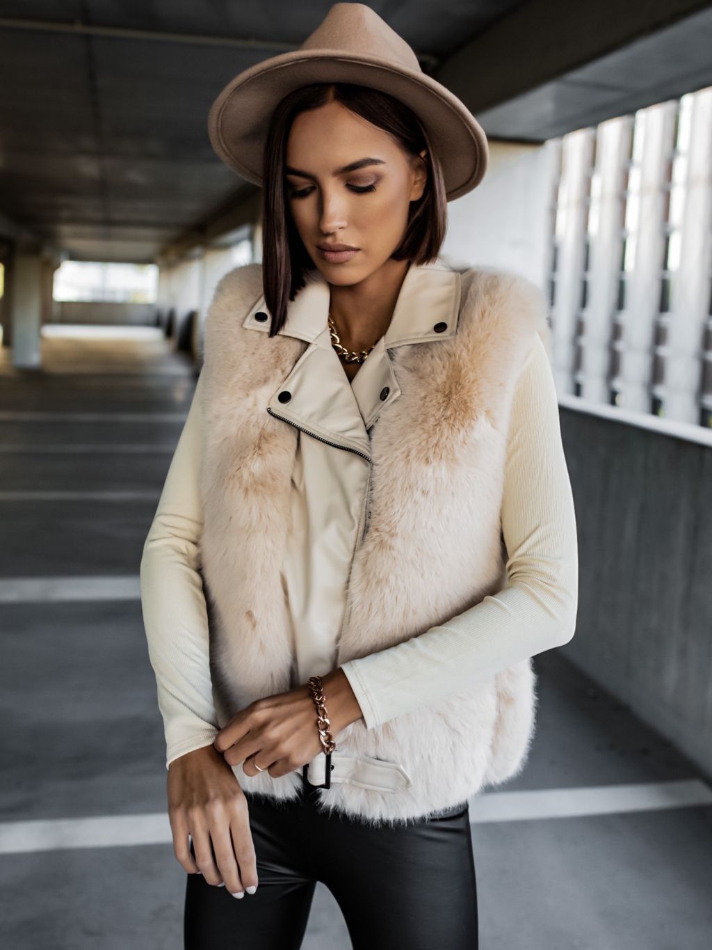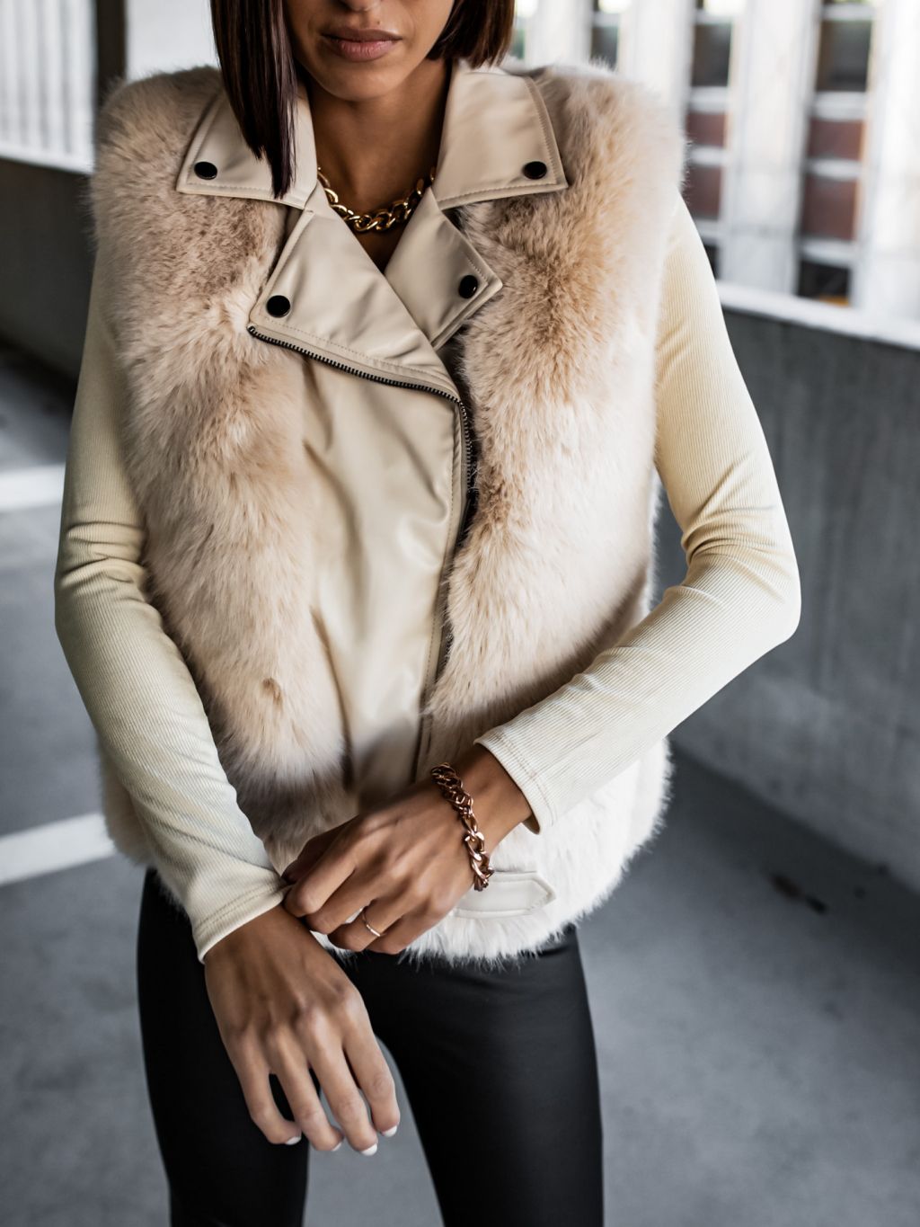 Béžová koženková vesta ZIGGY s umelou kožušinou