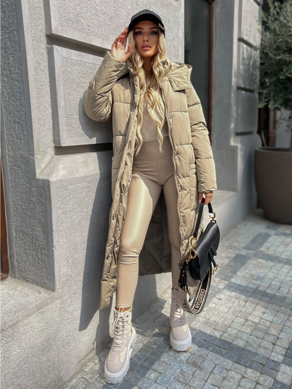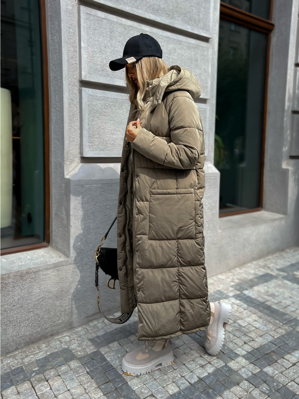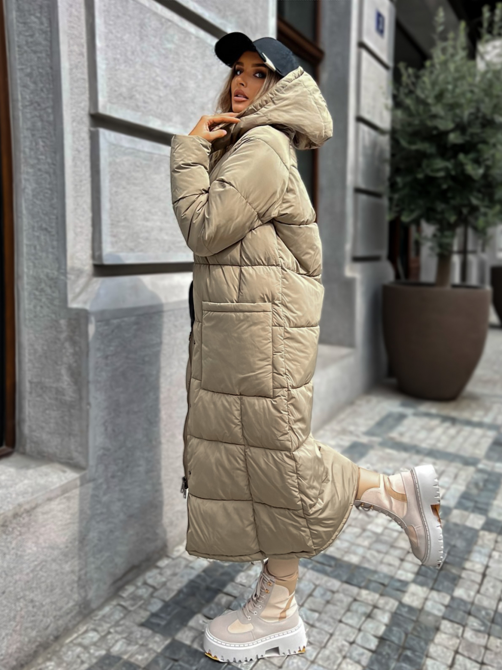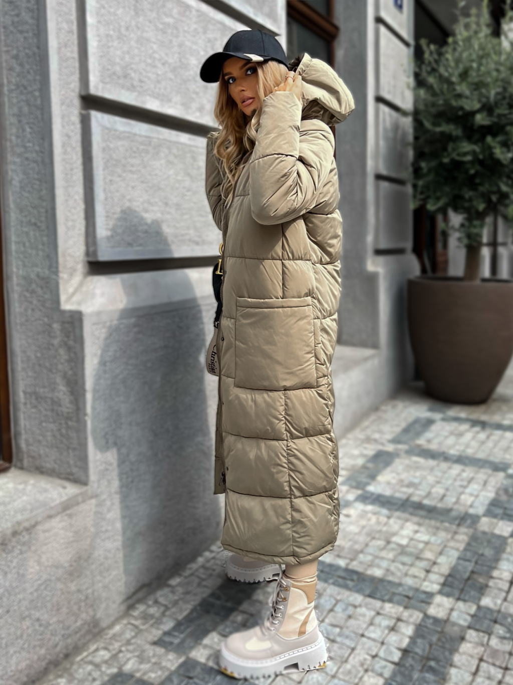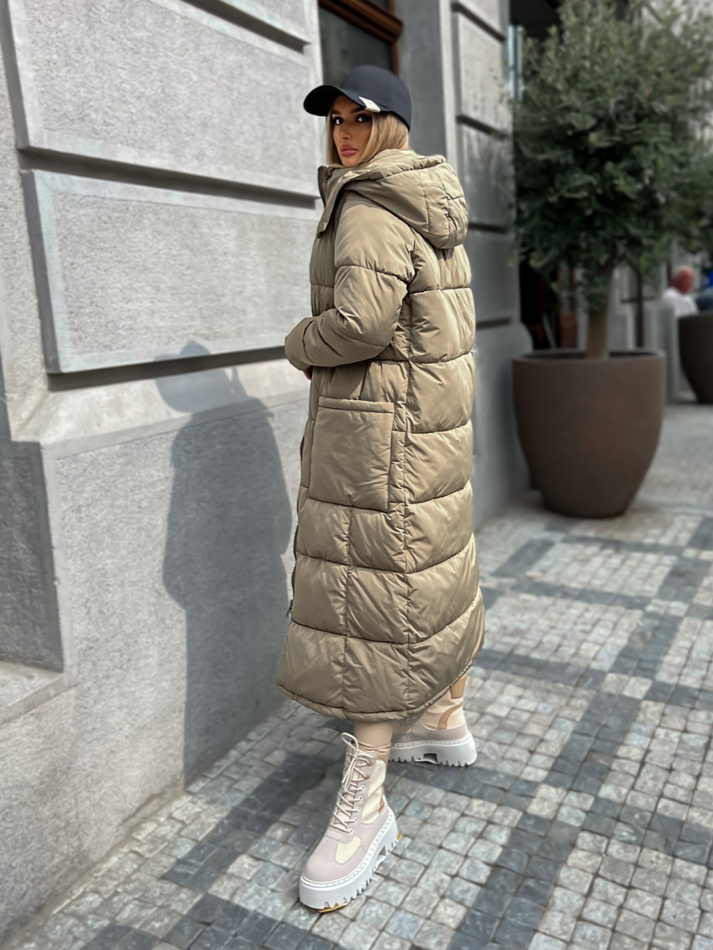 Tmavo béžová dlhá prešívaná bunda WALNUT s vreckami
