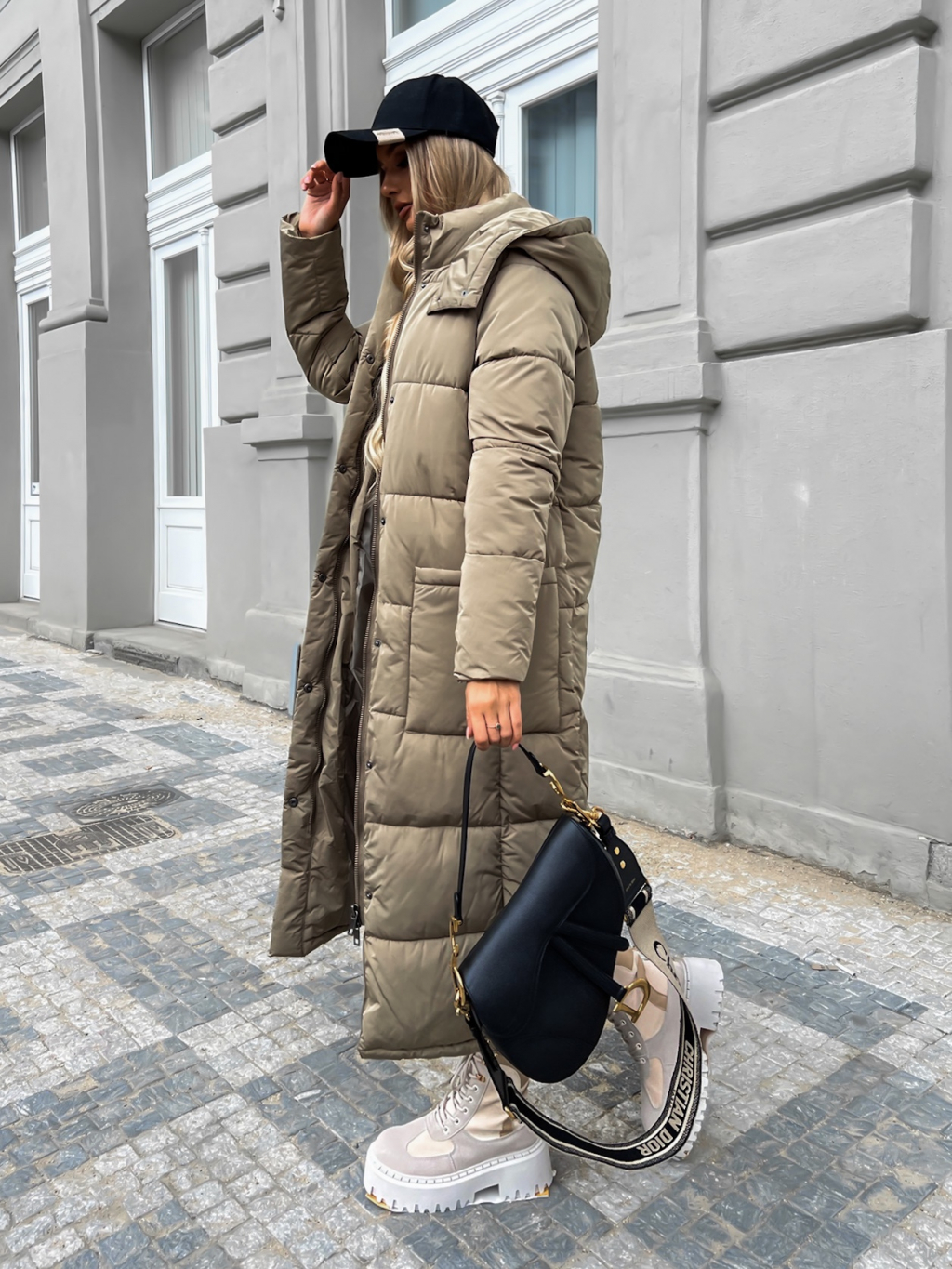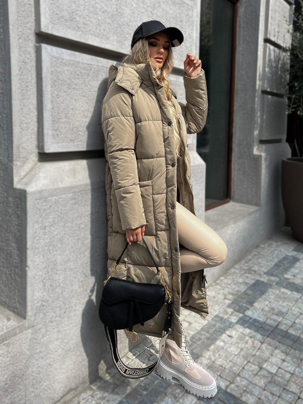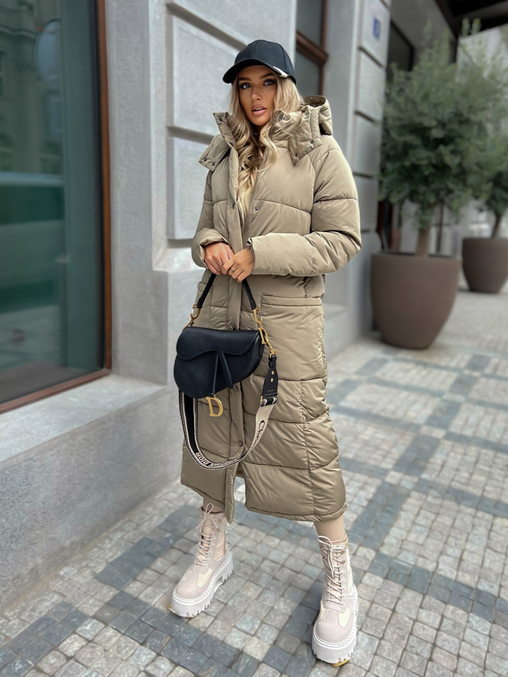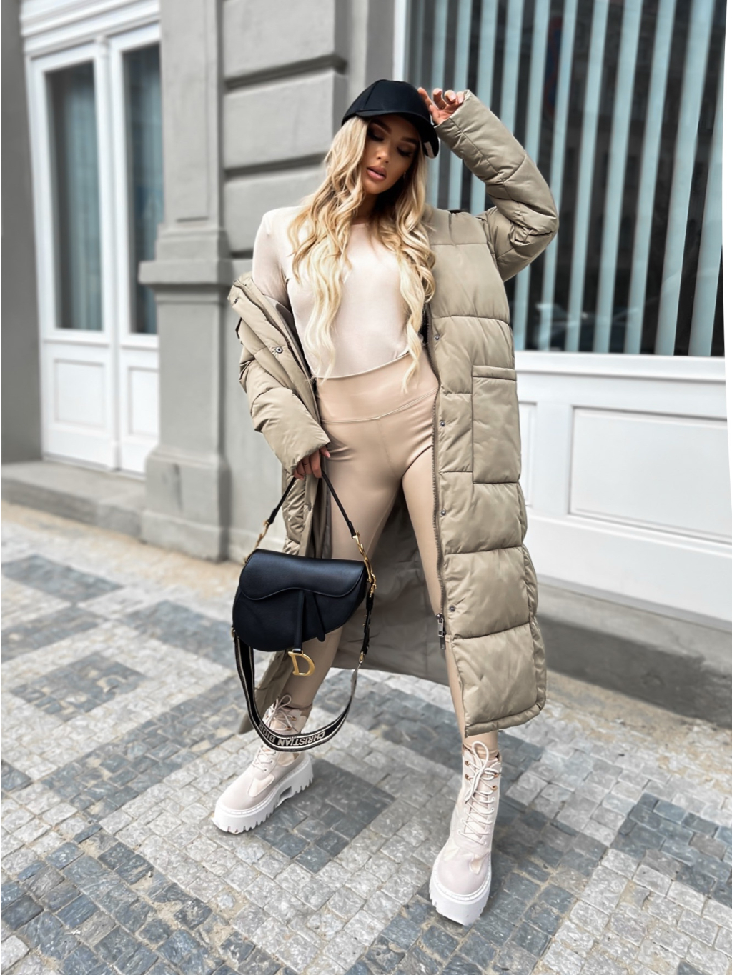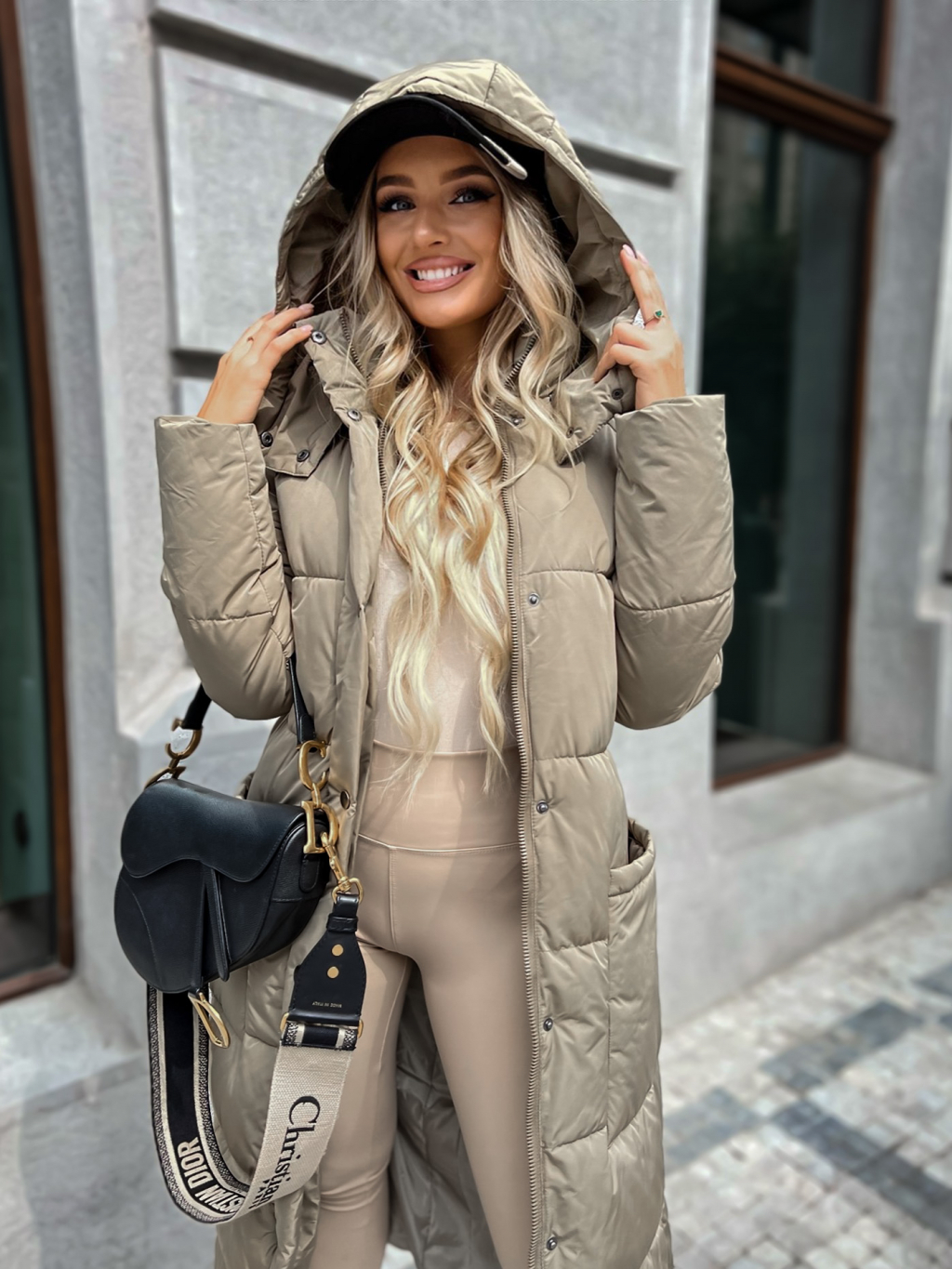 Tmavo béžová dlhá prešívaná bunda WALNUT s vreckami
