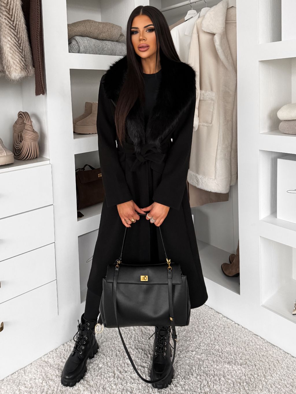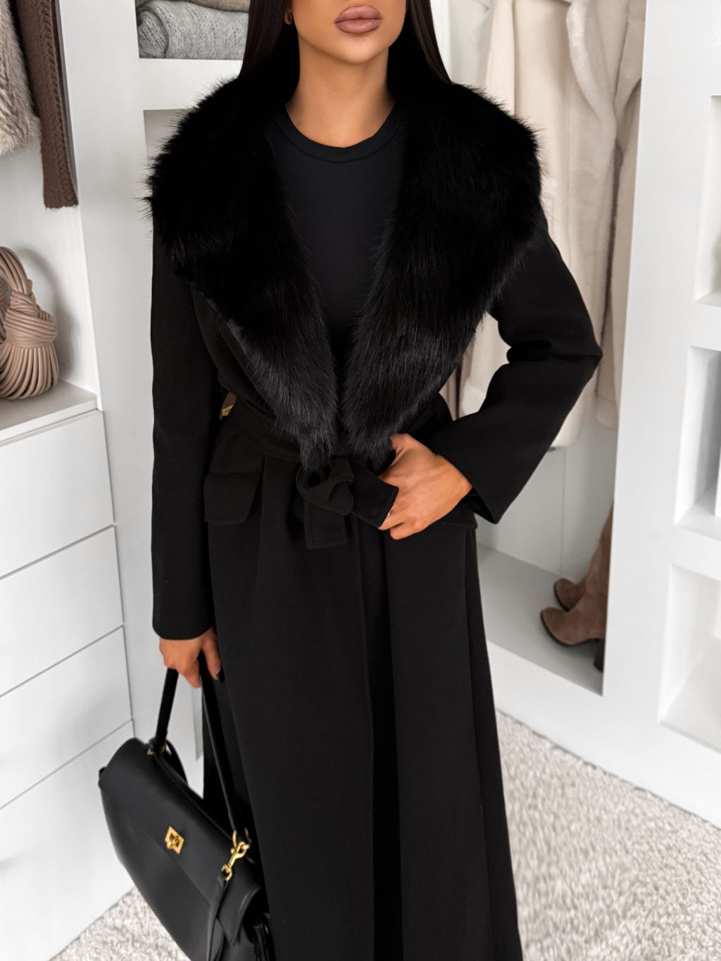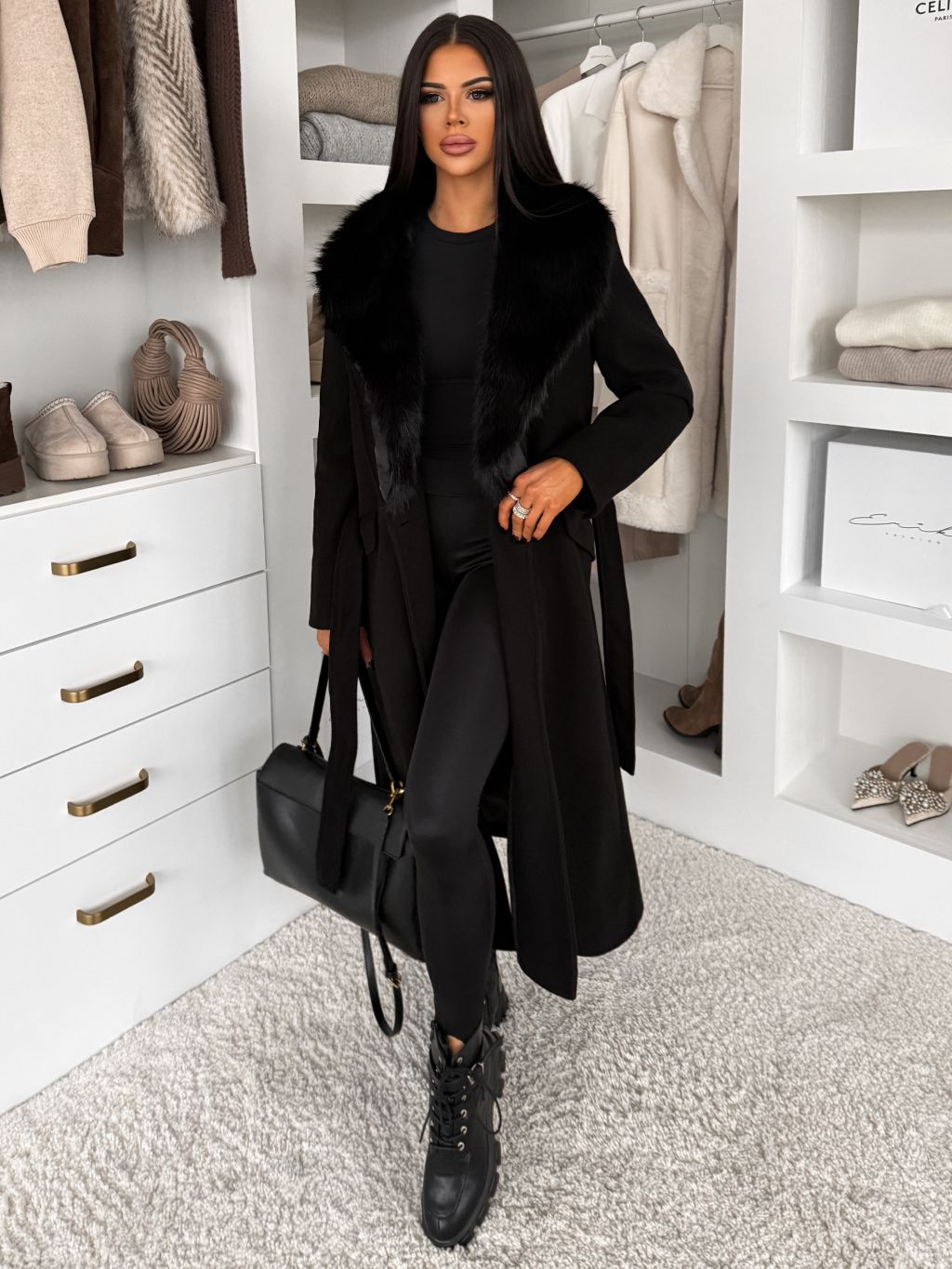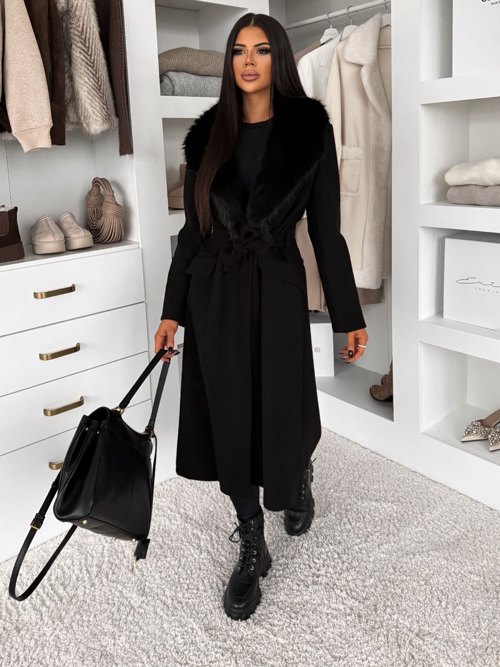 Čierny elegantný dlhý kabát ROSIEL s kožušinkou
