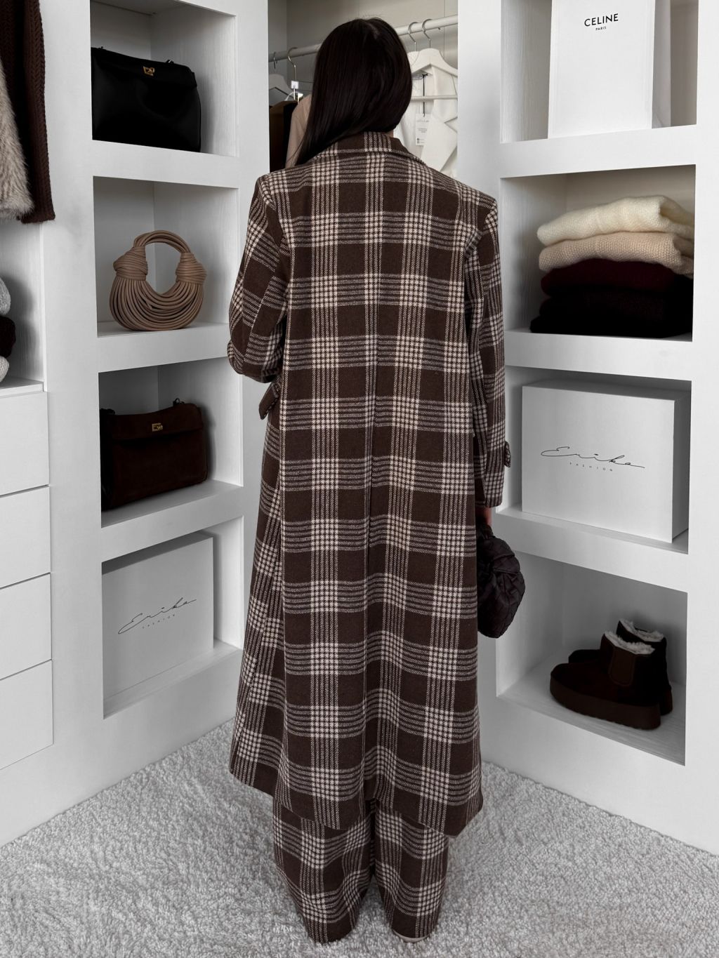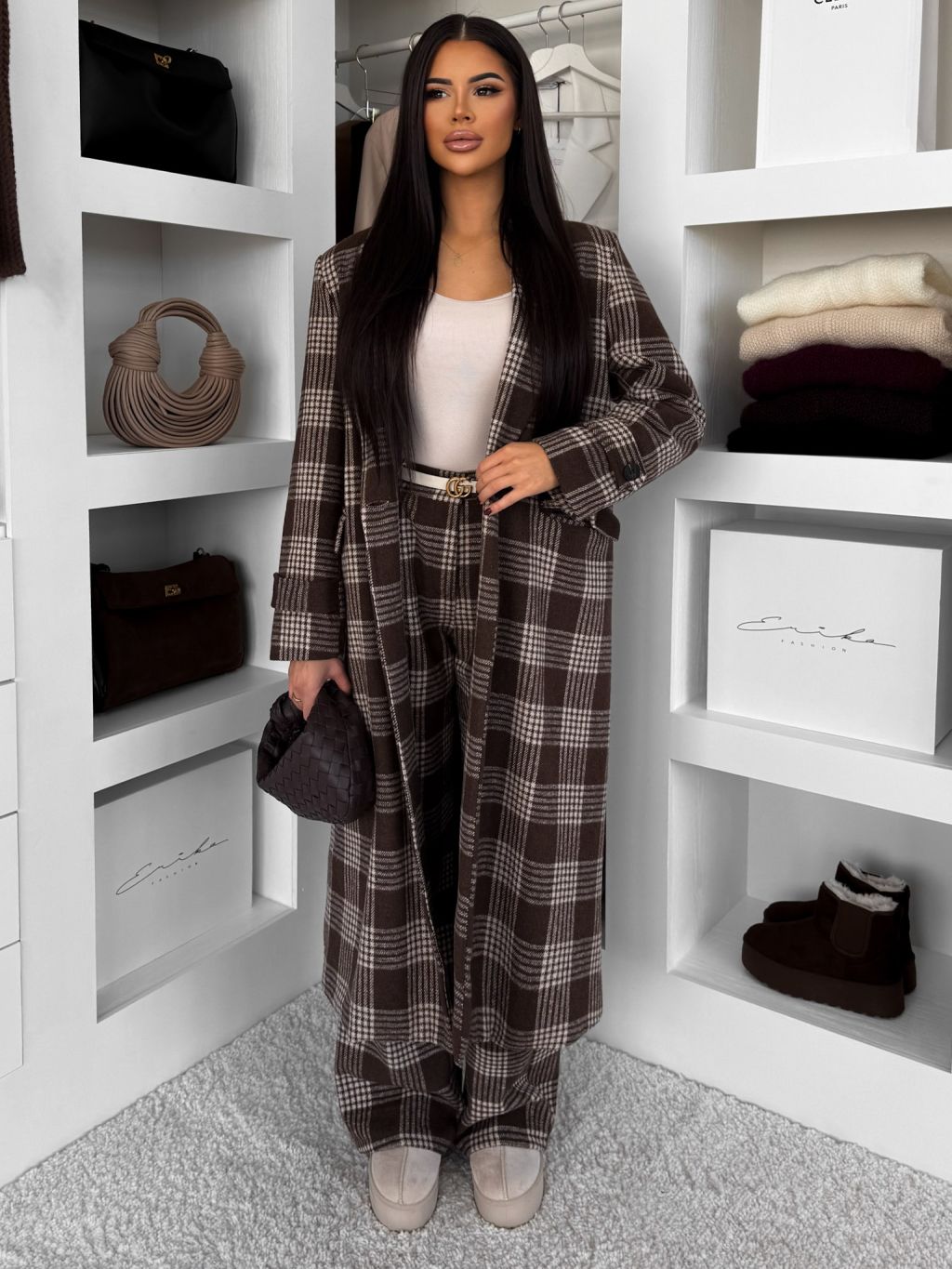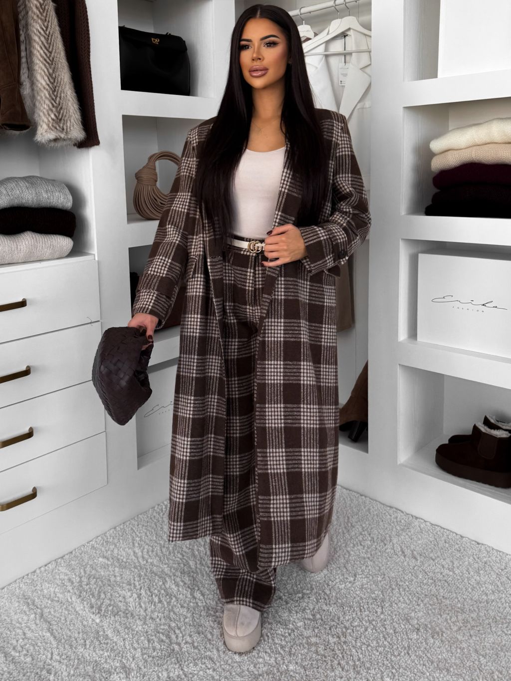 Hnedý kockovaný károvaný dlhý kabát OPHELYN