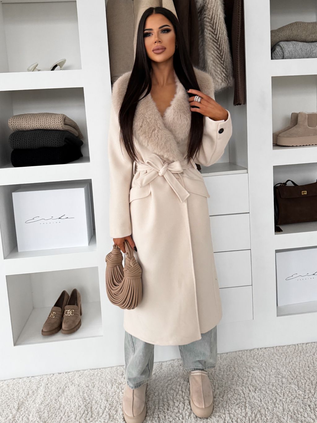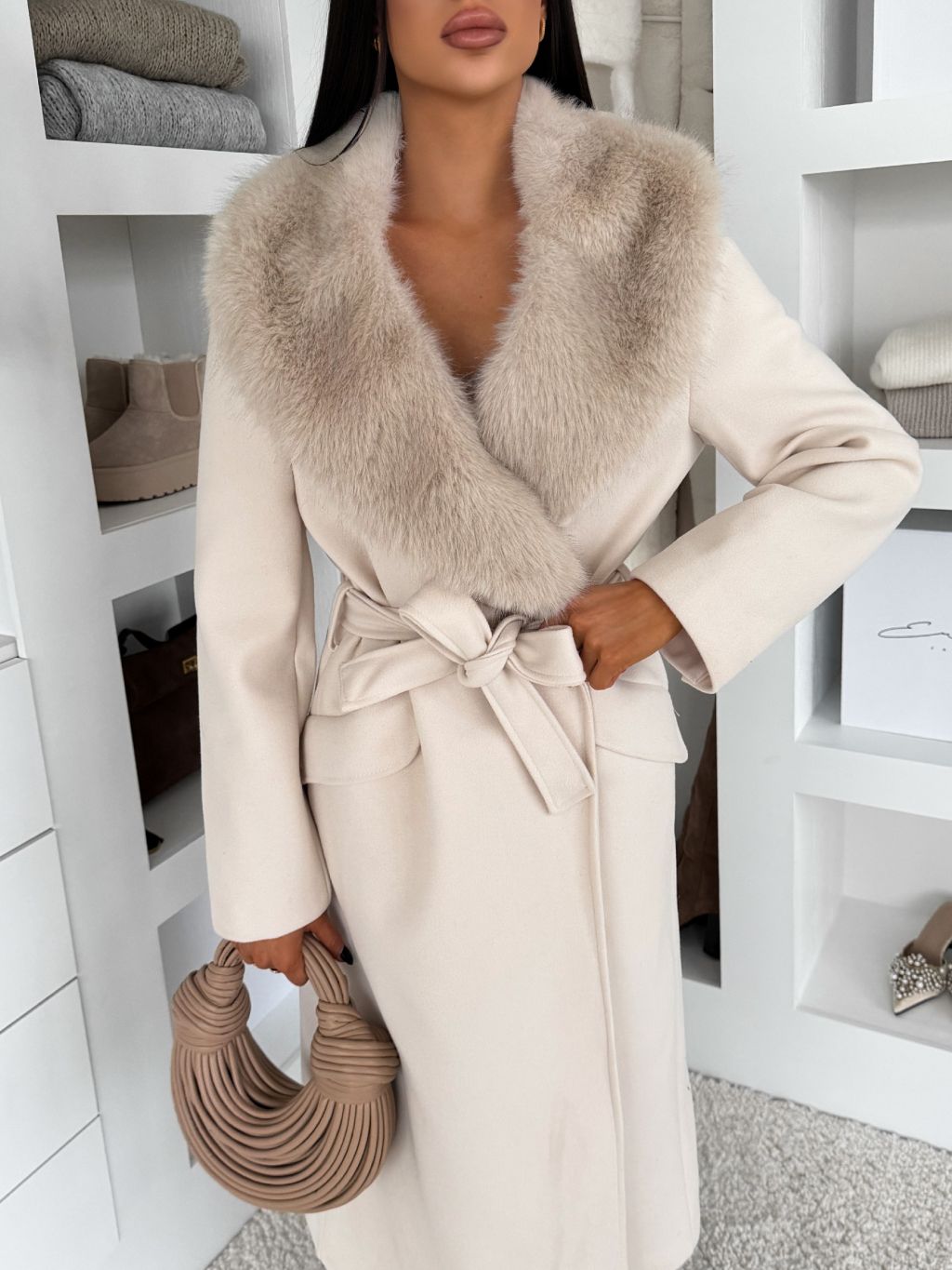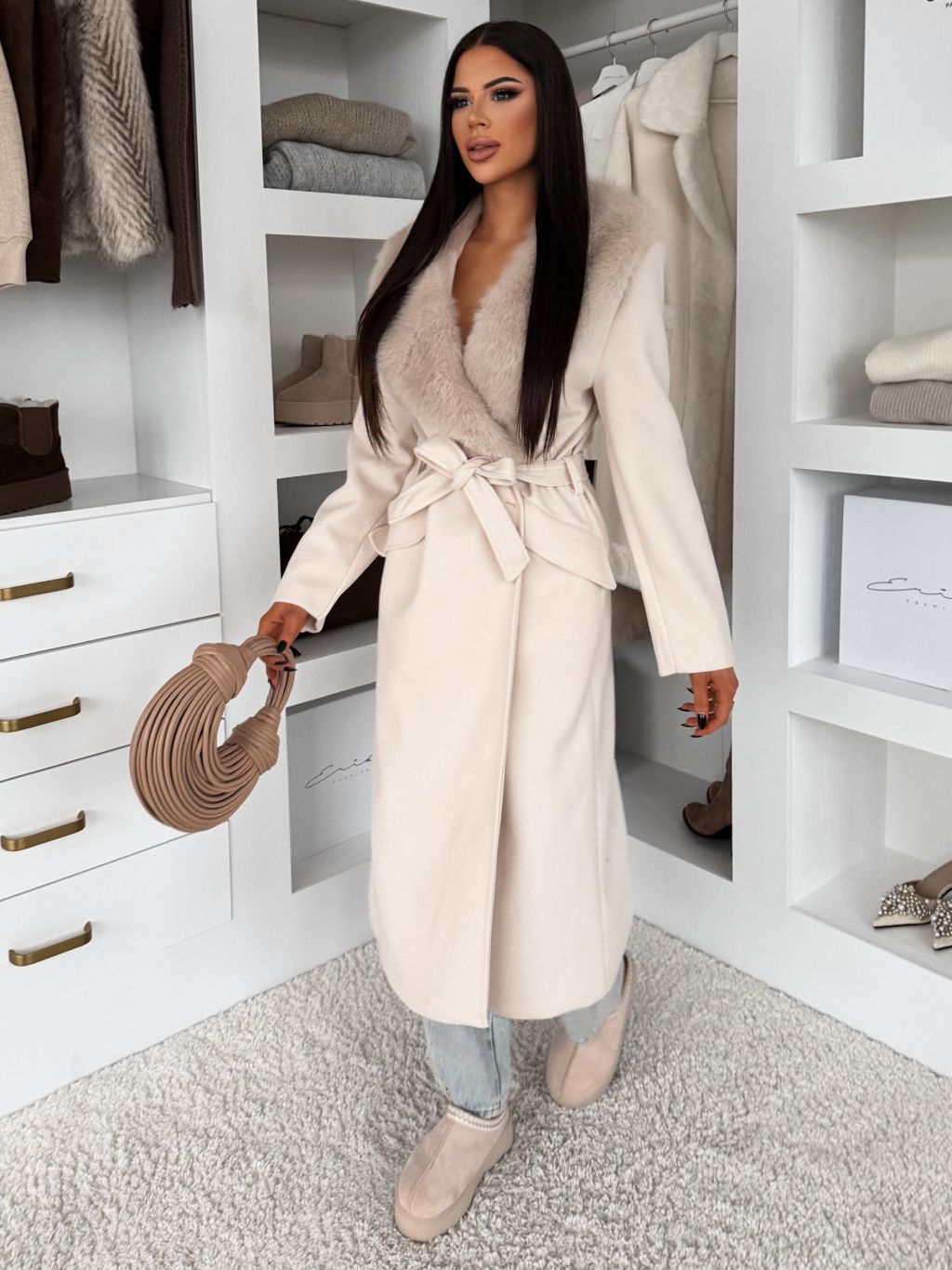 Krémový elegantný dlhý kabát ROSIEL s kožušinkou