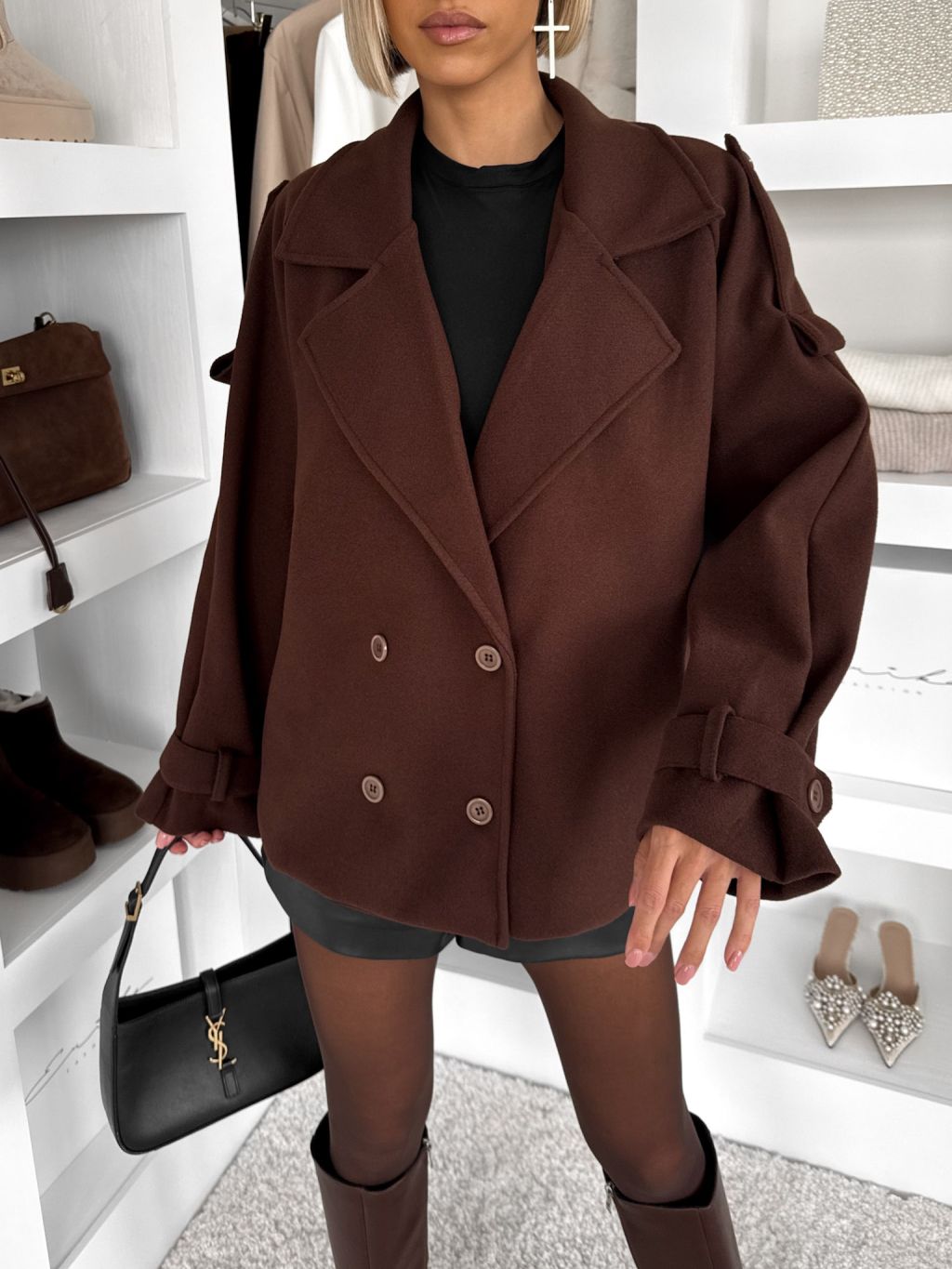 Tmavo hnedý elegantný kabát VELINNE