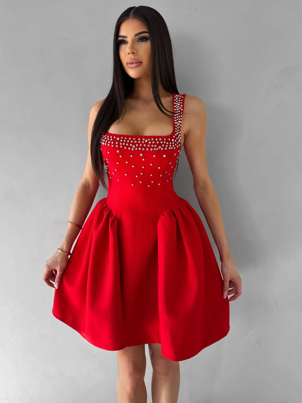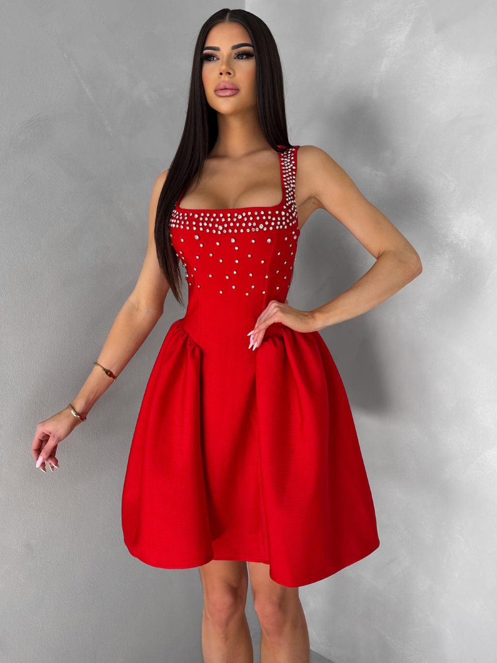 Červené krátke vypasované áčkové šaty MIRELYS s kamienkami