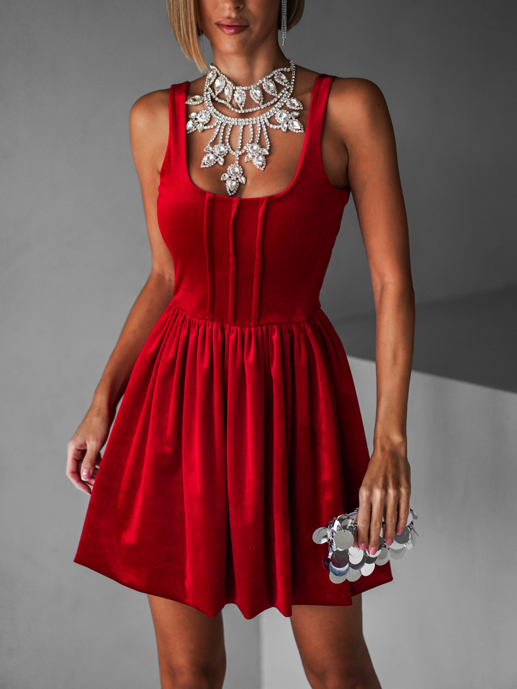 Červené krátke zamatové vypasované šaty KALLIAS