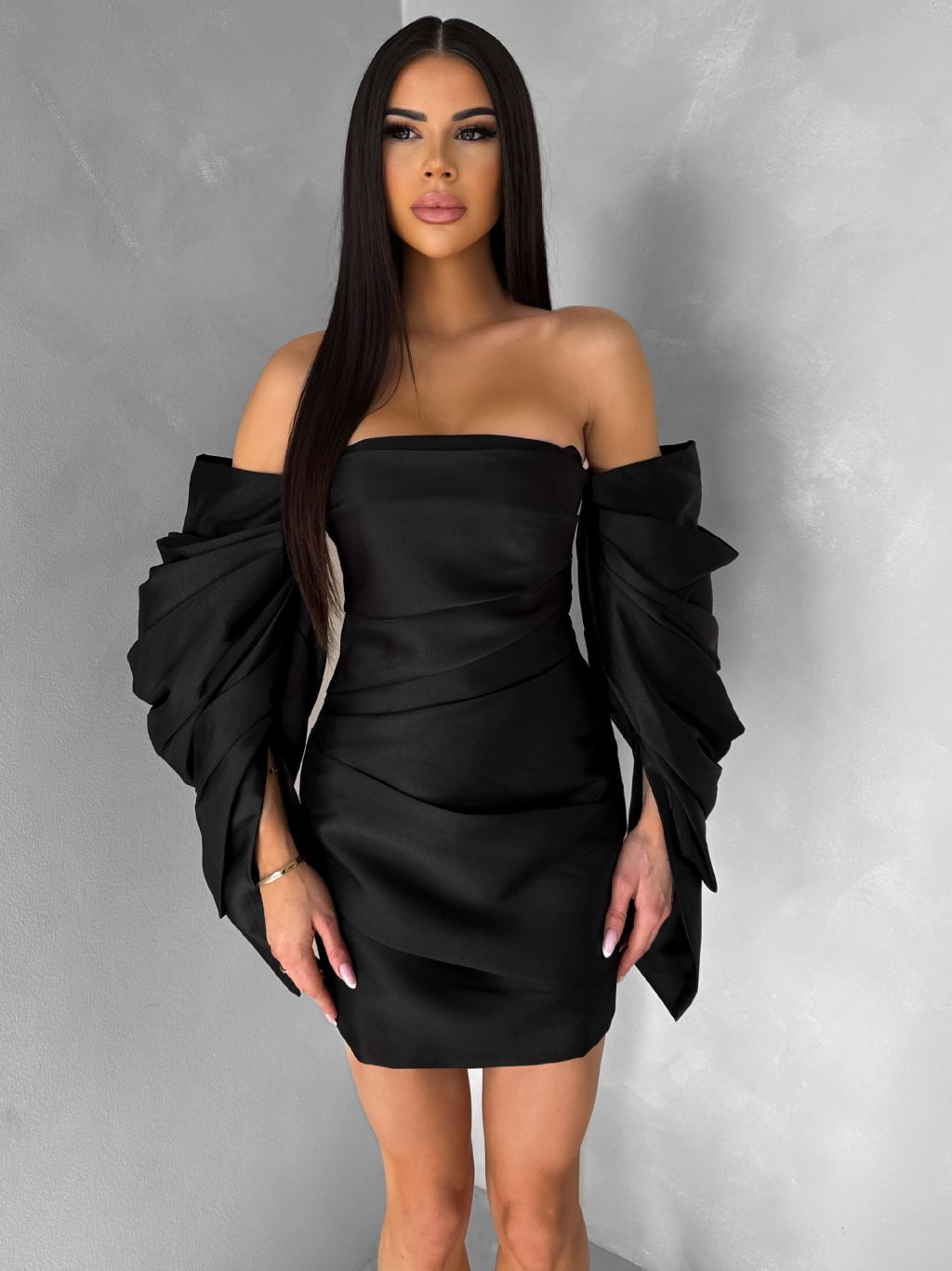 Čierne kokteilové mini šaty TUVIANA s naberanými rukávmi