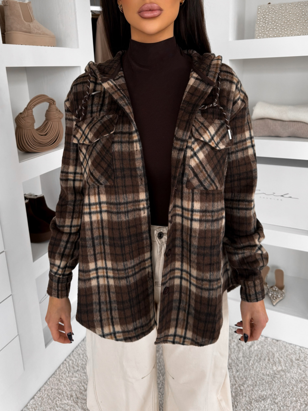 Hnedá kockovaná károvaná košeľa RUSTIC s kapucňou
