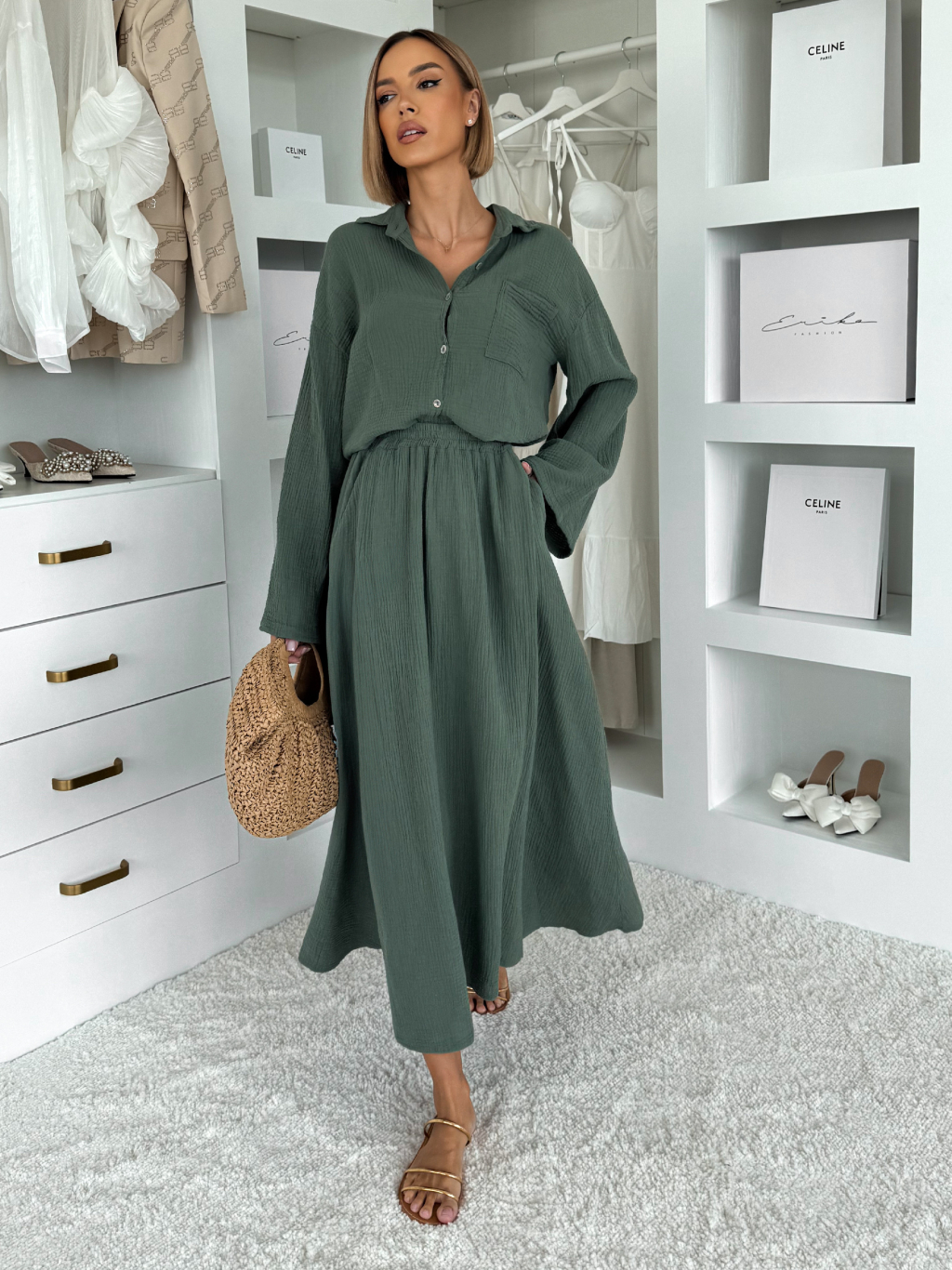 Kaki mušelínový košeľový komplet BELIANE so sukňou