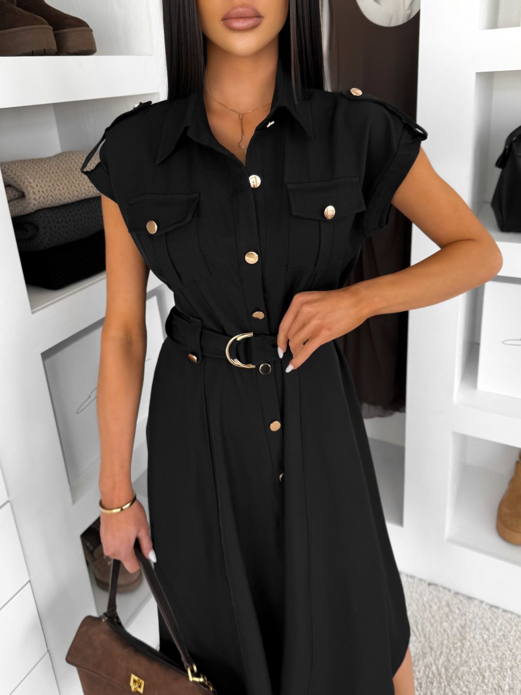 Čierne košeľové dlhé šaty VEXTURA s gombíkmi