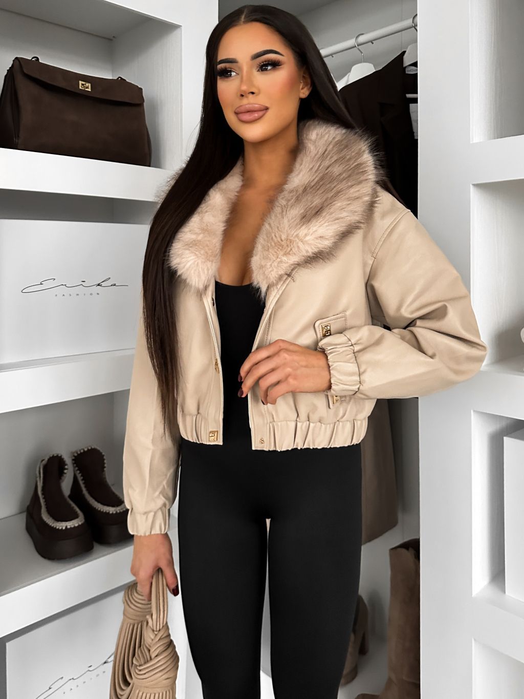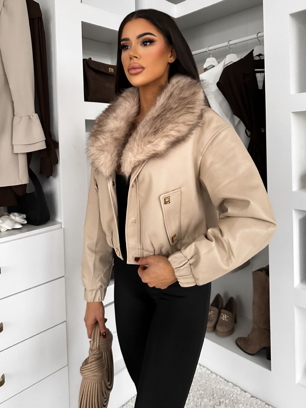 Béžová koženková bunda VERNALIS s kožešinkou (Veľkosť L)