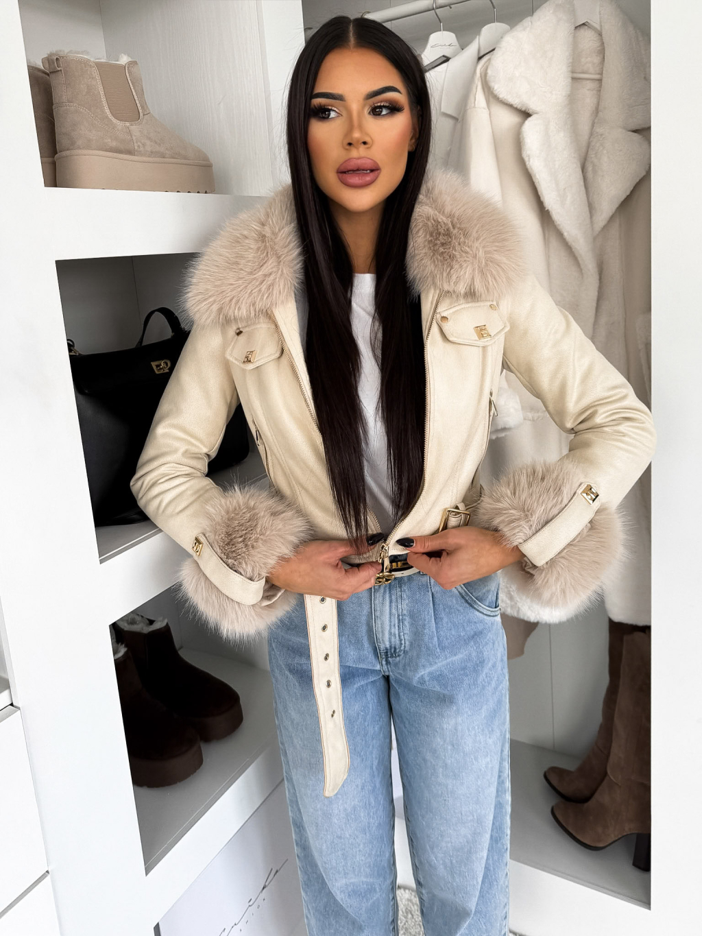 Krémová krátka biker bunda EMBRILA s kožušinkou