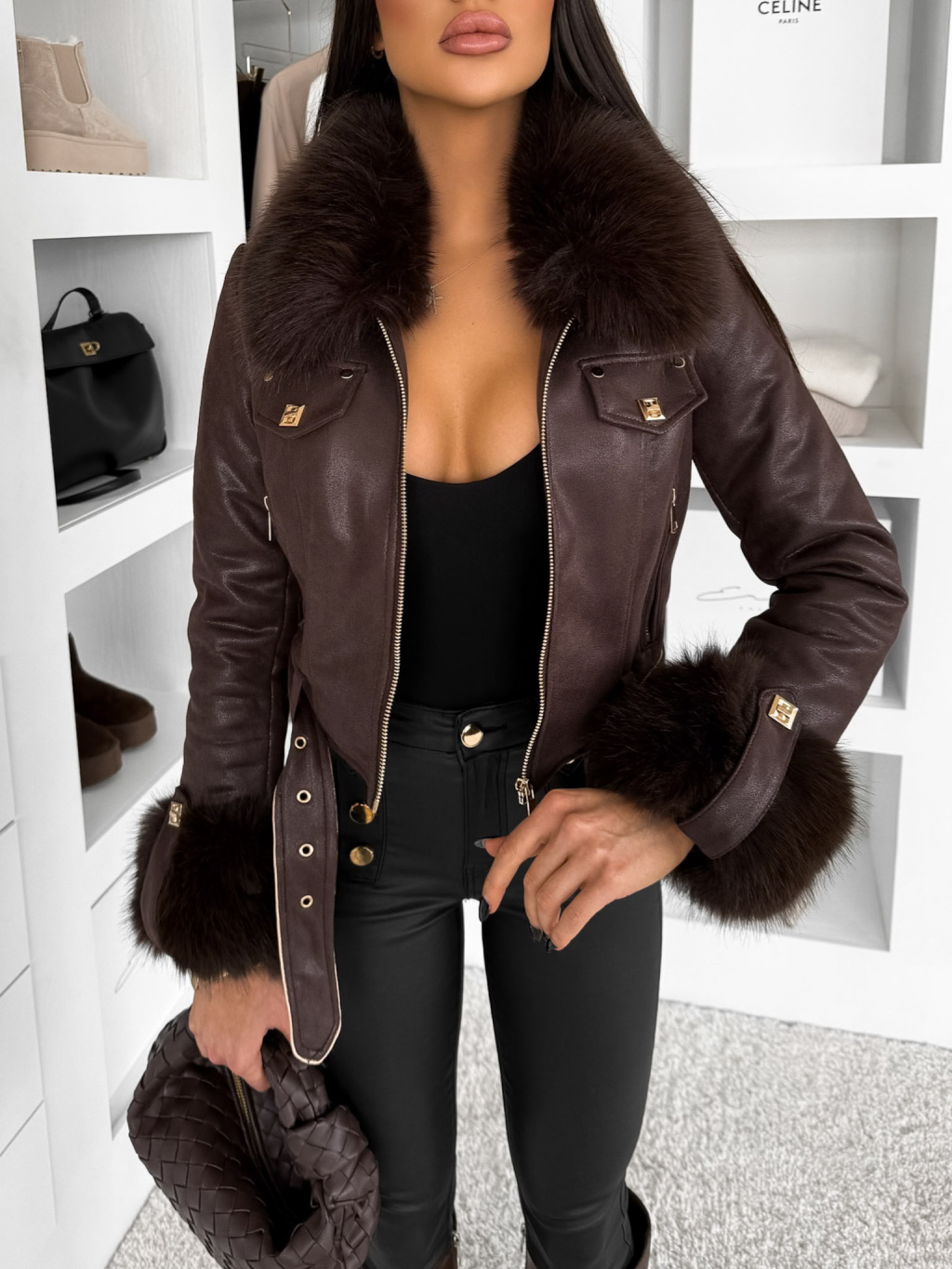 Tmavo hnedá krátka biker bunda EMBRILA s kožušinkou