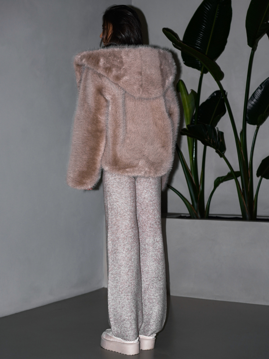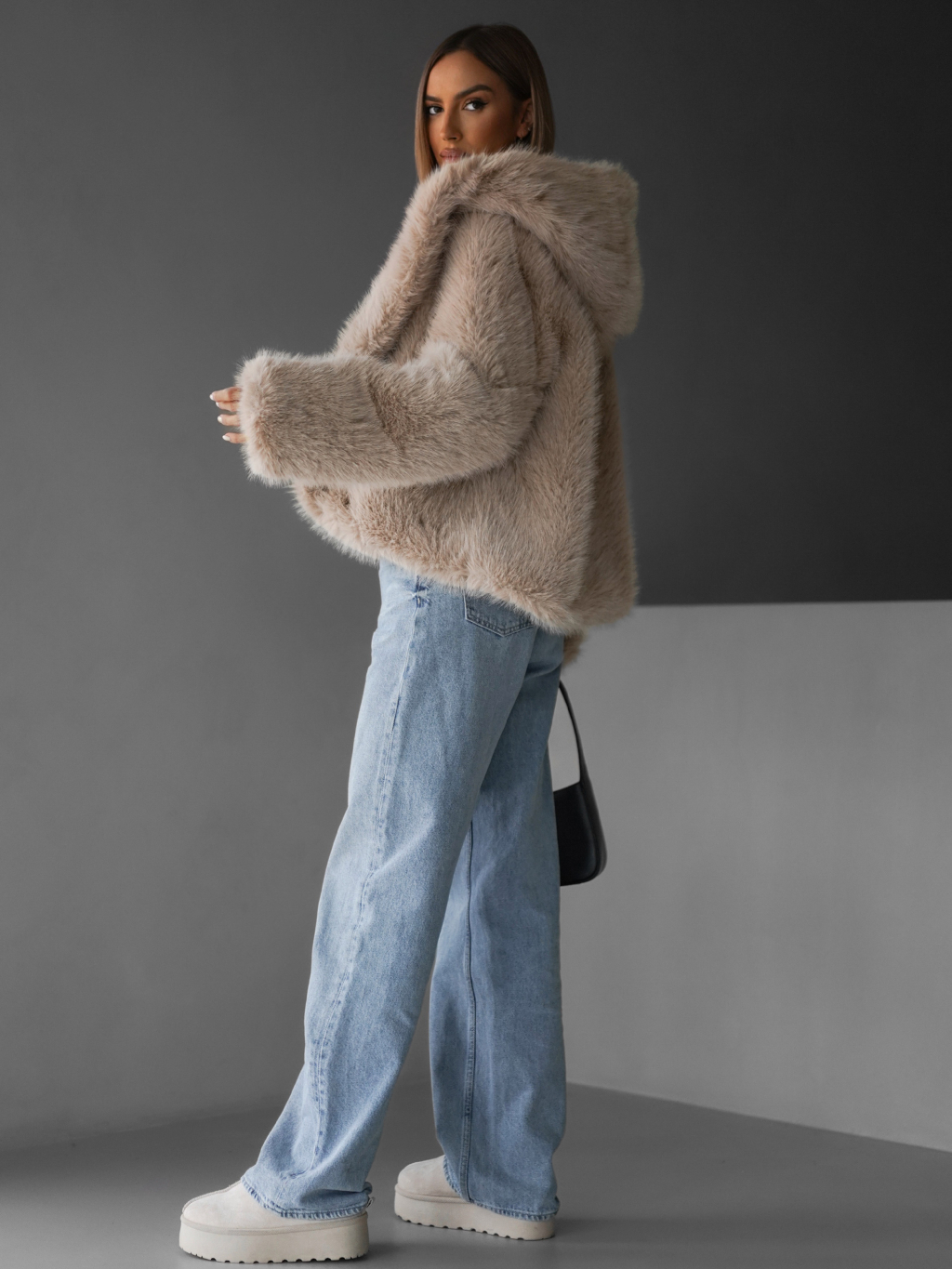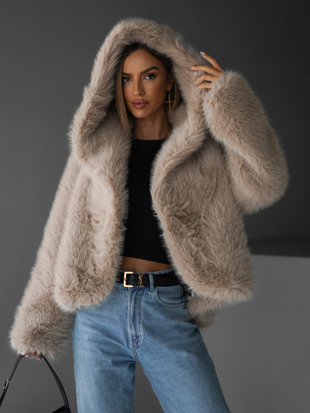Béžový faux fur kožušinový kabát kožuch IBISA s kapucňou