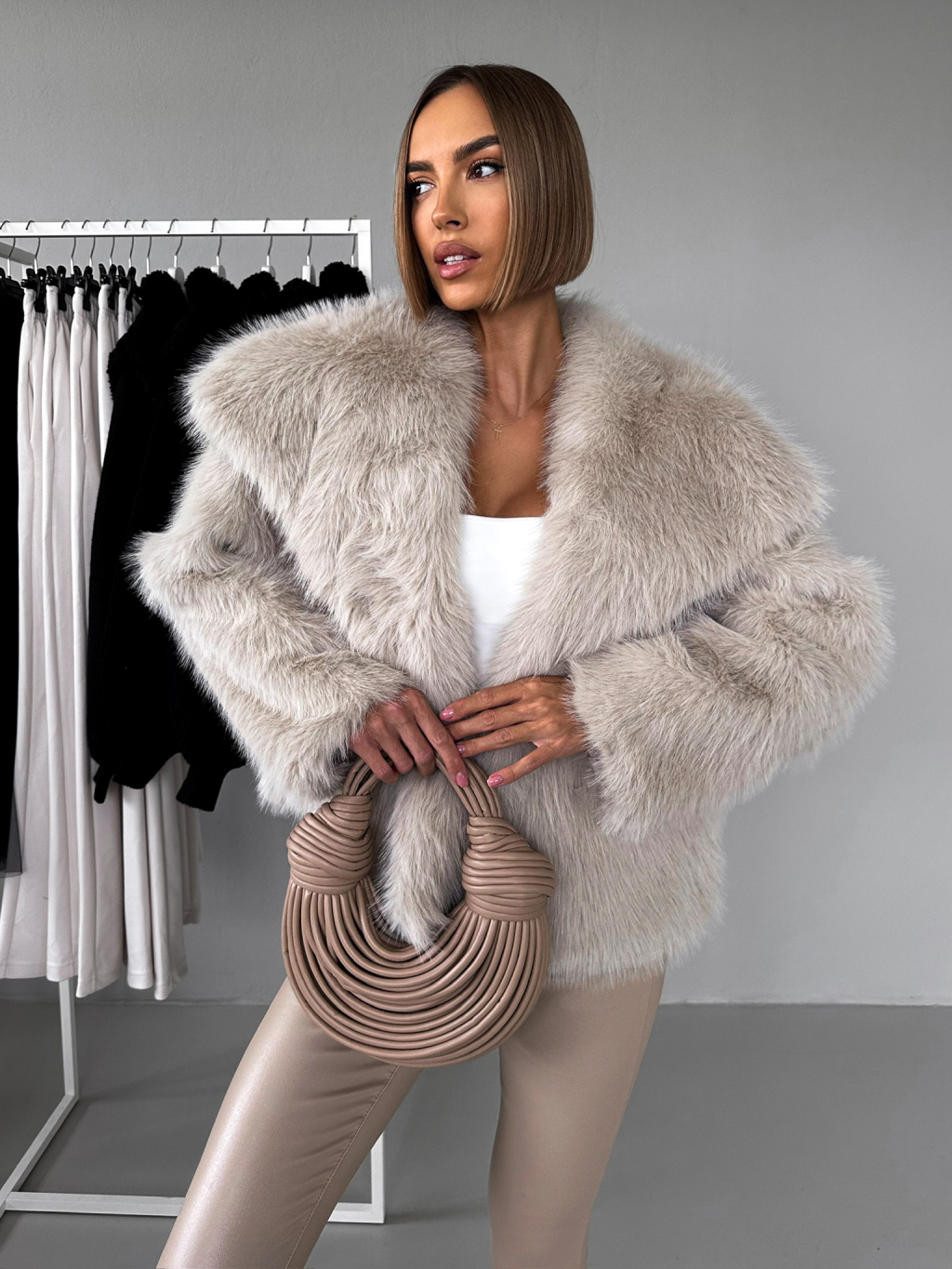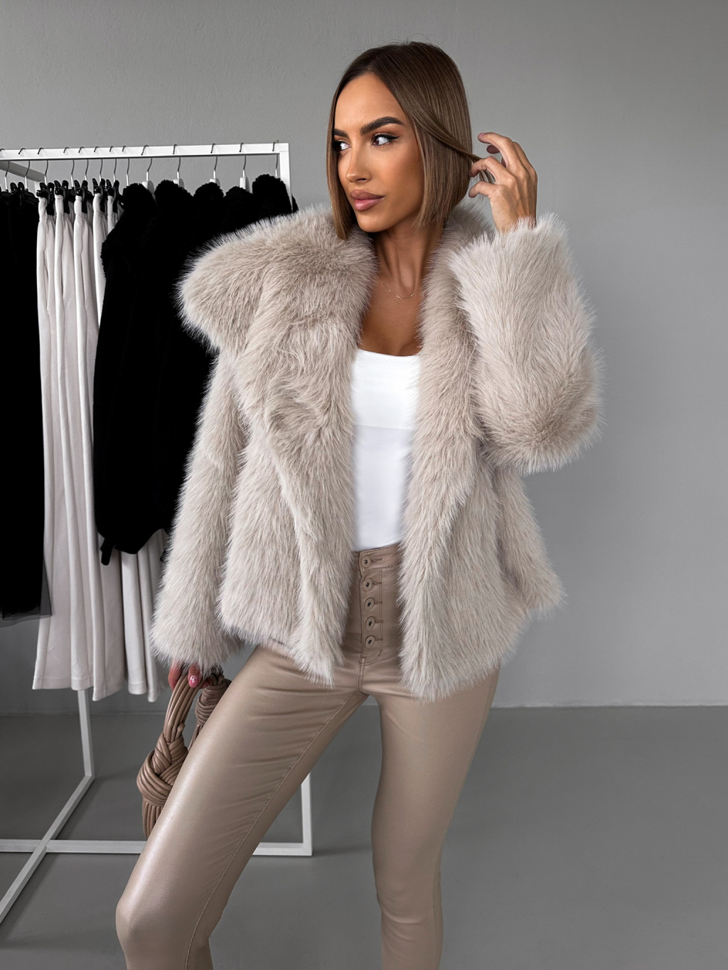 Béžový krátky faux fur kožušinový kabátik HILARI