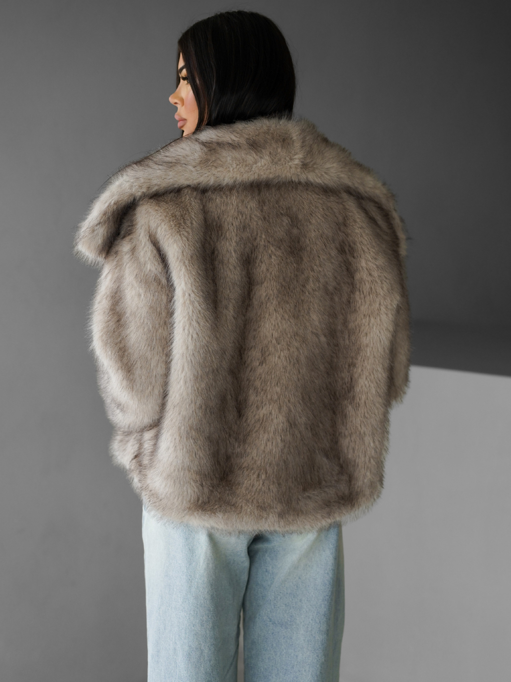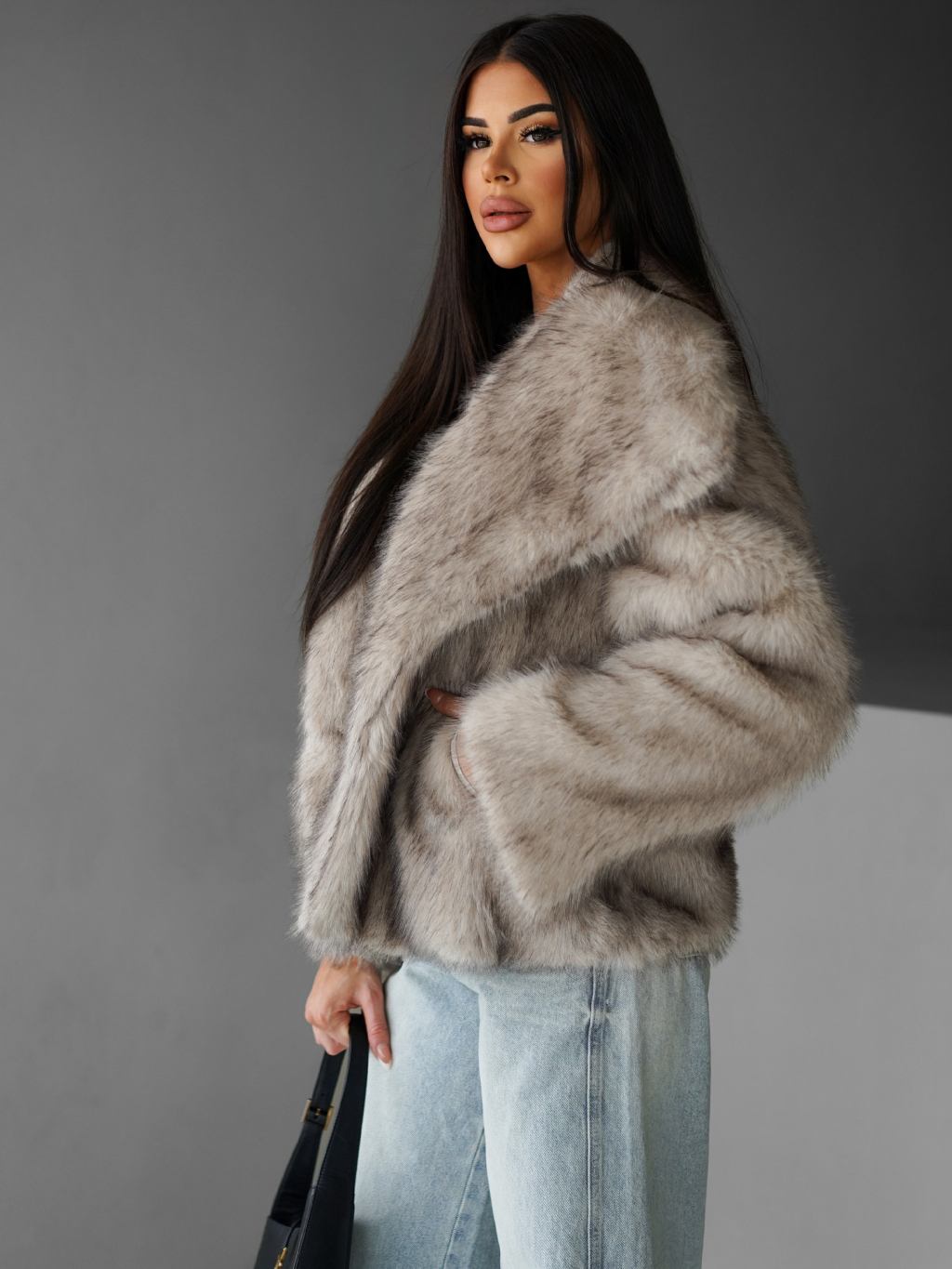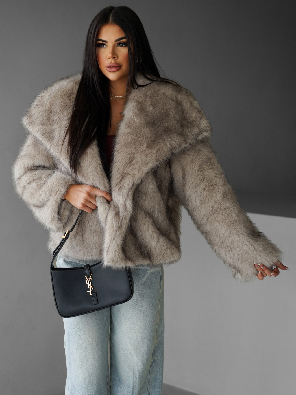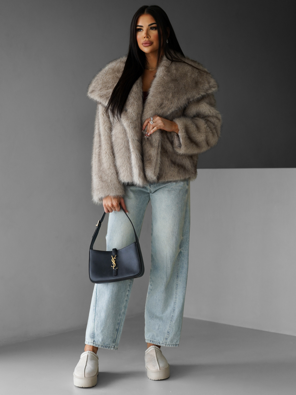 Béžový krátky faux fur kožušinový kabátik MIRTILL s golierom
