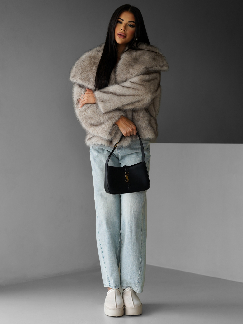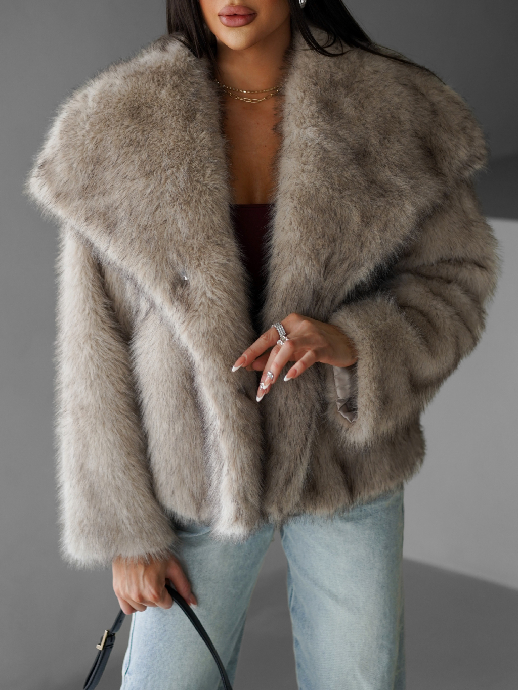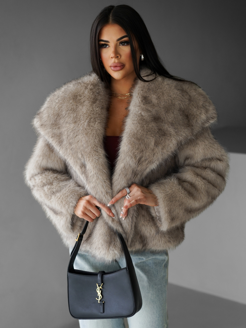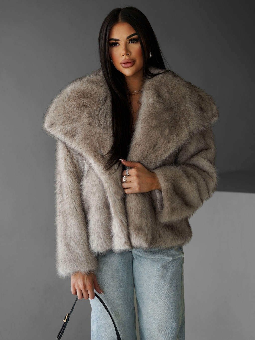 Béžový krátky faux fur kožušinový kabátik MIRTILL s golierom
