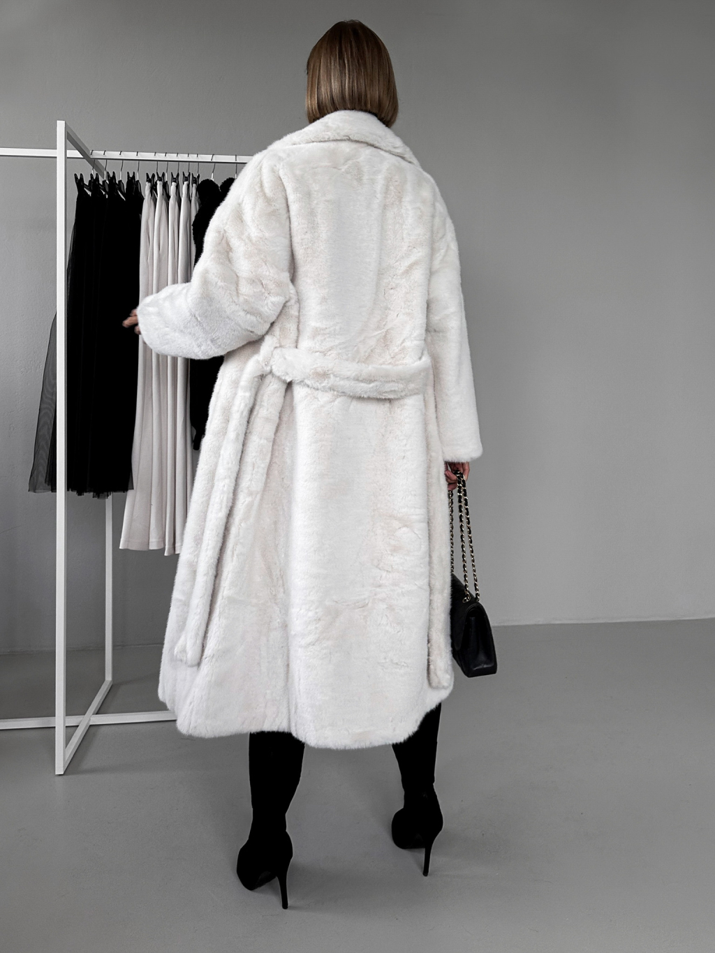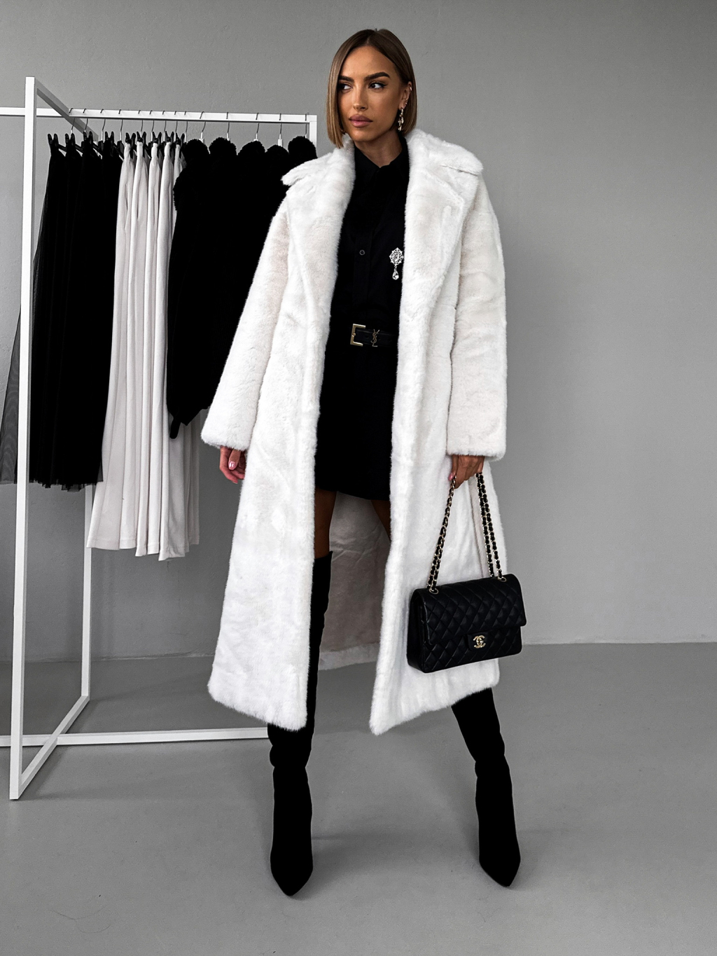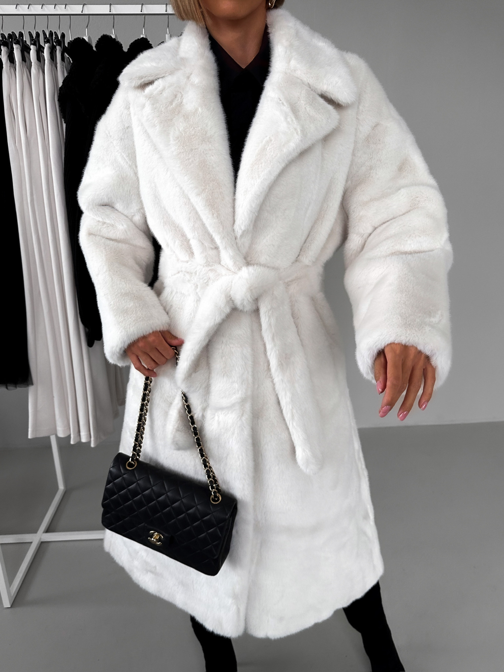 Biely dlhý faux fur kožušinový kabát NARCISA s opaskom