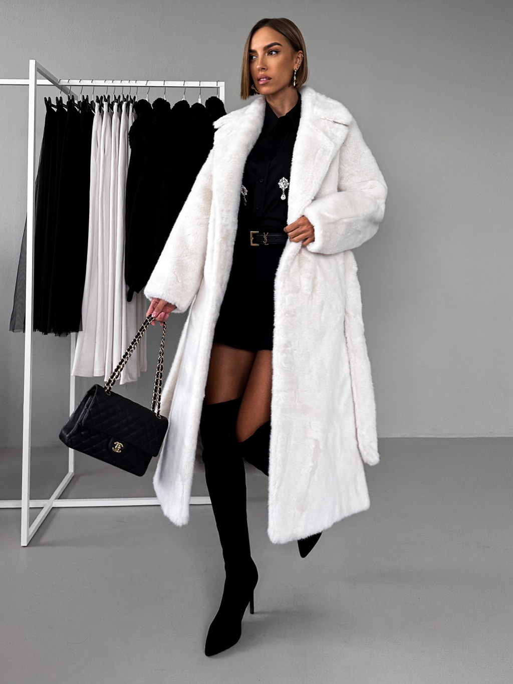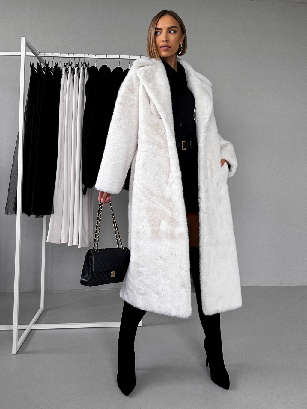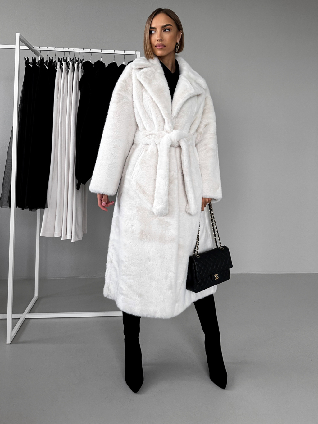 Biely dlhý faux fur kožušinový kabát NARCISA s opaskom