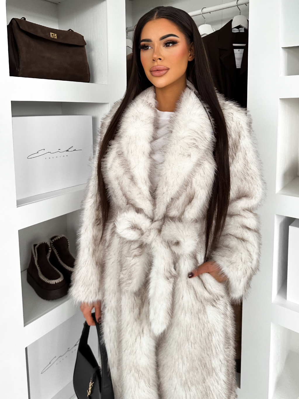 Biely dlhý faux fur kožušinový kabát SERALYN s opaskom a golierom