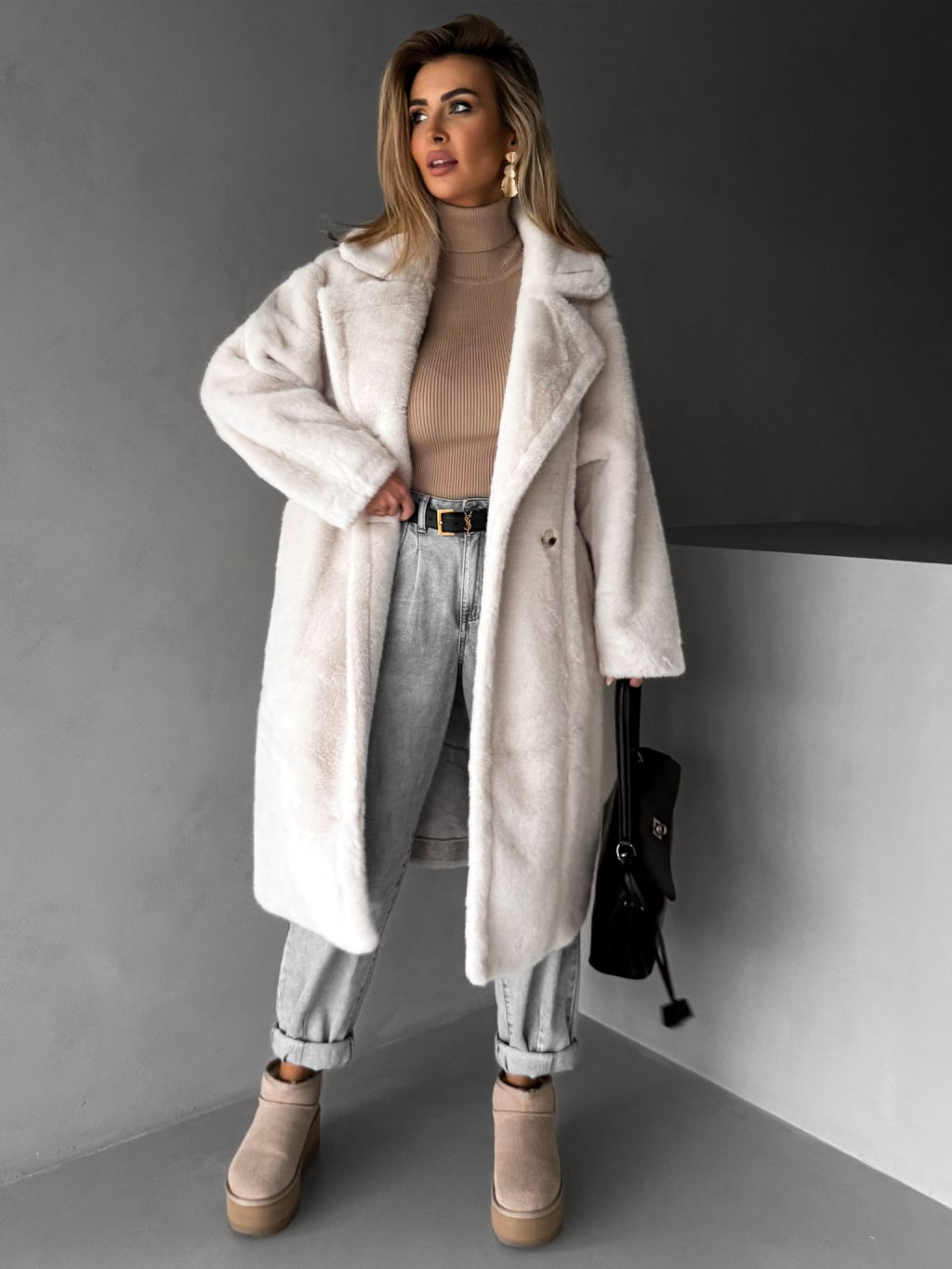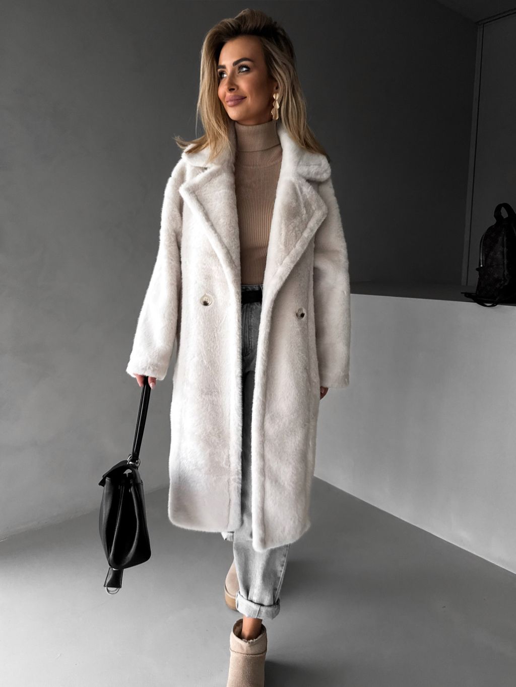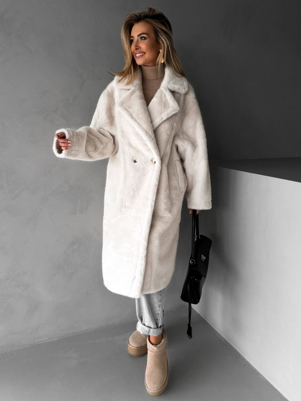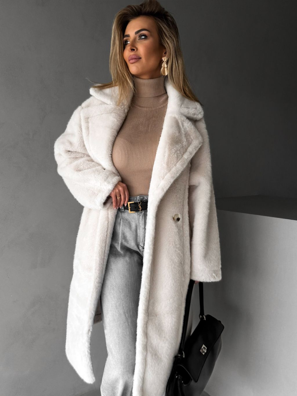 Biely dlhý teddy kabát ZOLTAR s golierom