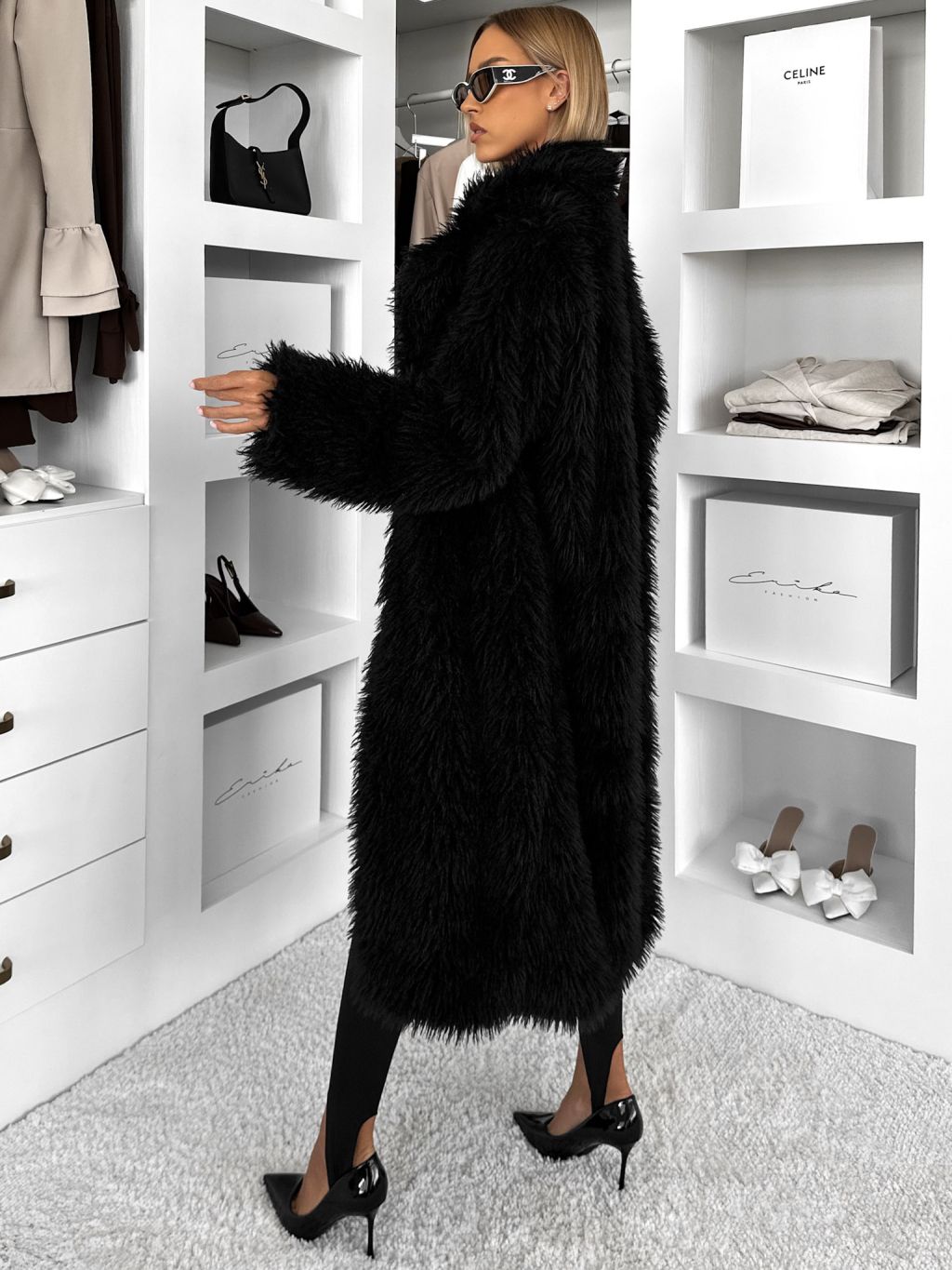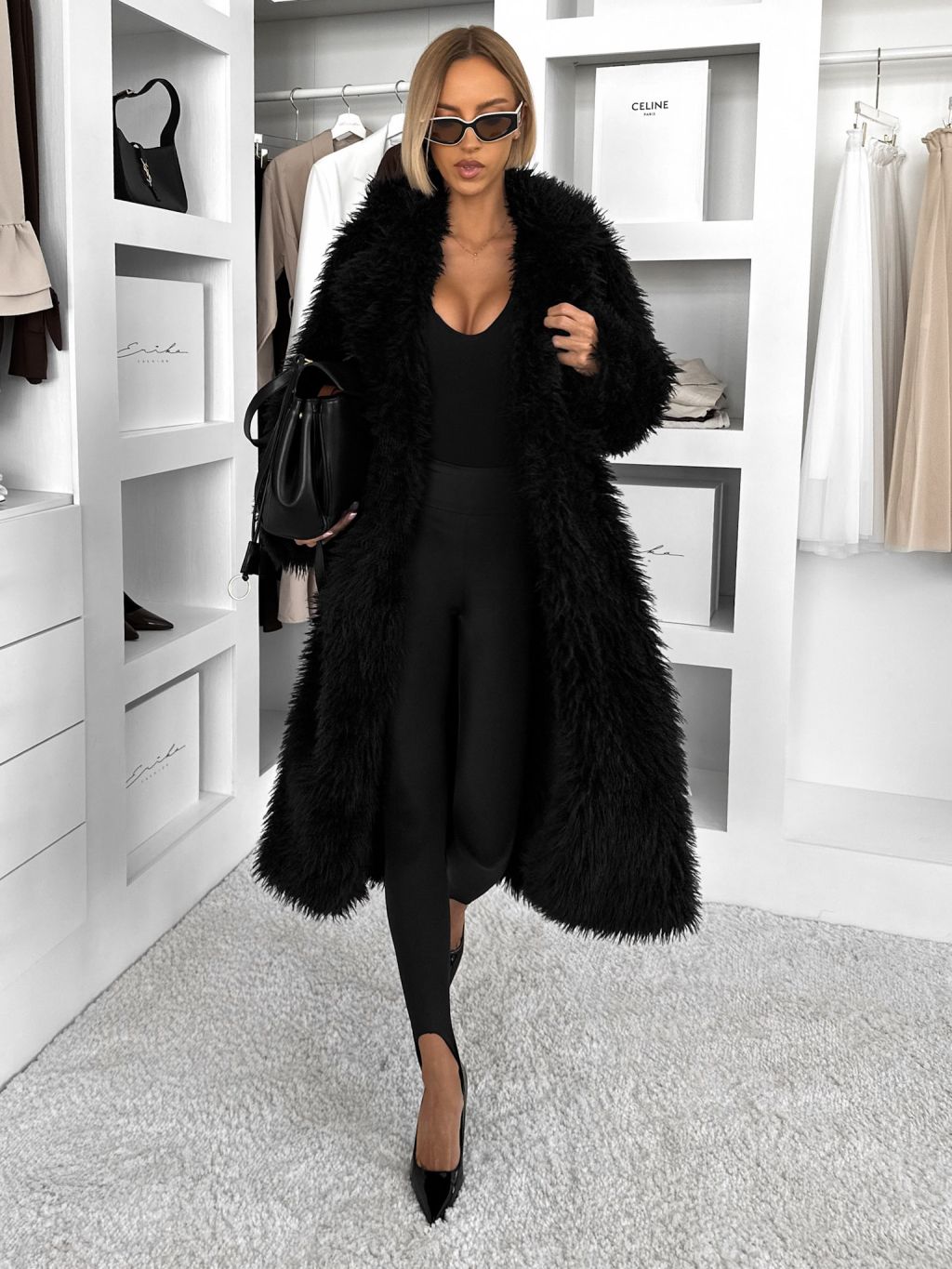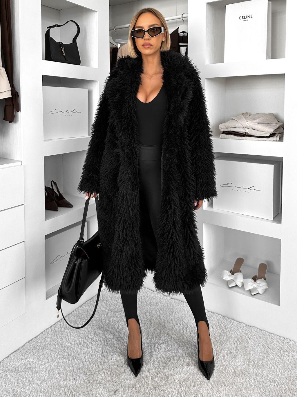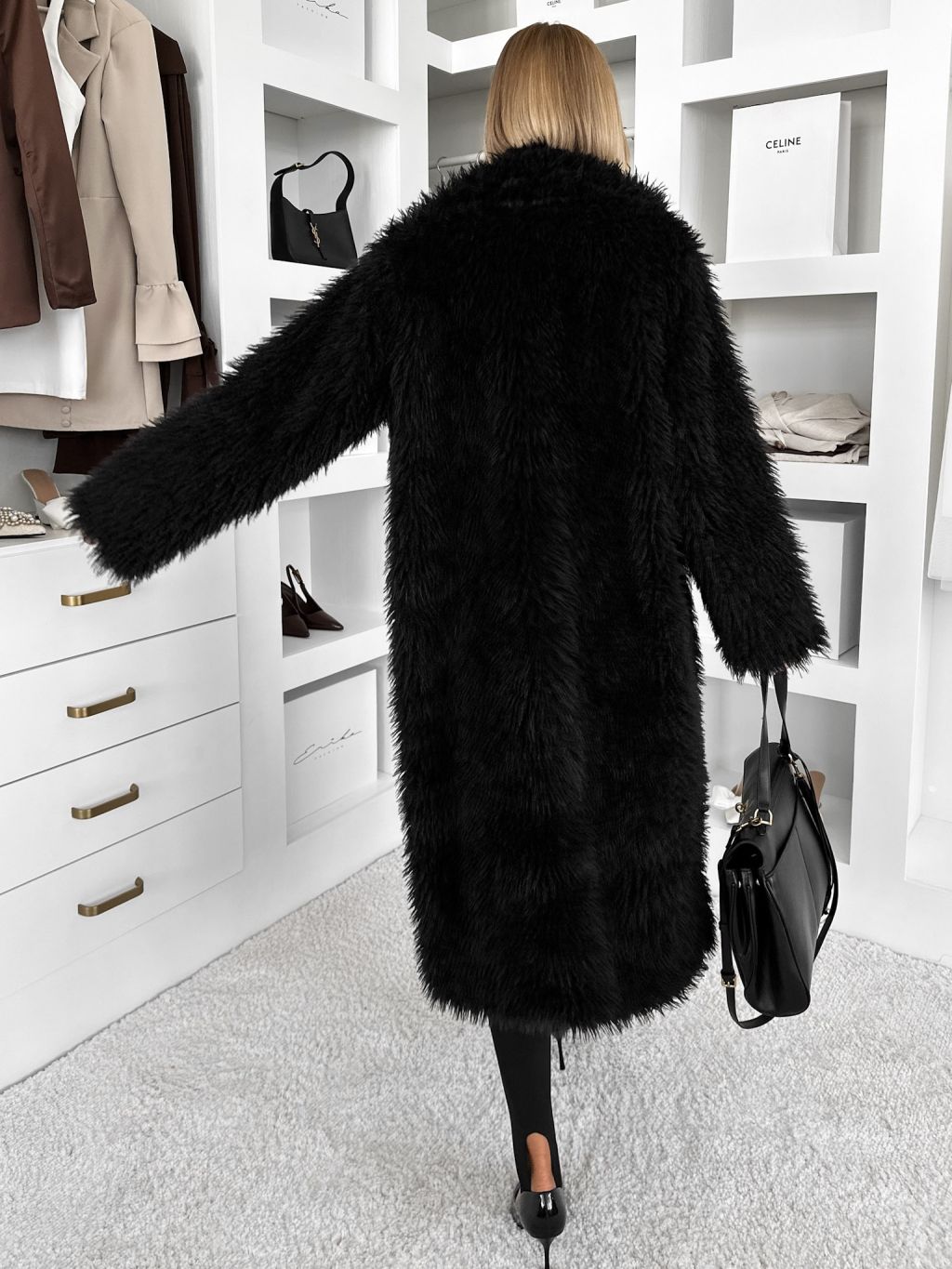Čierny faux fur dlhý kožušinový kabát HOAIN