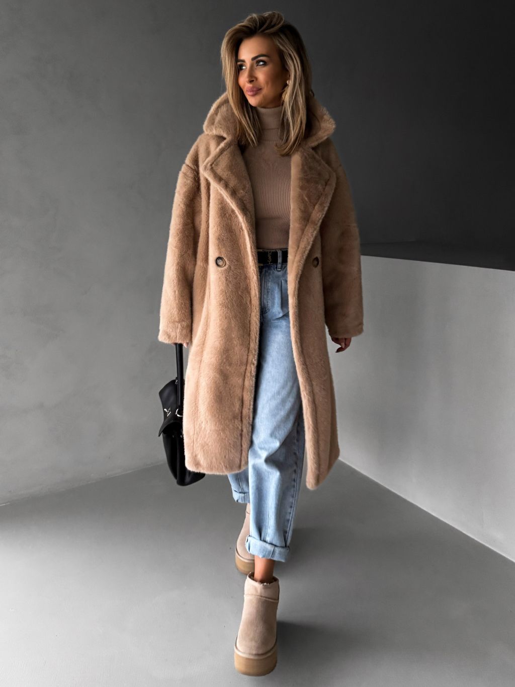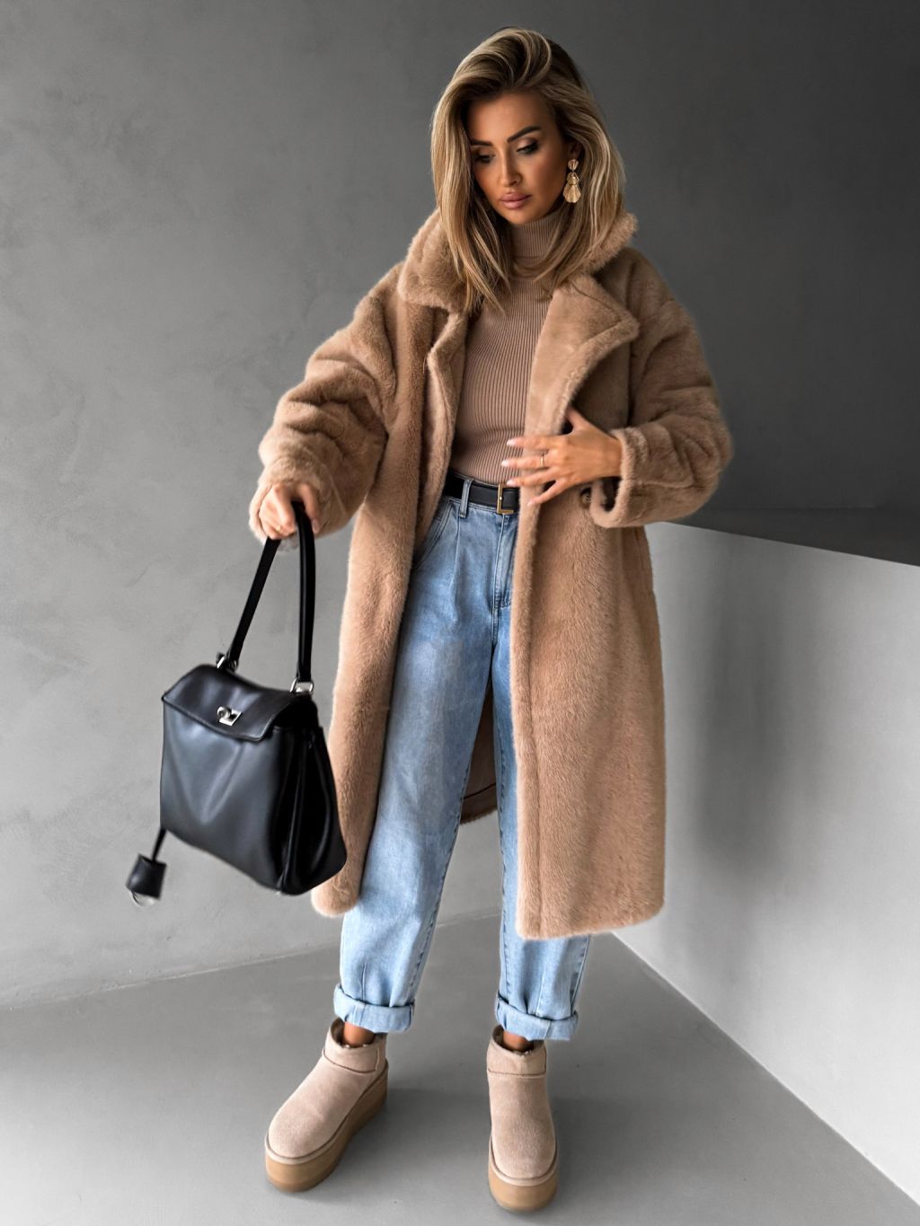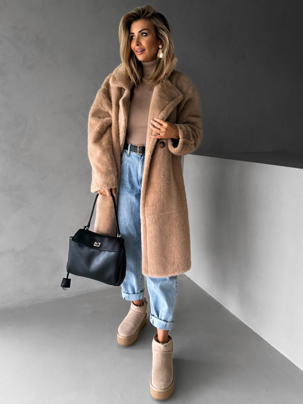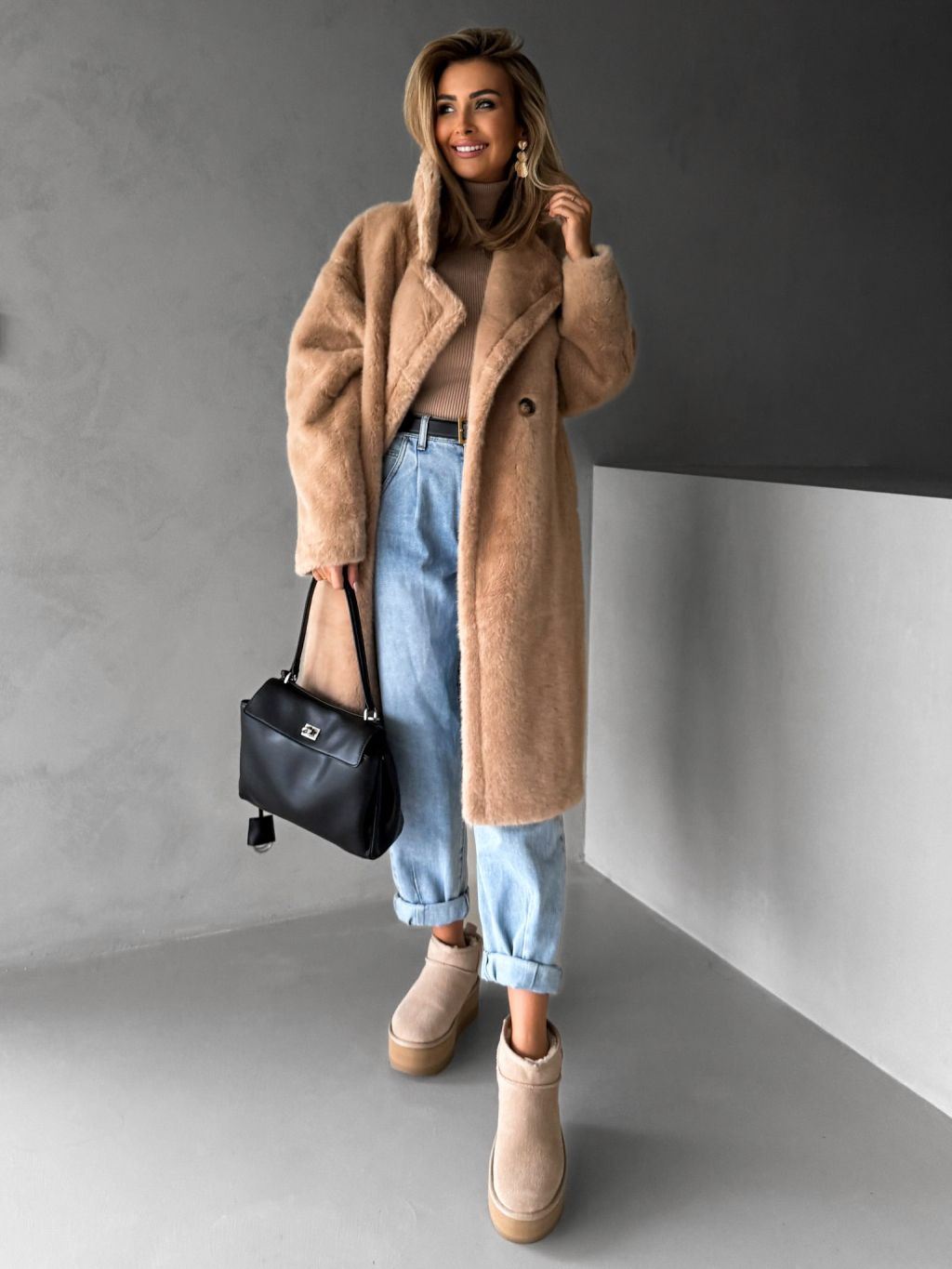 Hnedý dlhý teddy kabát ZOLTAR s golierom