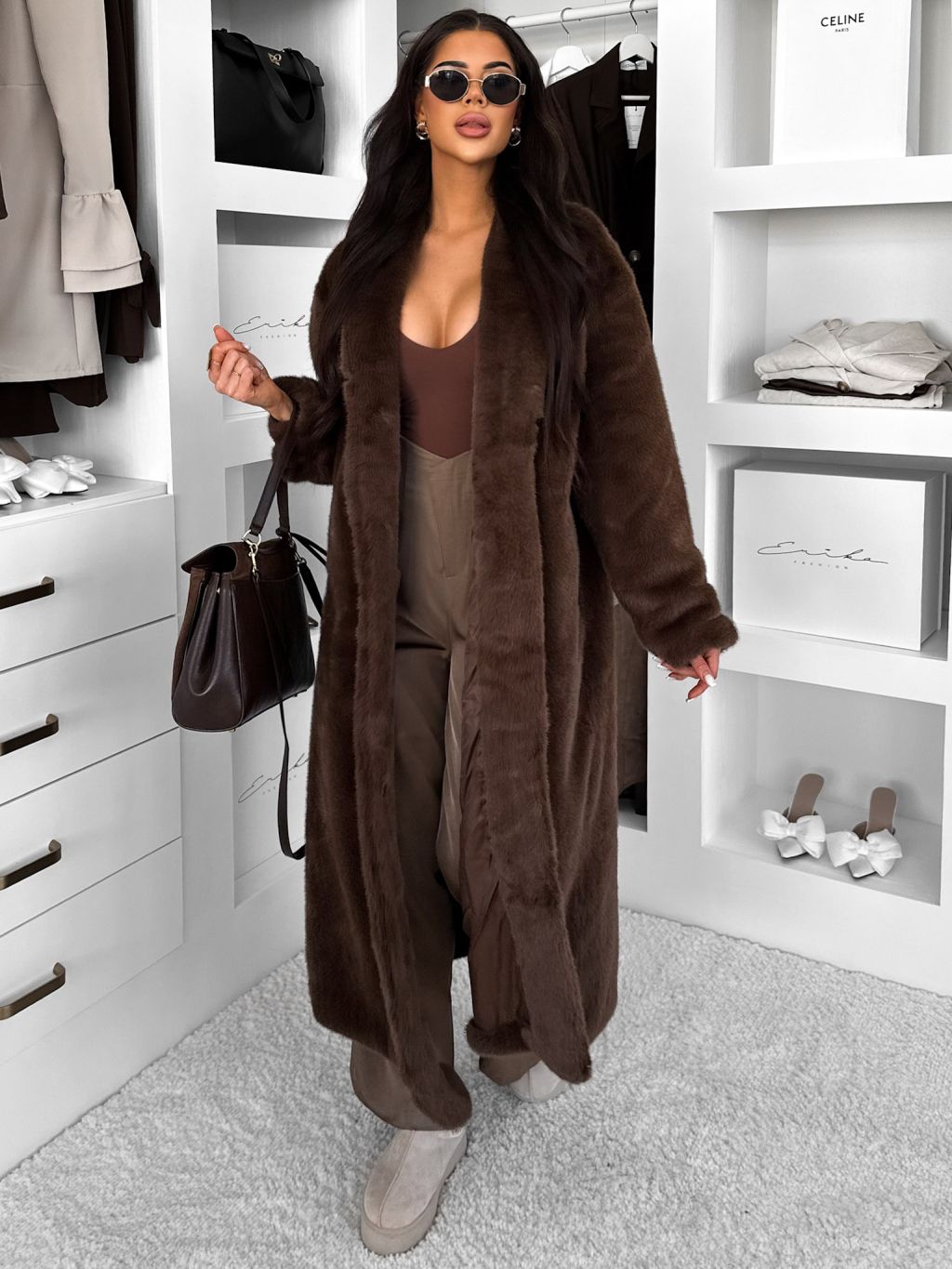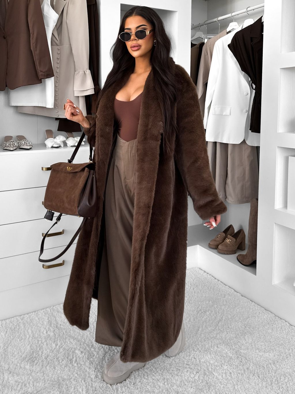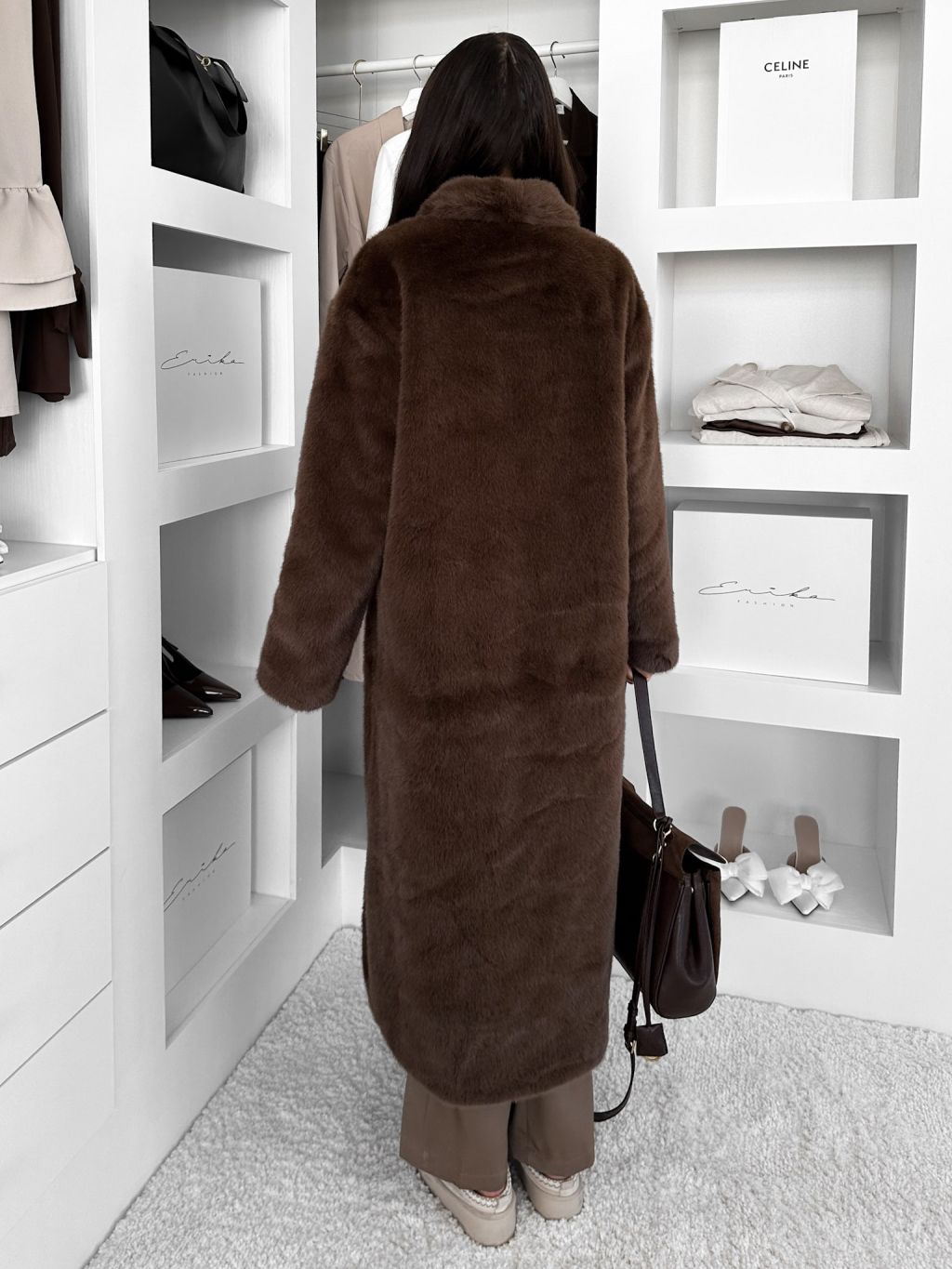 Hnedý faux fur dlhý kožušinový plyšový kabát MINHA