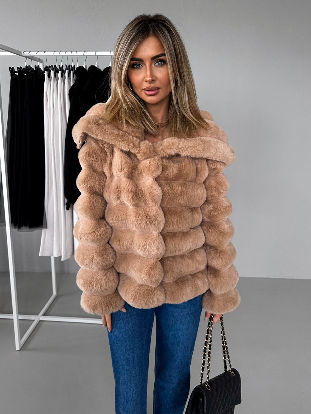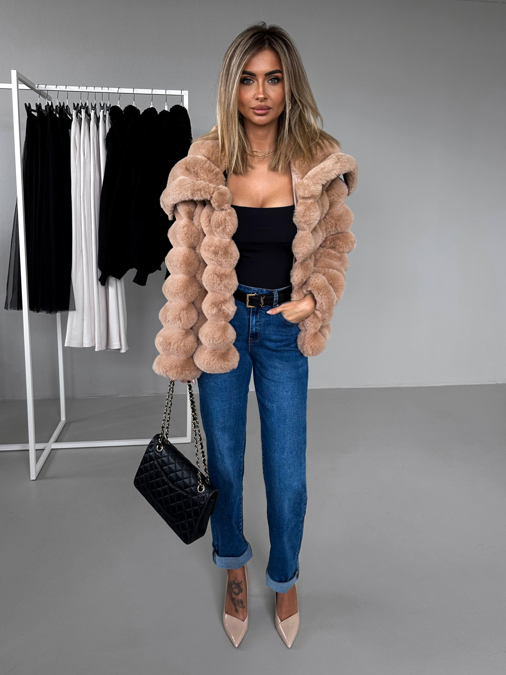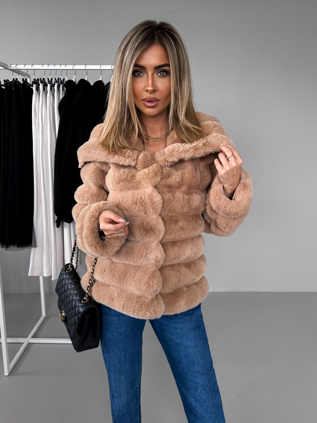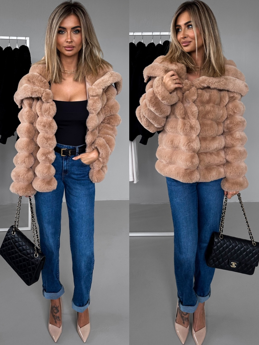 Hnedý krátky faux fur kožušinový kabát MOUNA