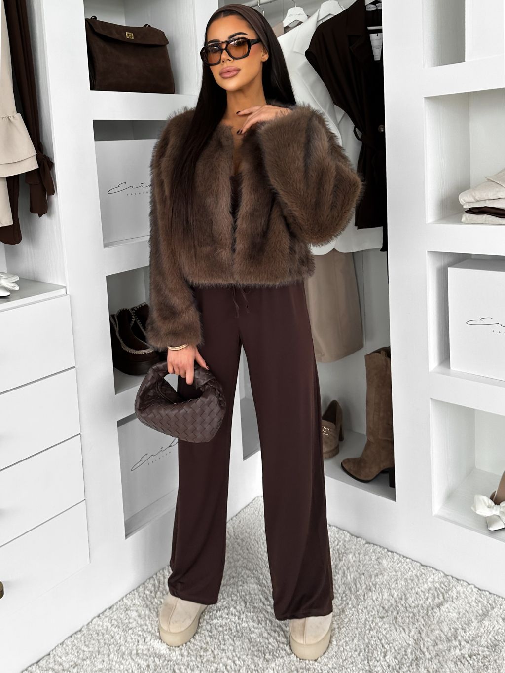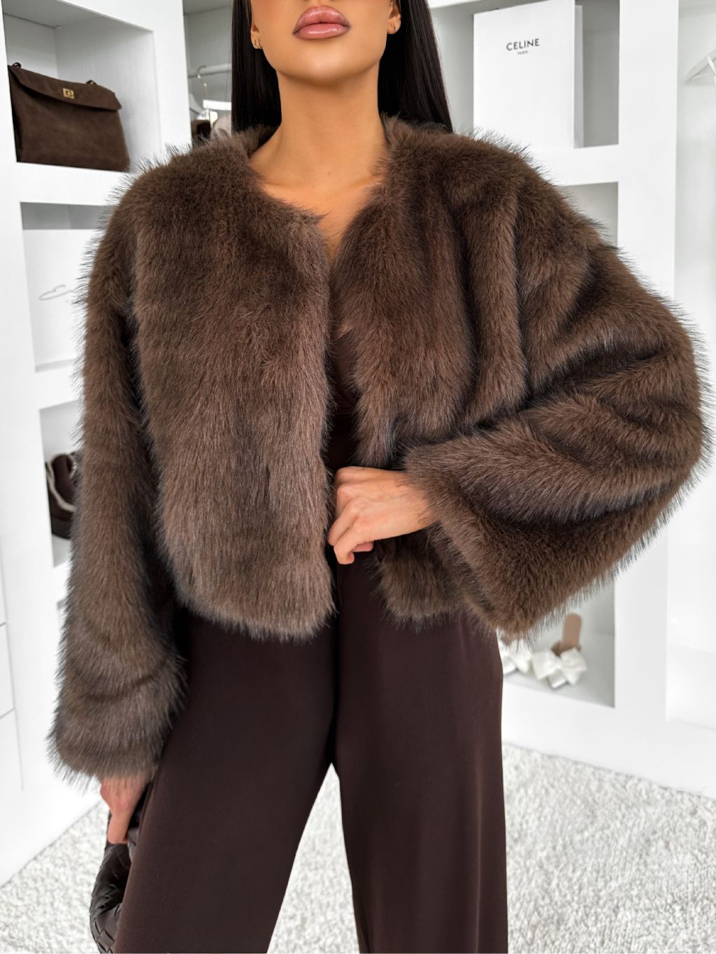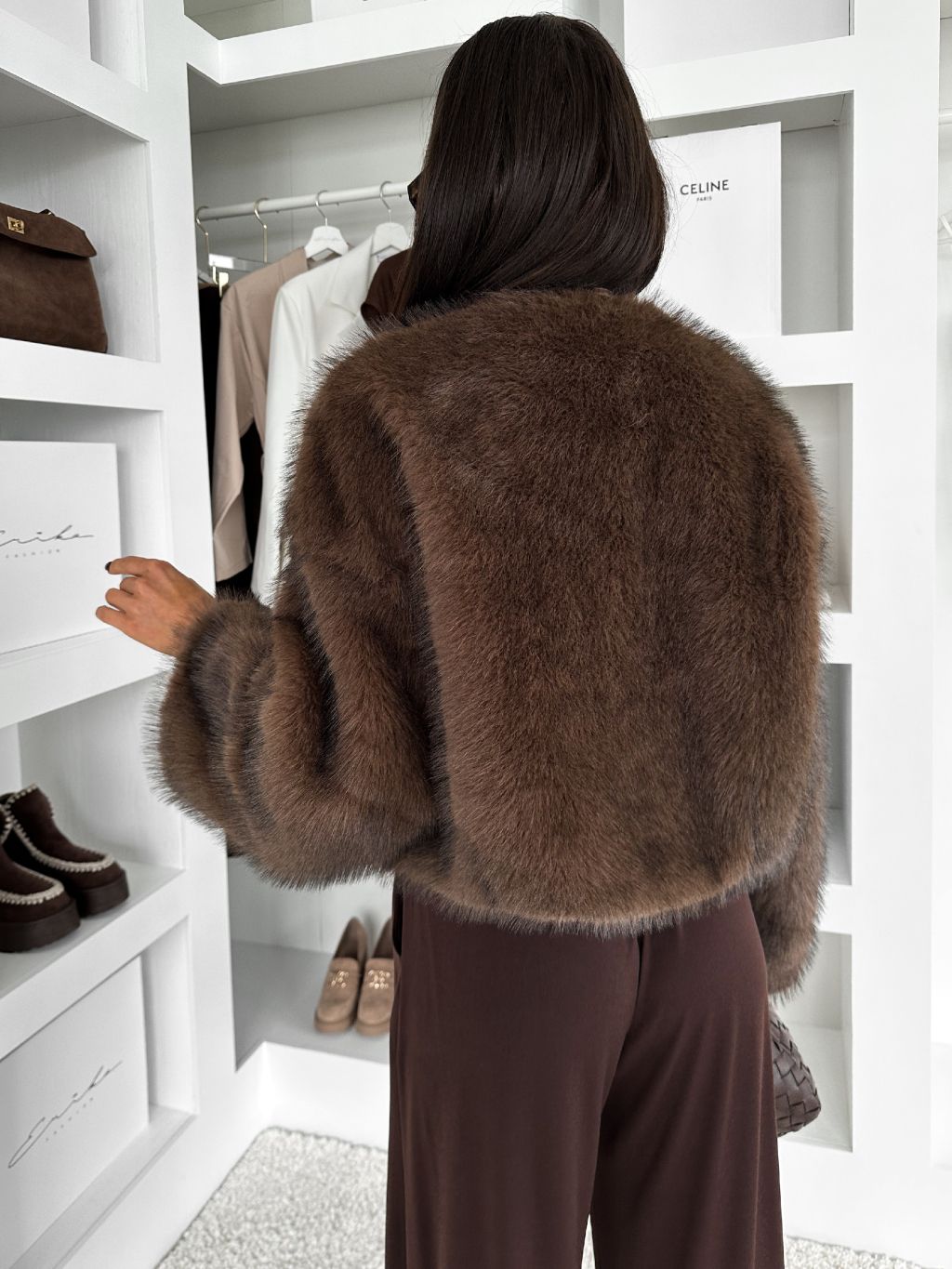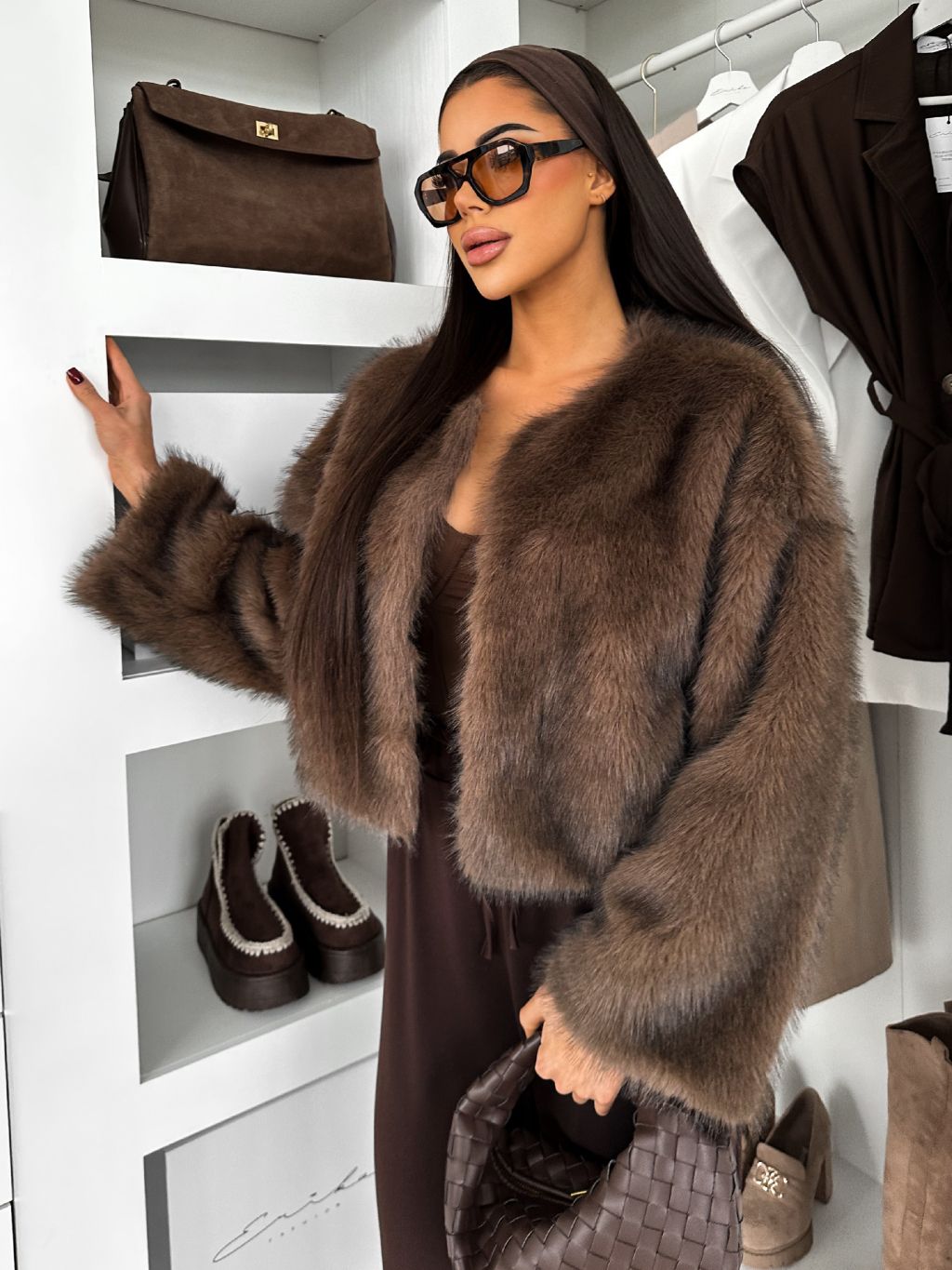 Hnedý štýlový krátky faux fur kožúšok HILDAR