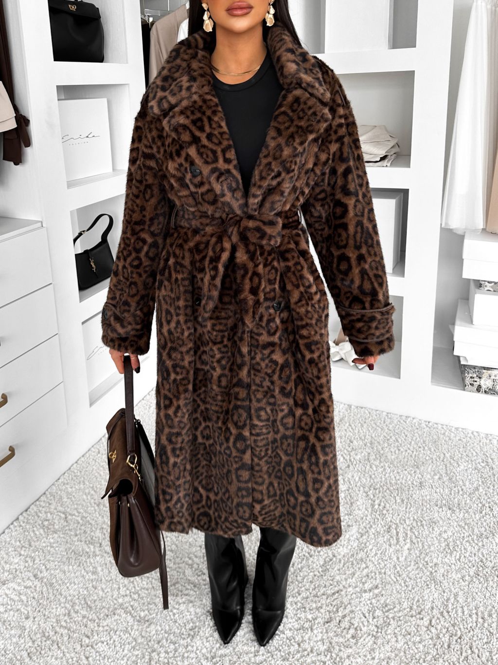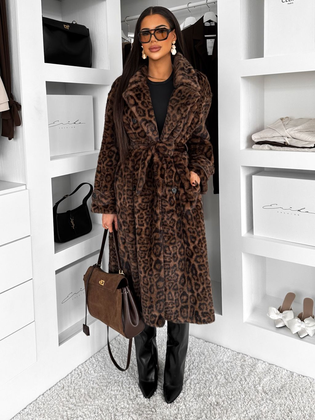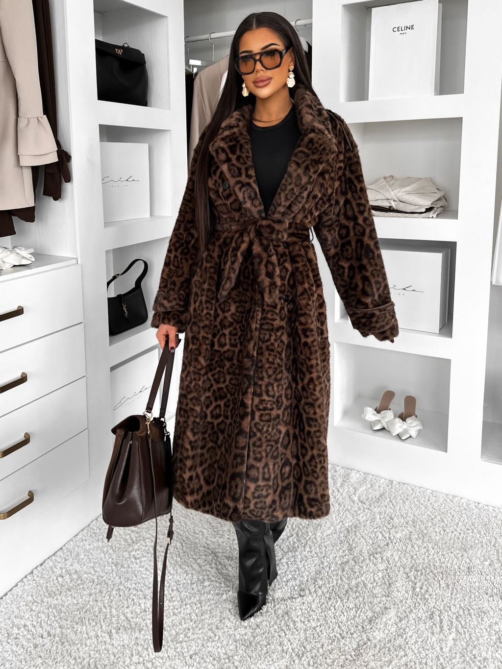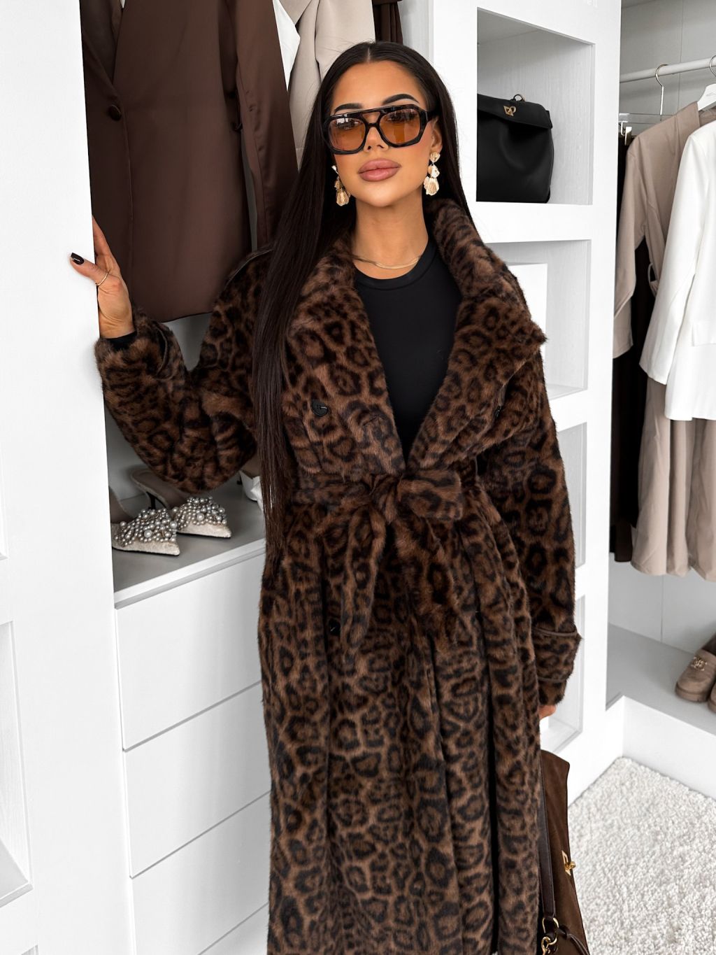 Leopardí dlhý plyšový kabát NOCHO s opaskom a golierom