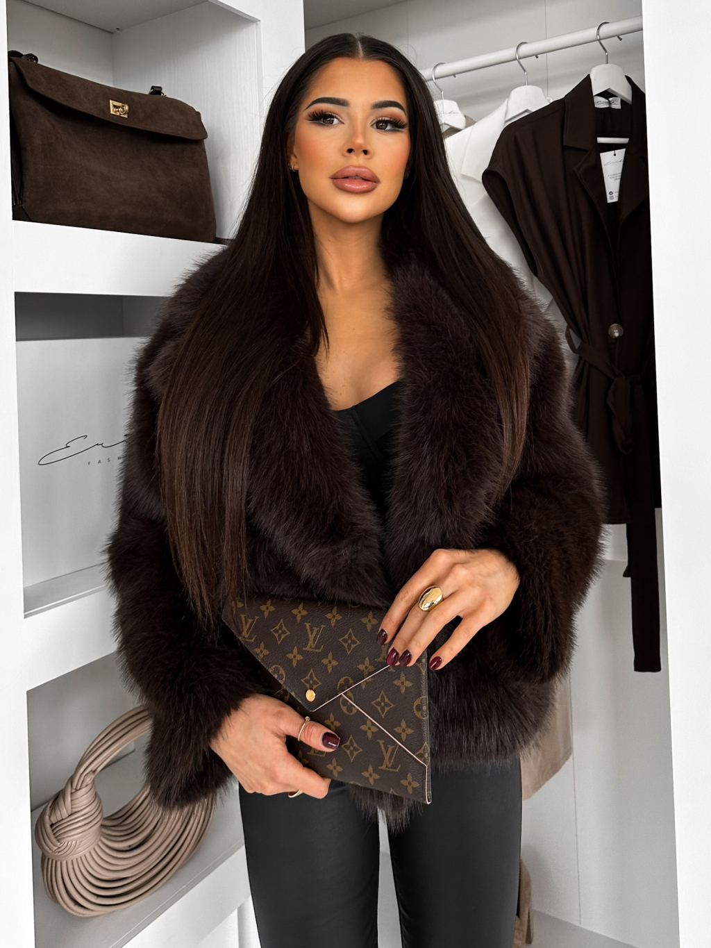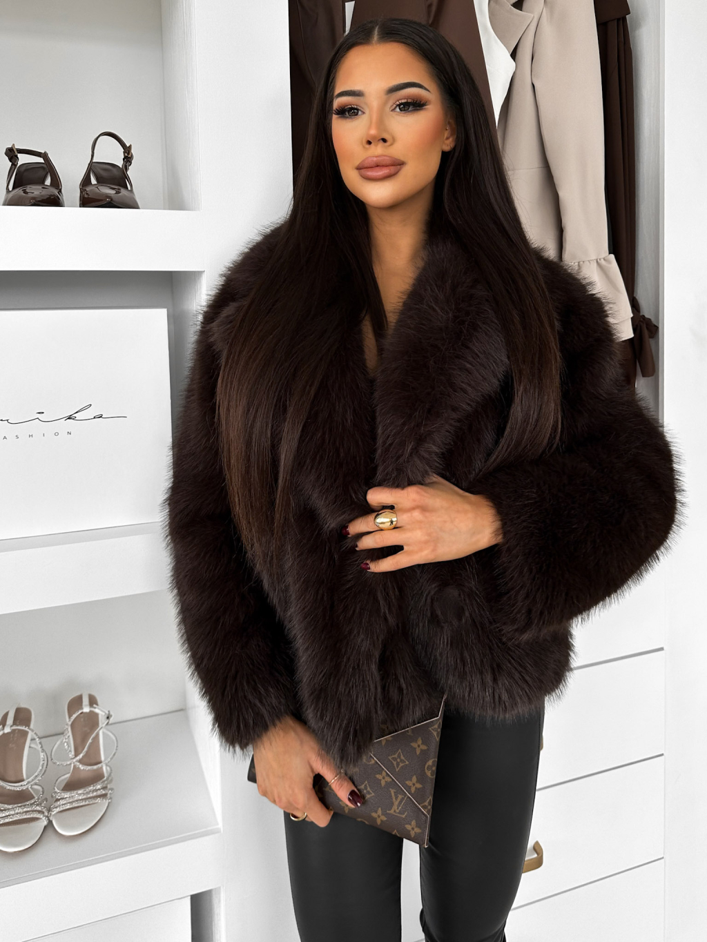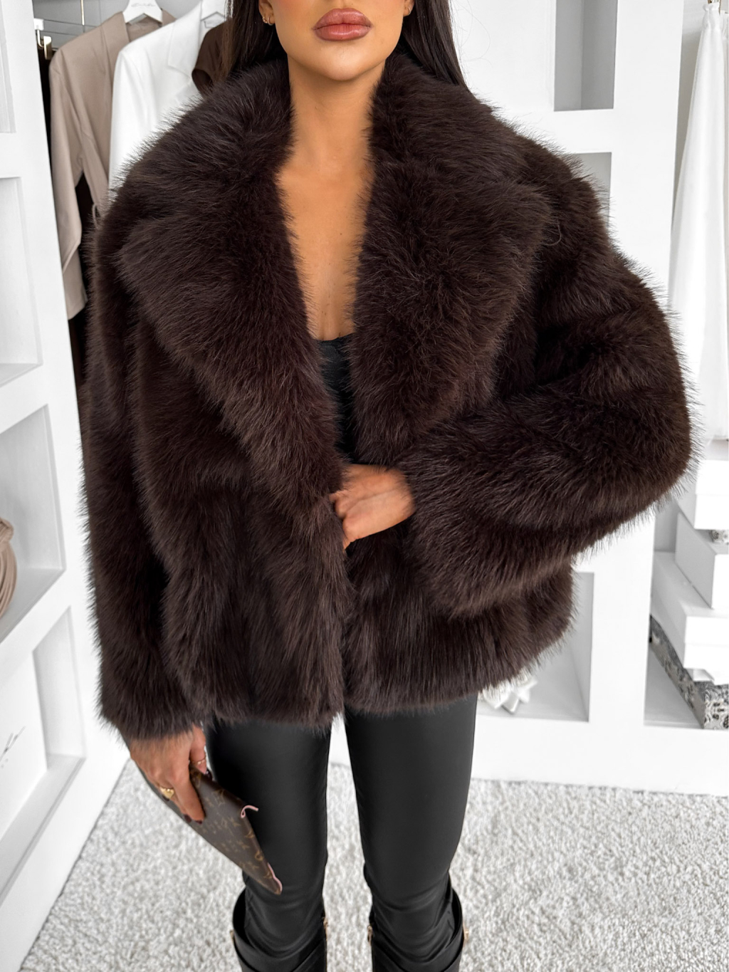 Tmavo hnedý faux fur huňatý kožušinový kabátik MORVEN
