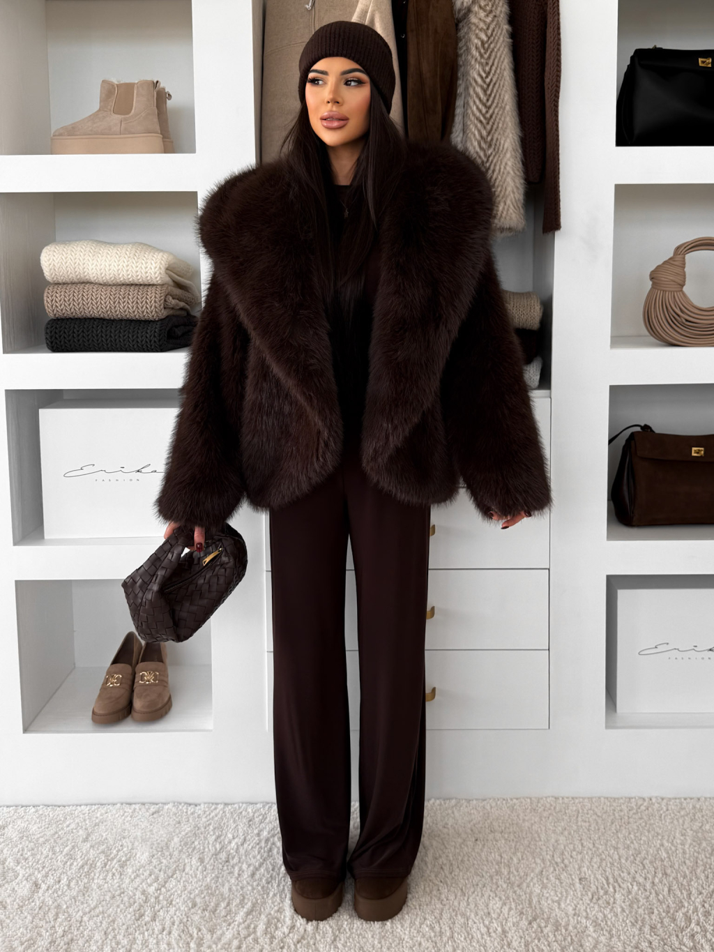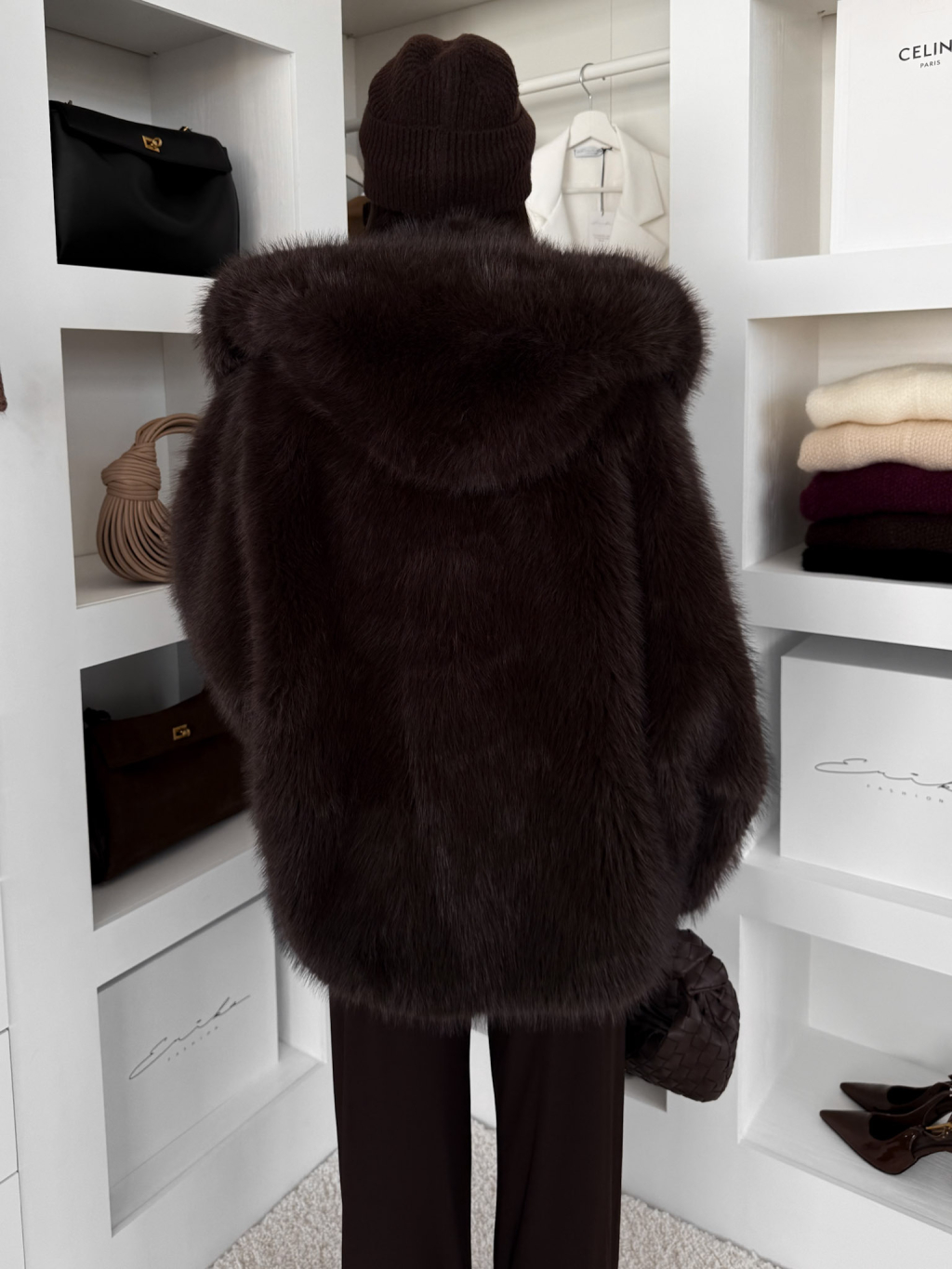 Tmavo hnedý faux fur kožušinový kabátik NOLIERO s kapucňou