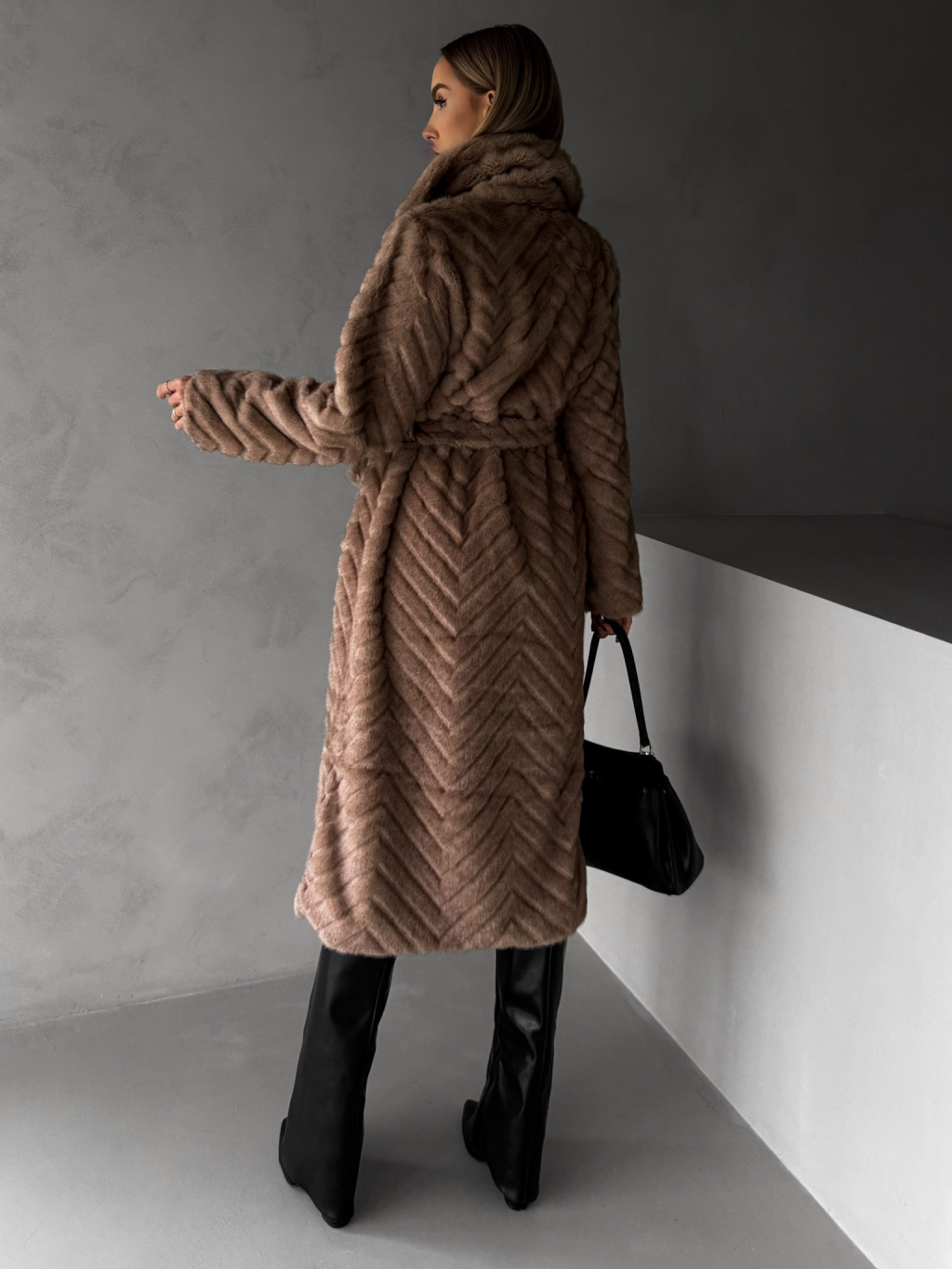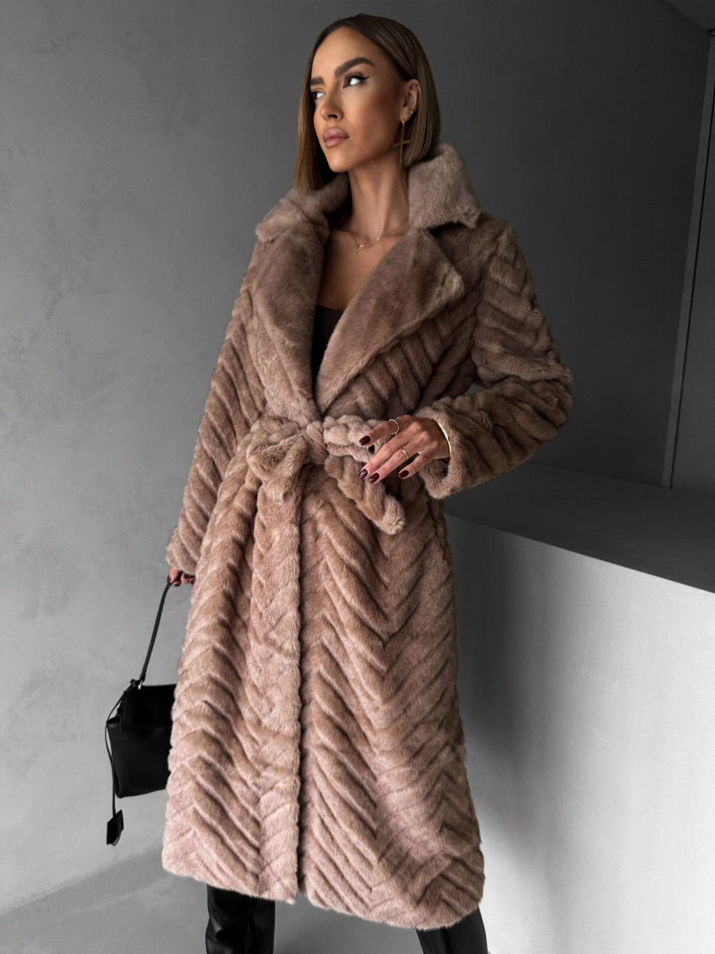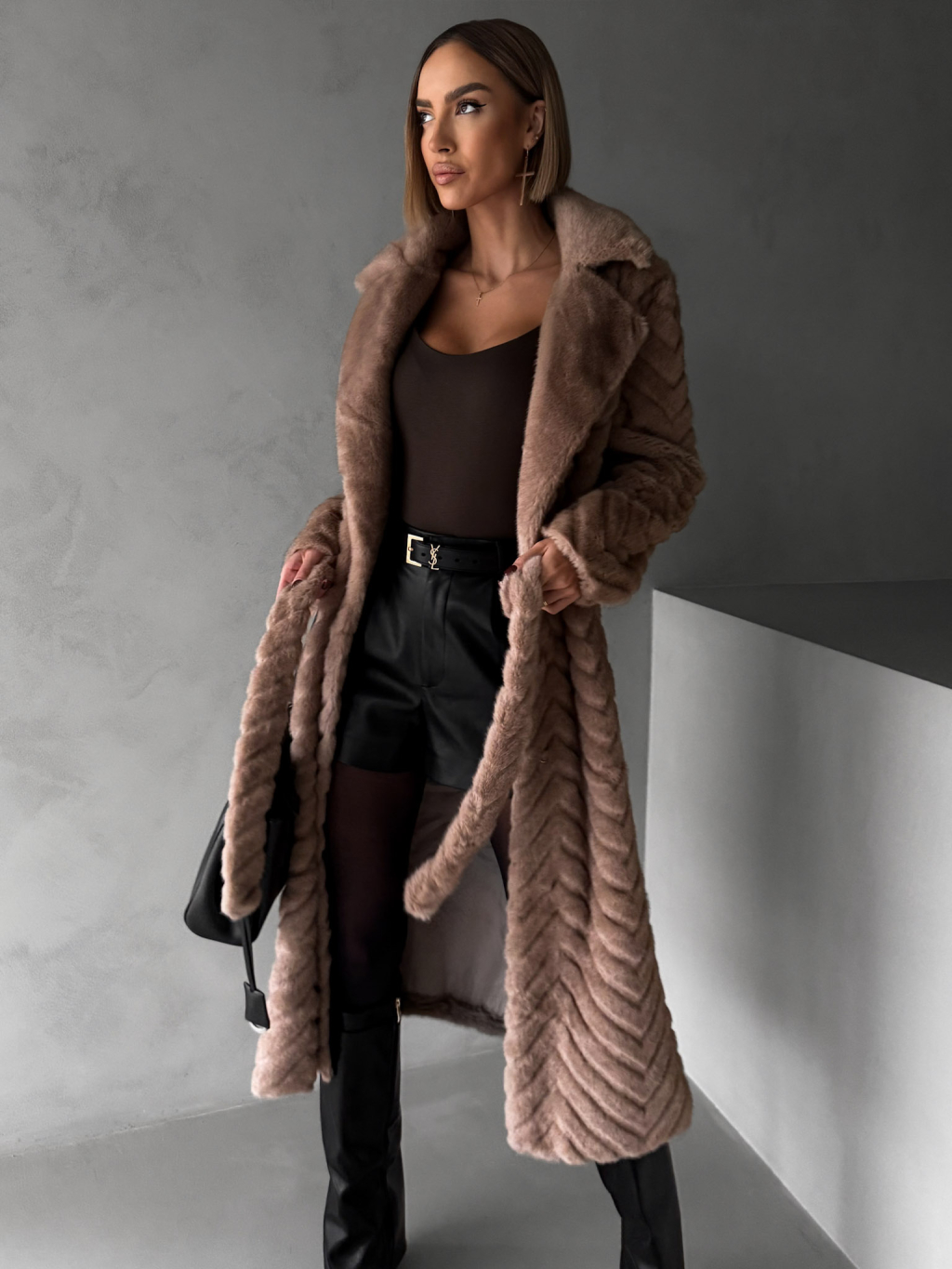 Tmavo hnedý plyšový kožušinový kabát TALAPATO