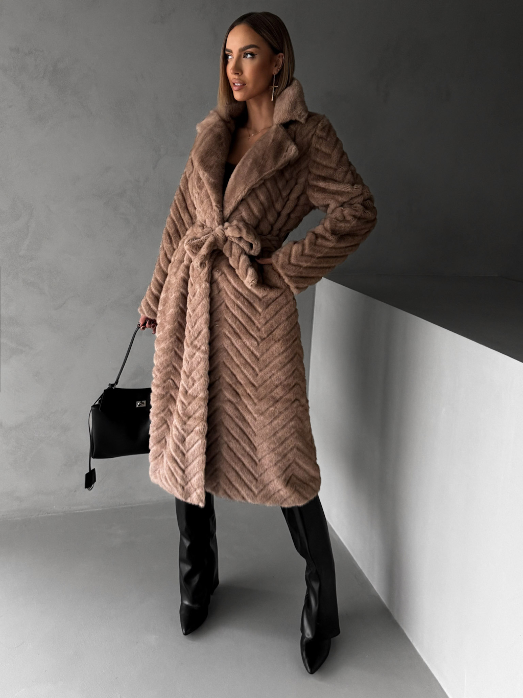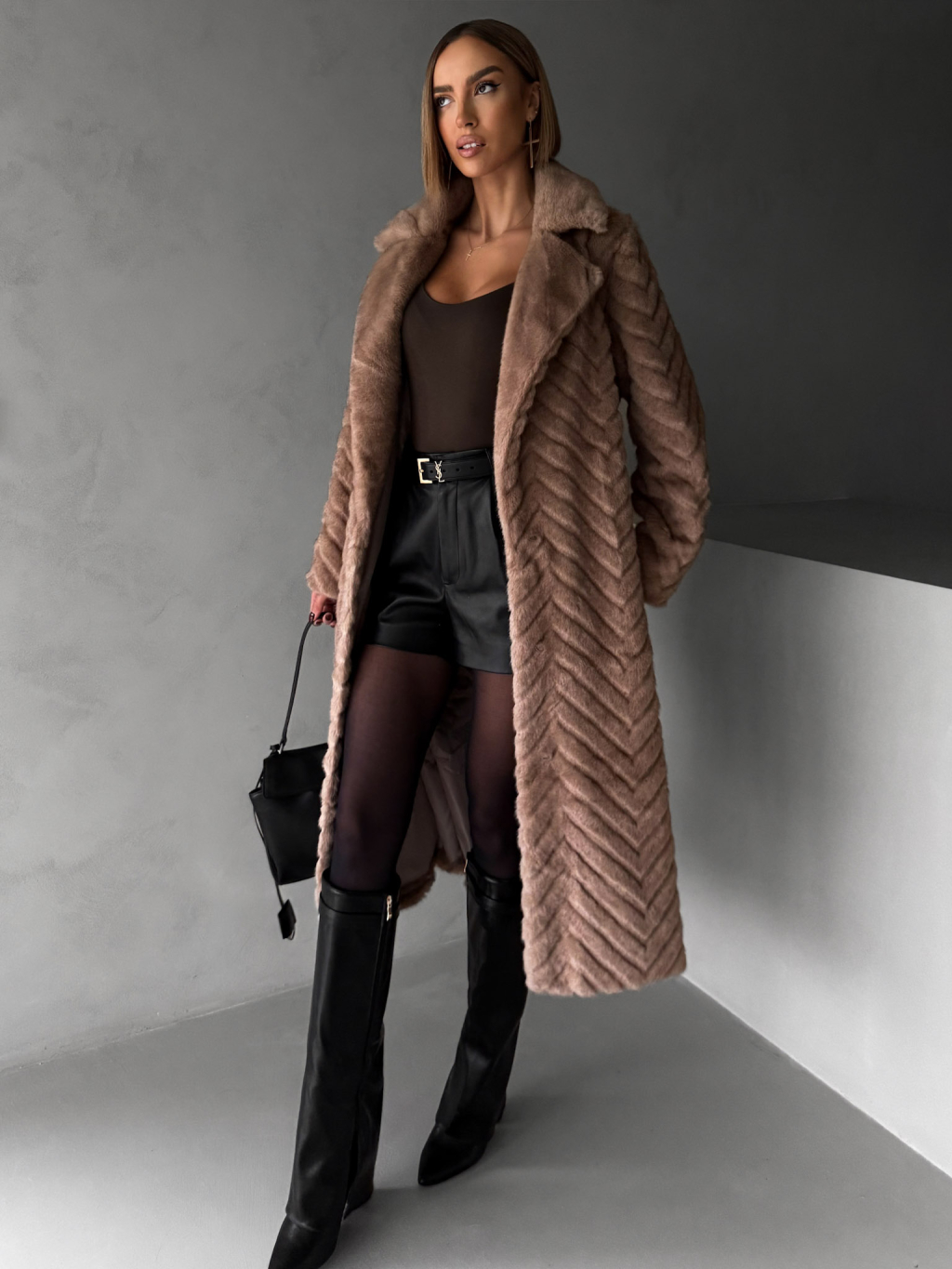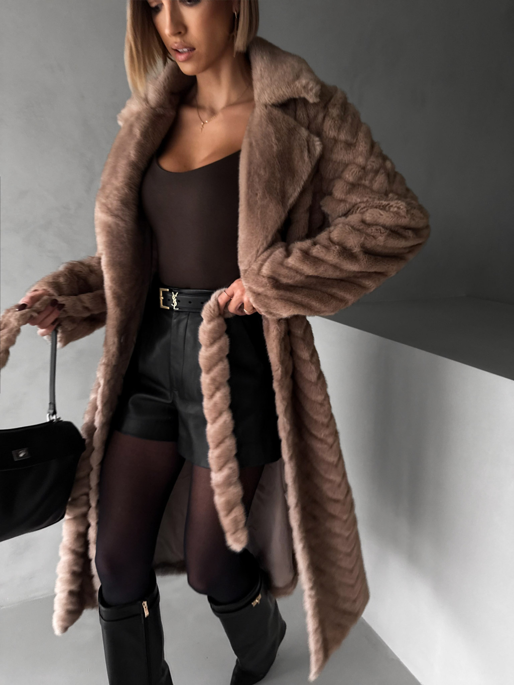 Tmavo hnedý plyšový kožušinový kabát TALAPATO