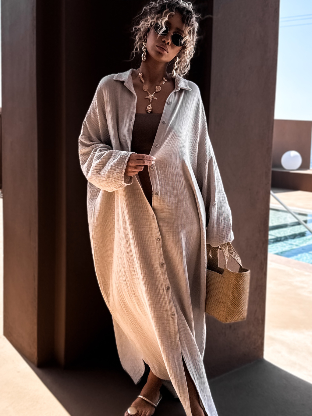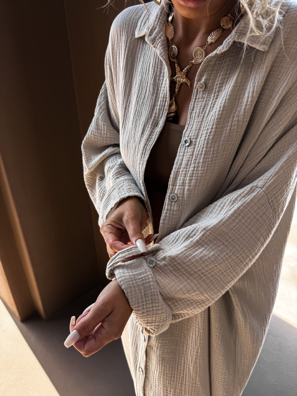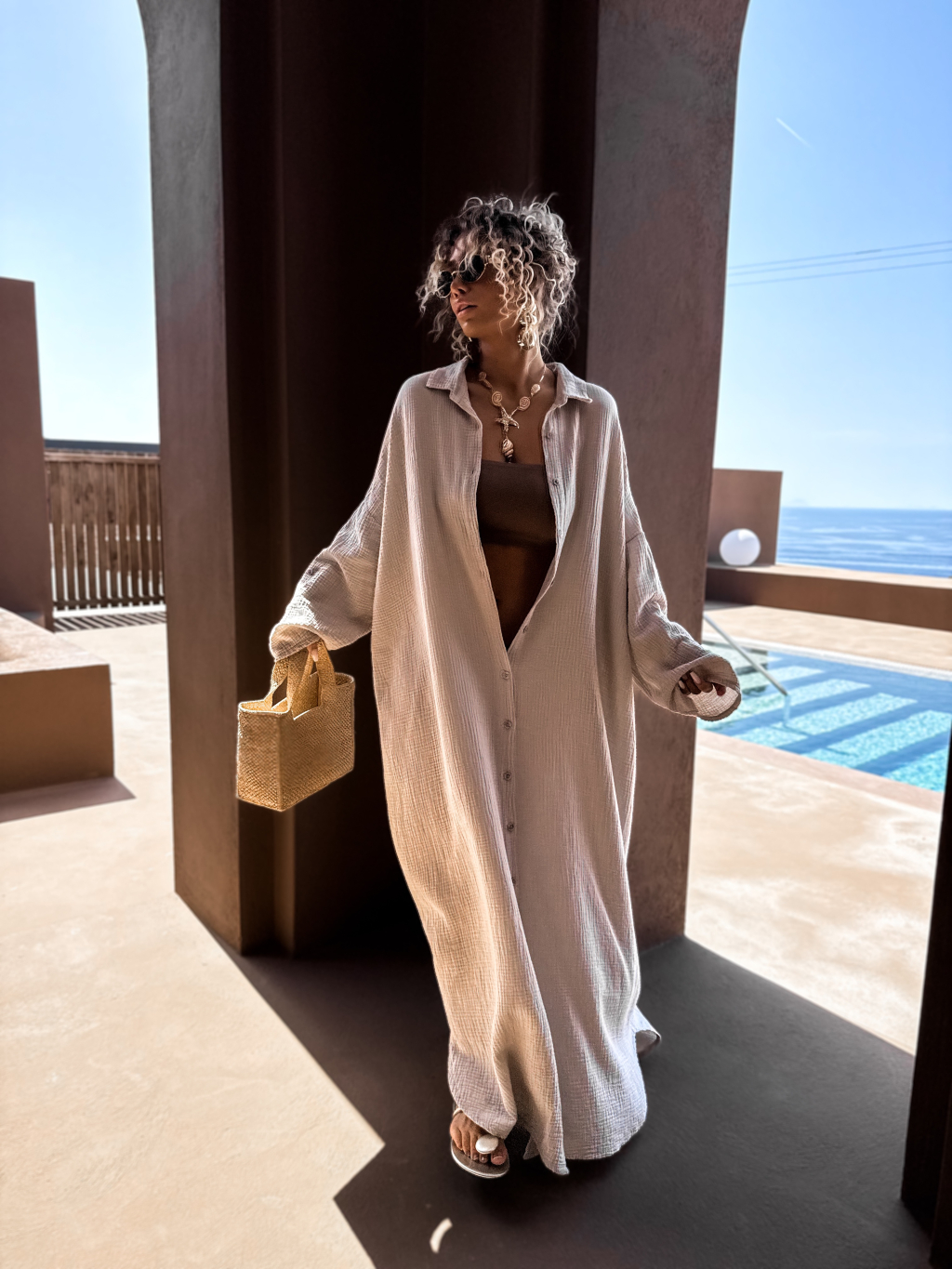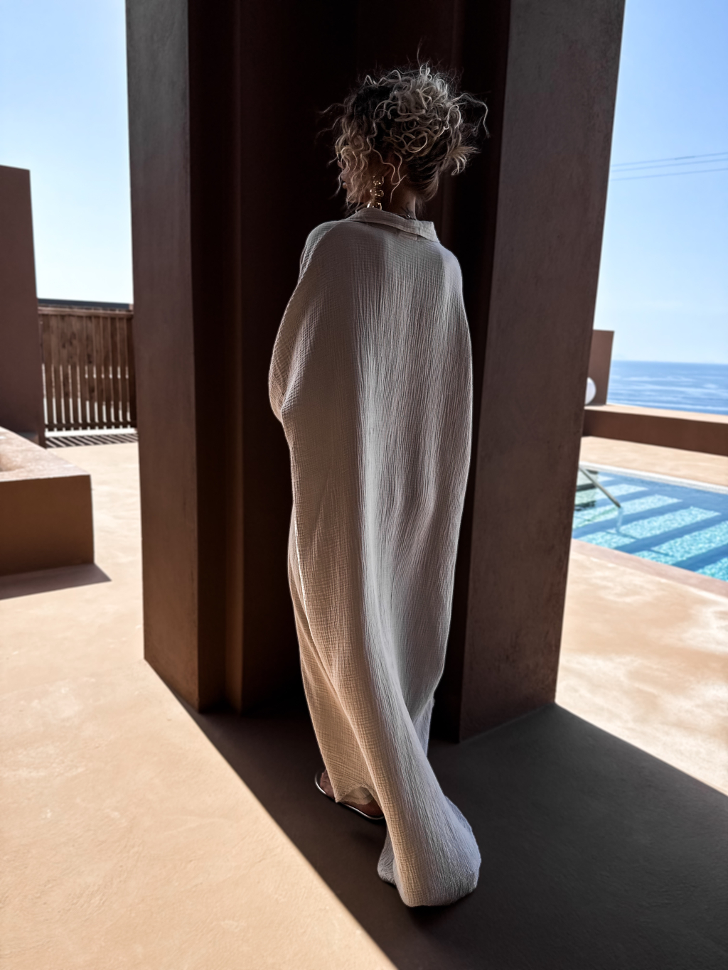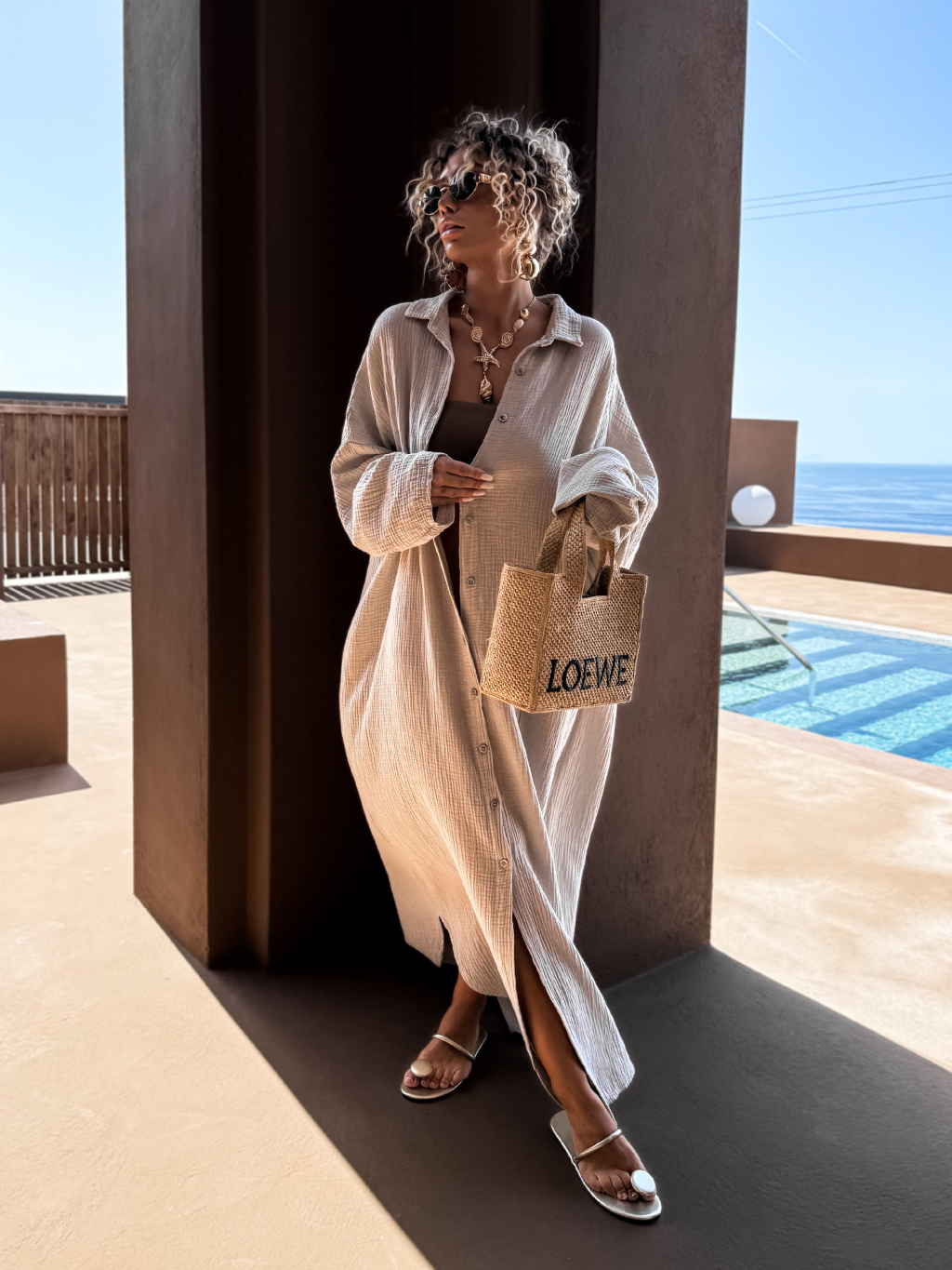 Béžové maxi dlhé mušelínové košeľové šaty EVANES